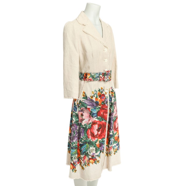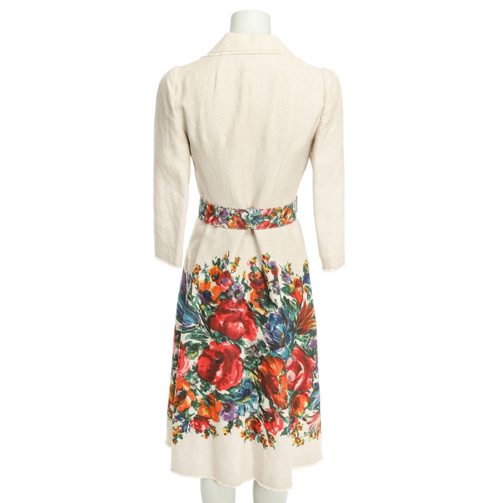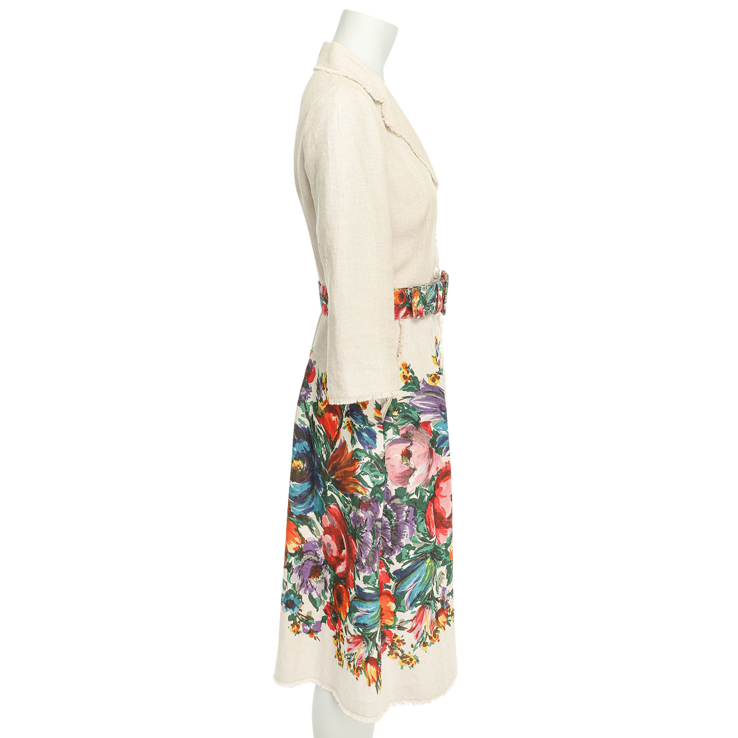 100% Leinen. Naturfarbenes Modell mit floralem Motiv, Knopfverschluss, Abnähern, Reverskragen, Eingrfftaschen und Gürtel anbei. Sehr guter Zustand.