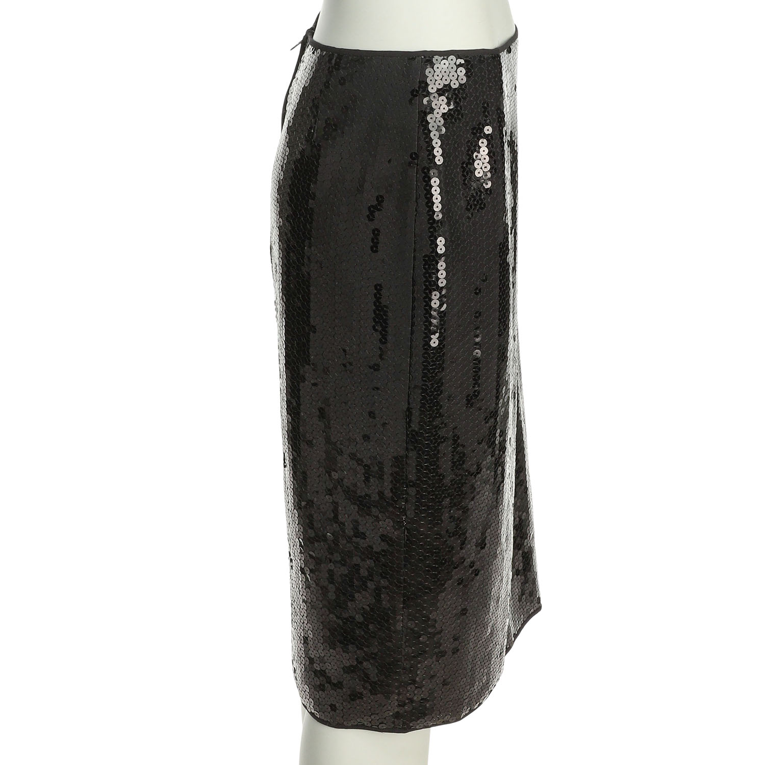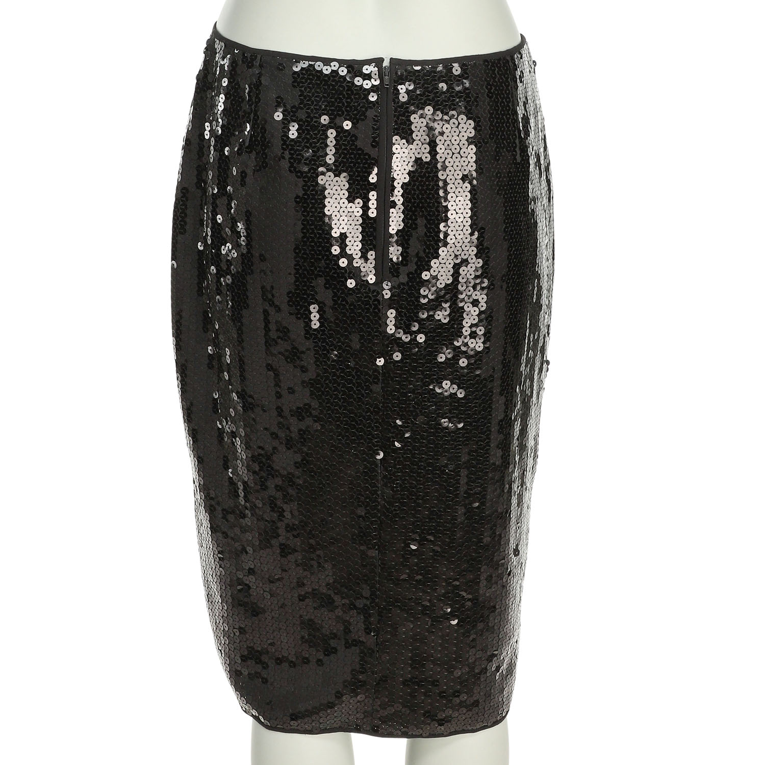 Schwarzes Modell mit all-over Pailettenbesatz und Reißverschluss im Rückteil. Tragespuren vorhanden.
