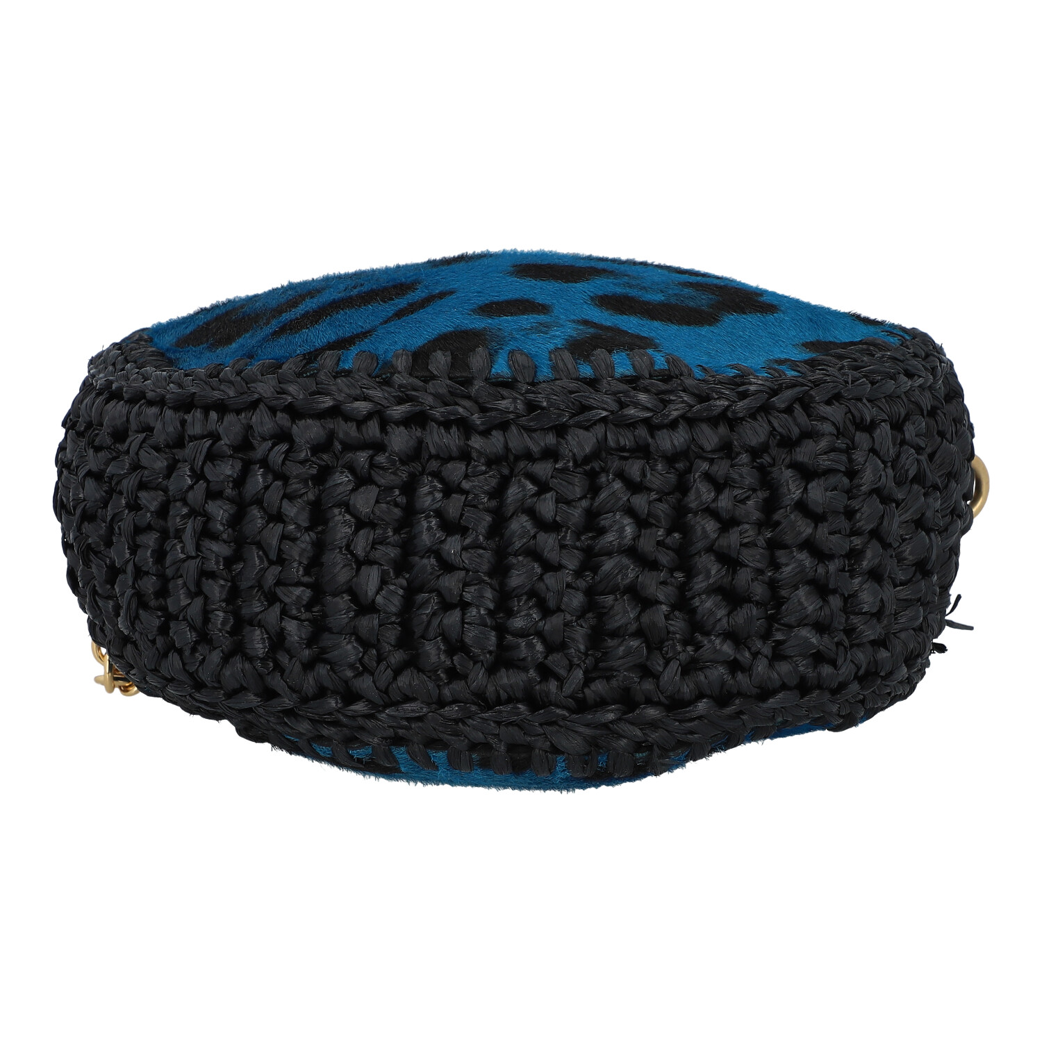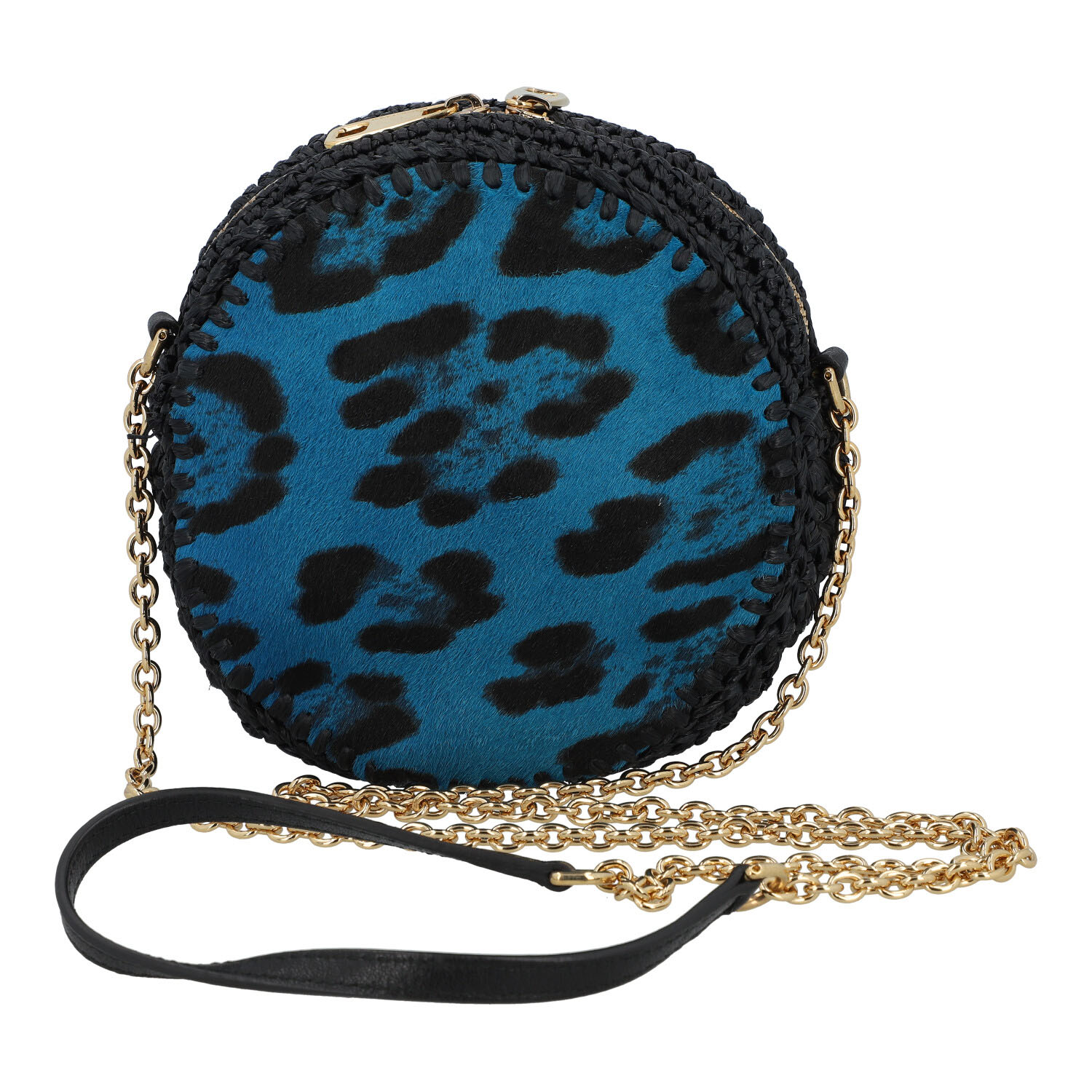 Blaues Ponyfell mit Leodesign, Seiten aus schwarzem Bast, goldfarbener Hardware, Reißverschluss und Kettenriemen. Innenraum aus Textil in Schwarz mit einem Fach. Guter Zustand. 15,5 x 7 x 15,5 cm.