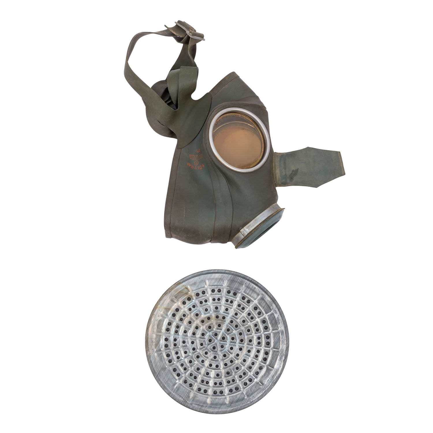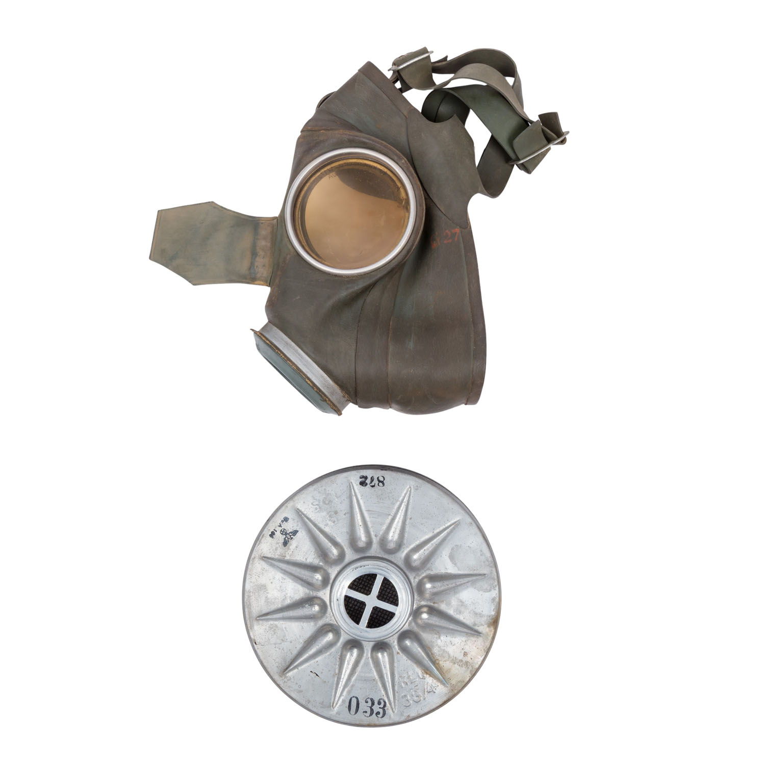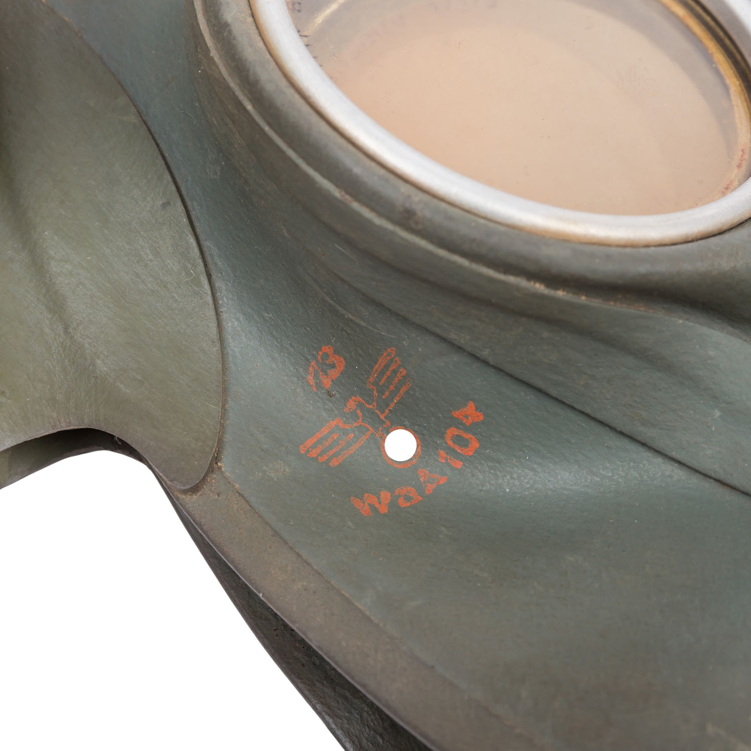 im Originalkarton. Grüne Gasmaske aus Kautschuk. Am Äußeren der Maske der Reichsadler aufgestempelt. Aluminiumfilter mit Drehverschluss, hier gestempelt: '033 / der Reichsadler / 872' sowie eingestanzt:: 'RL1 // 38/4' sowie '5 // 125'. Auf dem Karton ist eingestanzt: 'VM // F // RL 1-39/86 // Vertrieb gemäß § 8 // Luftschutzgesetz genehmigt'. Maße Karton (HxBxT): ca. 7 x 29,5 x 20,5 cm. Mit Alters- und Gebrauchsspuren.