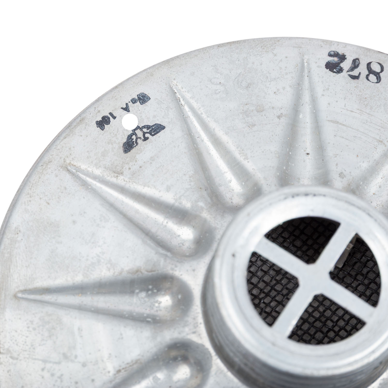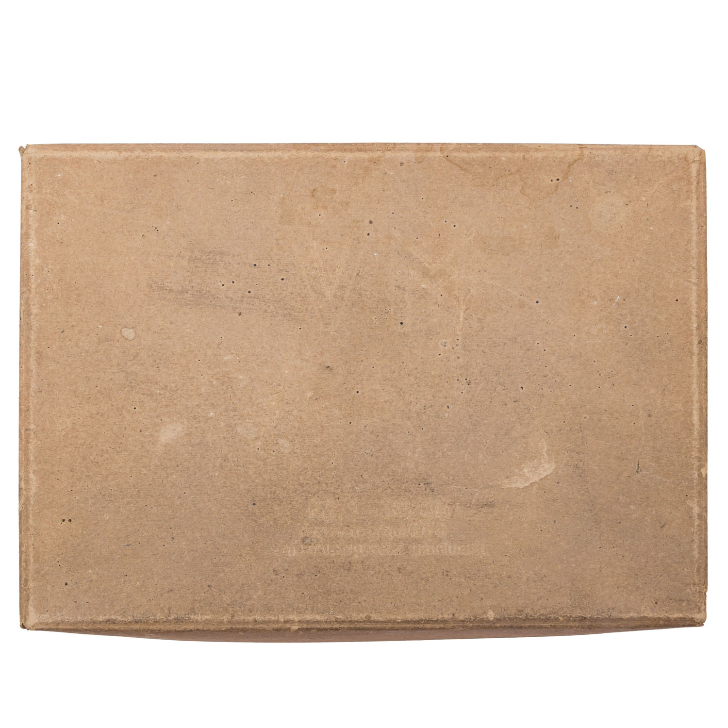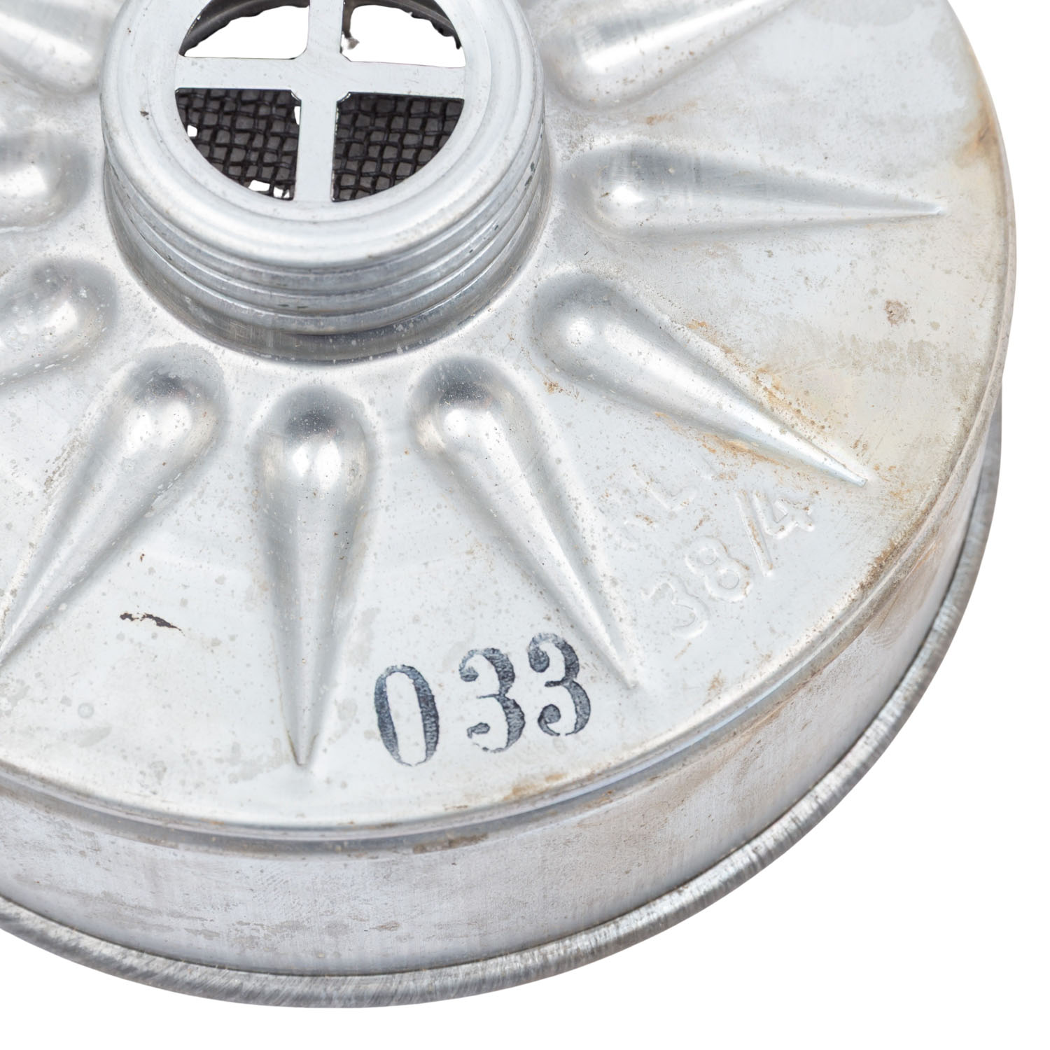 im Originalkarton. Grüne Gasmaske aus Kautschuk. Am Äußeren der Maske der Reichsadler aufgestempelt. Aluminiumfilter mit Drehverschluss, hier gestempelt: '033 / der Reichsadler / 872' sowie eingestanzt:: 'RL1 // 38/4' sowie '5 // 125'. Auf dem Karton ist eingestanzt: 'VM // F // RL 1-39/86 // Vertrieb gemäß § 8 // Luftschutzgesetz genehmigt'. Maße Karton (HxBxT): ca. 7 x 29,5 x 20,5 cm. Mit Alters- und Gebrauchsspuren.