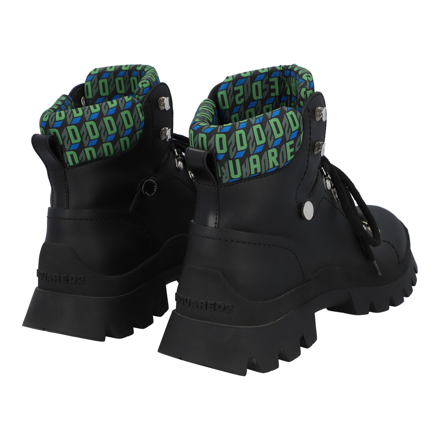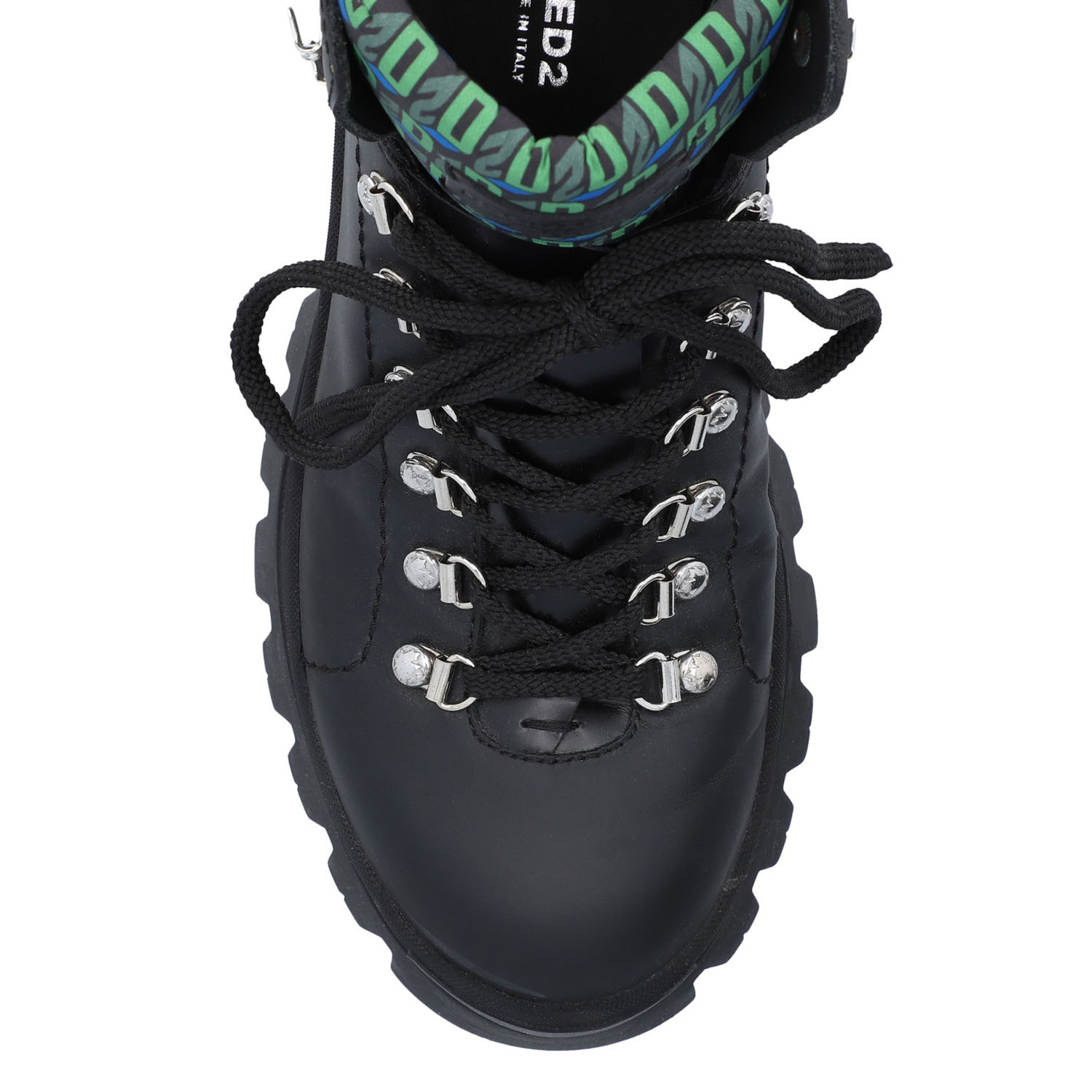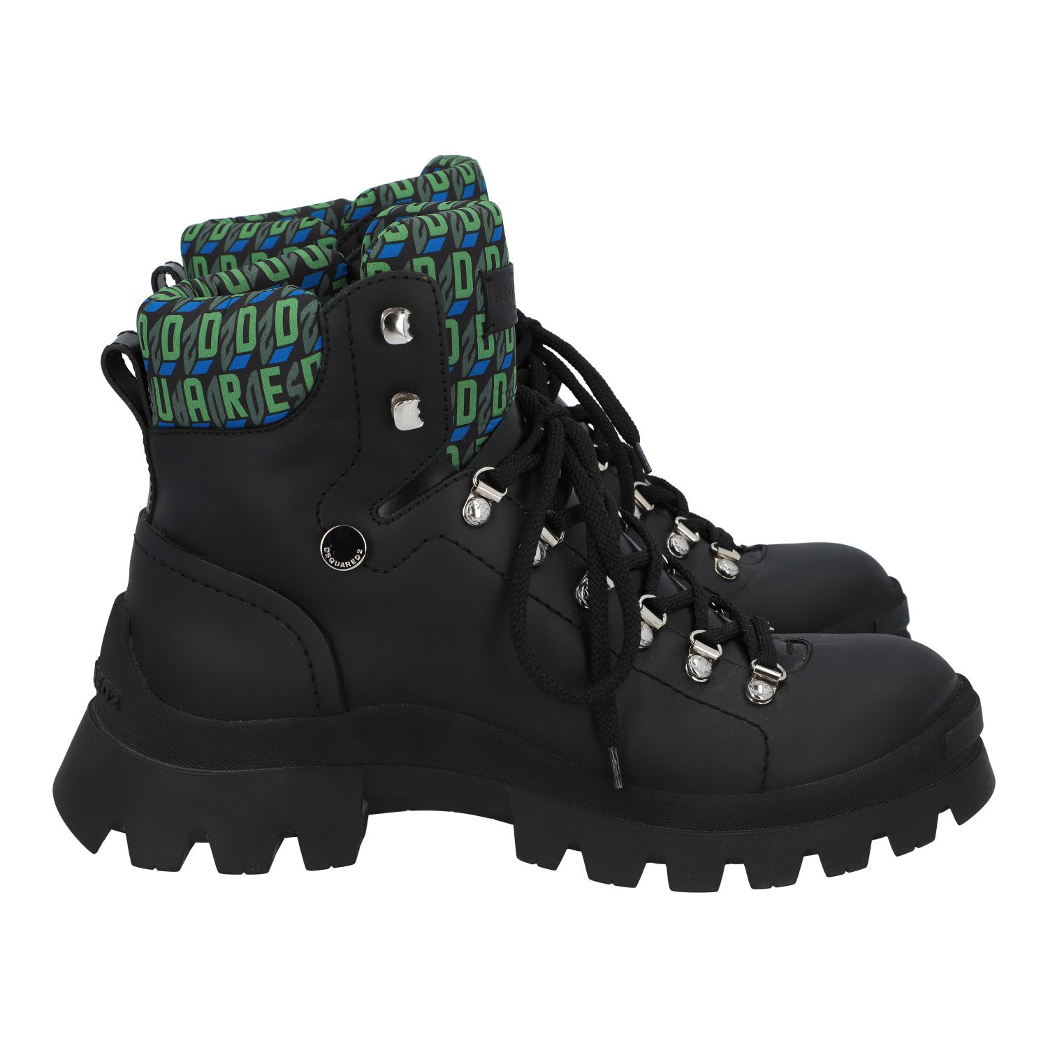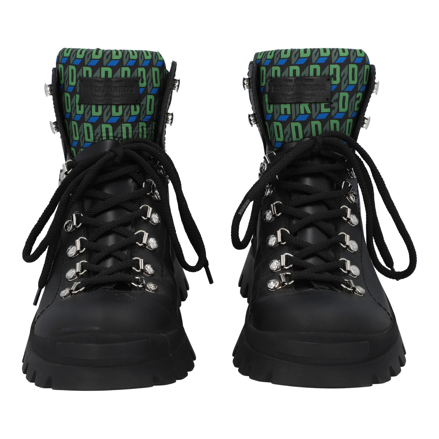 Schwarzes Modell mit silberfarbener Hardware, Schnürung und dekorativer oberen Kante. Tragespuren vorhanden.