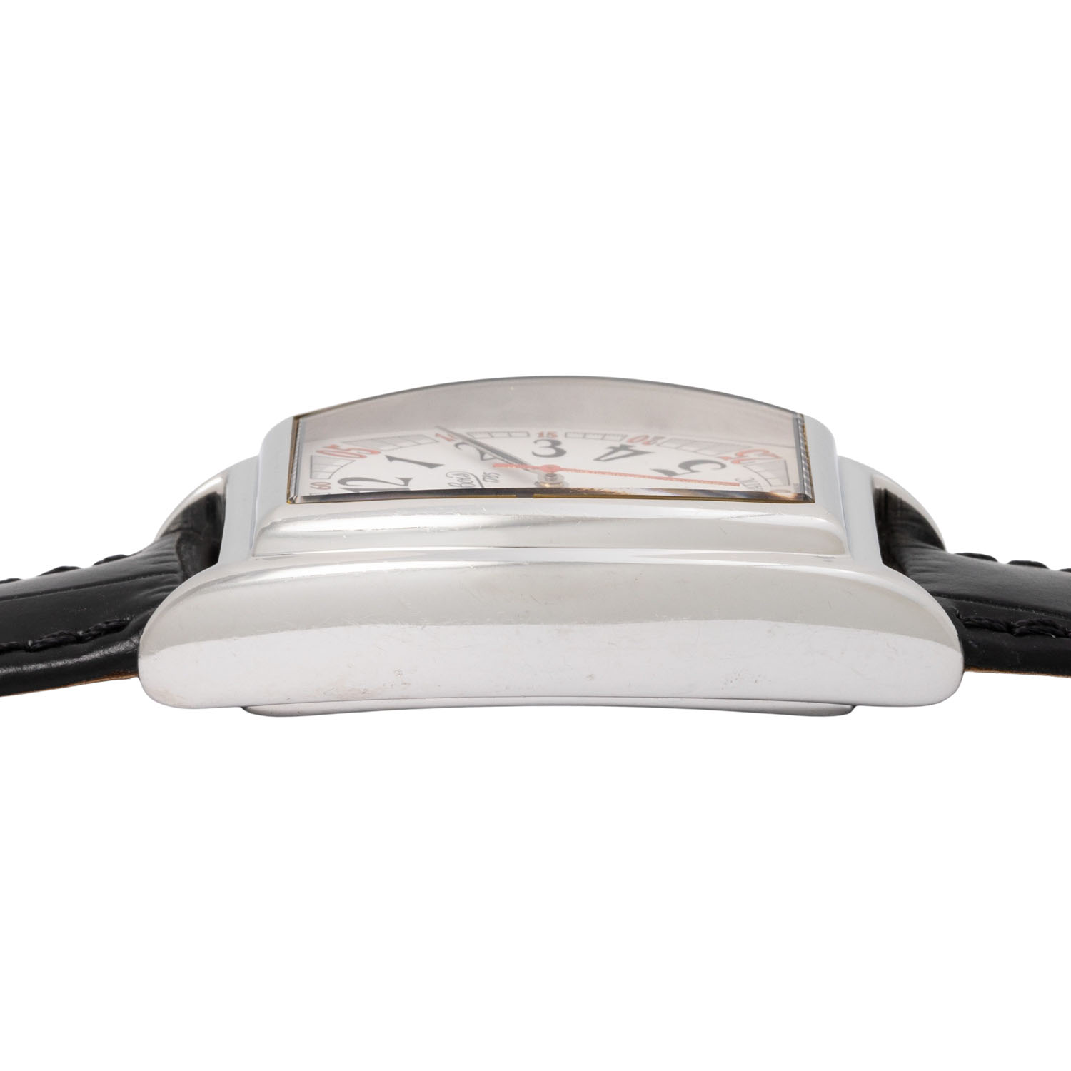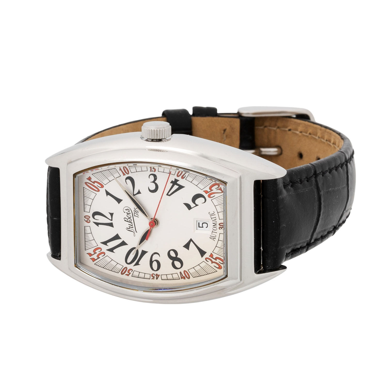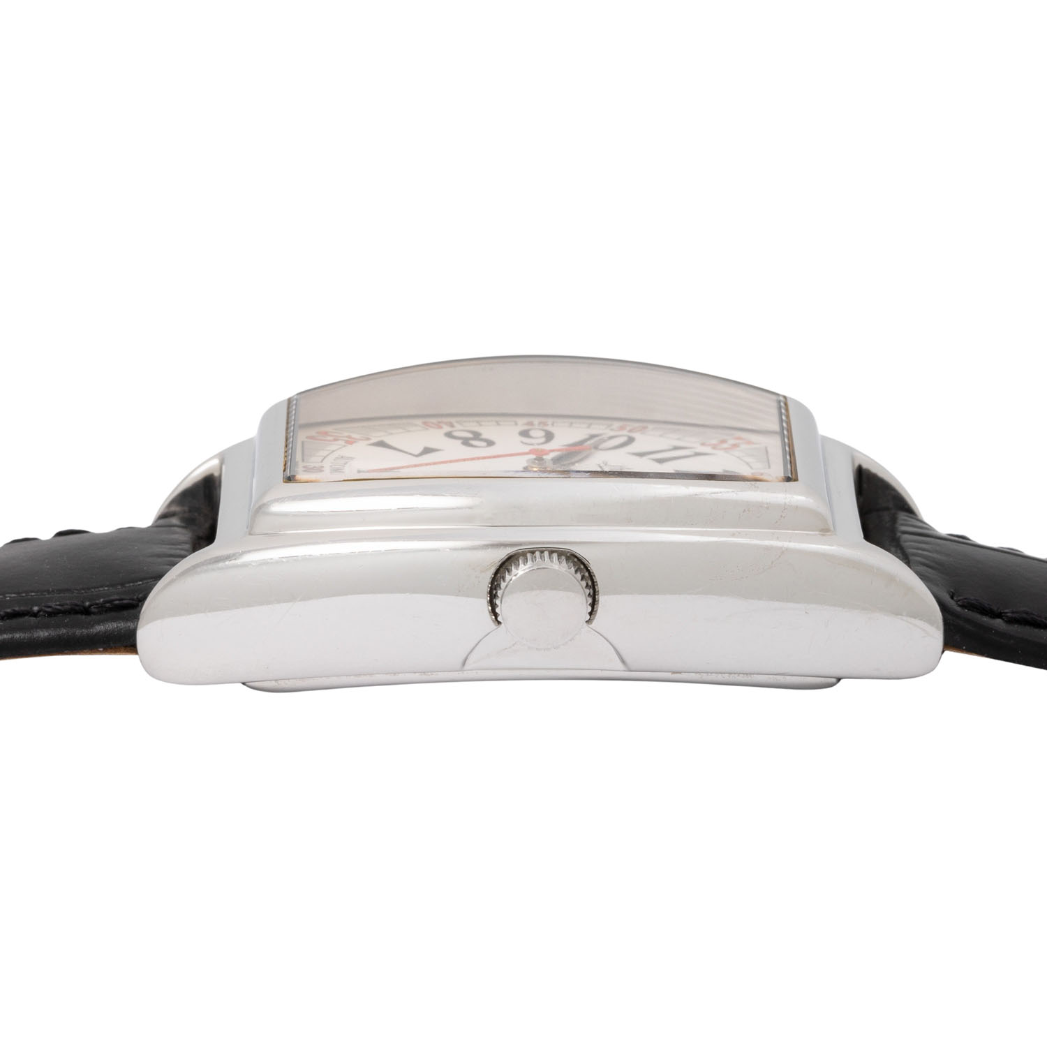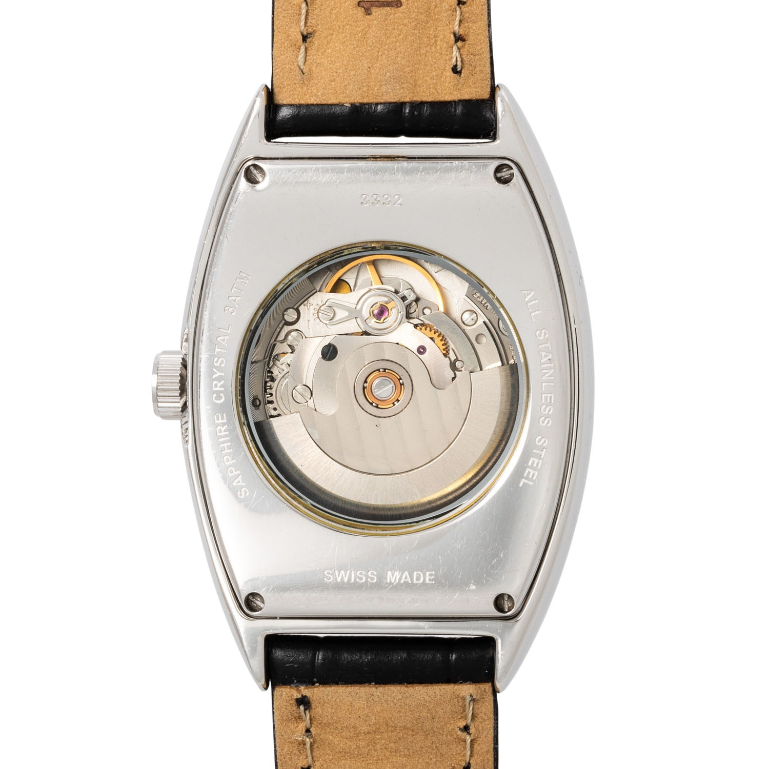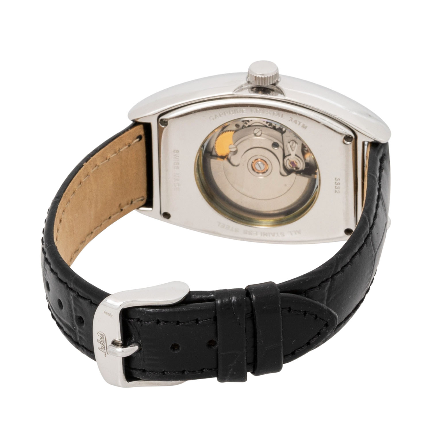Edelostahl. Glasboden. Automatik-Werk Kal. ETA 2824-2 mit sehr guten Gangwerten (0s/d. 280°). Zifferblatt mit römischen Indizes und Datumsanzeige. Neues Lederband mit Dubois Dornschließe. Guter Zustand mit sichtbaren Tragespuren am Gehäuse und der Schließe. Durchmesser ca. 35 mm (gemessen ohne Krone).