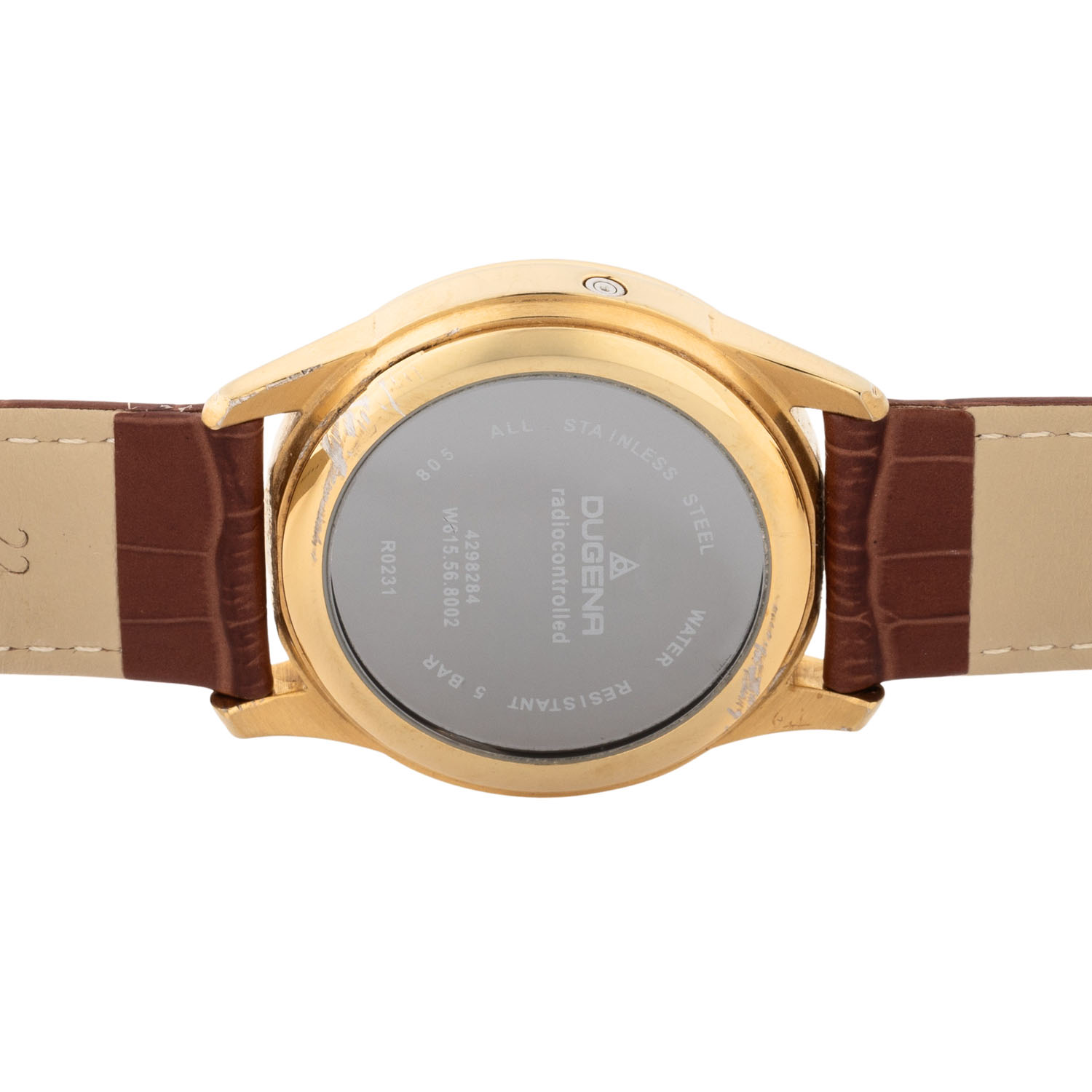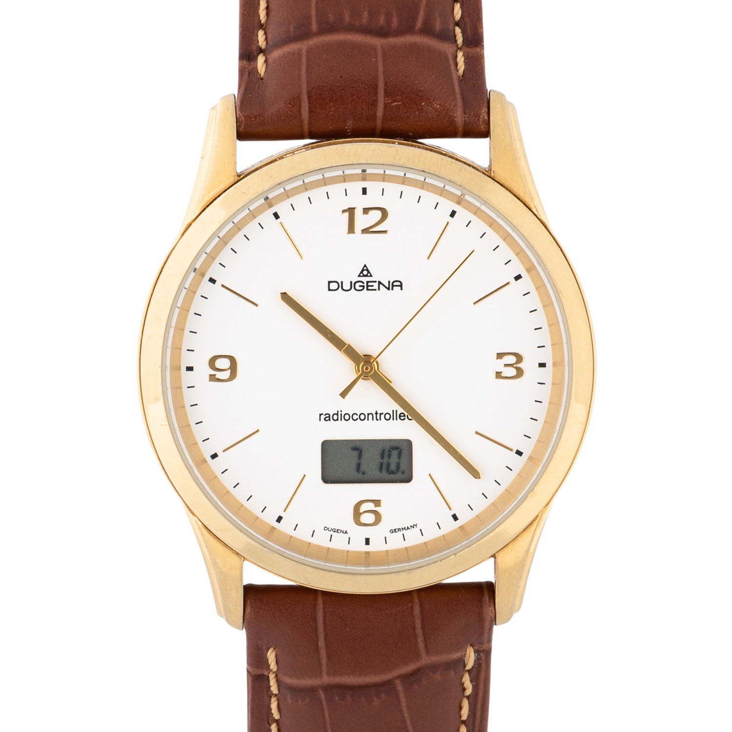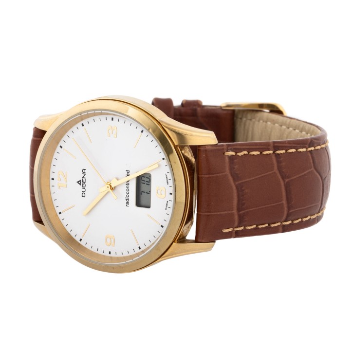 Edelstahl vergoldet. Funkuhrwerk Kal. W615.56.8002 mit neuer Batterie. Weißes Zifferblatt mit arabsichen Ziffern und Stabindizes, digitale Datumsanzeige. Braunes Lederarmband mit vergoldeter Dornschließe. Guter Zustand, leichte Tragespuren. Durchmesser ca. 40 mm.