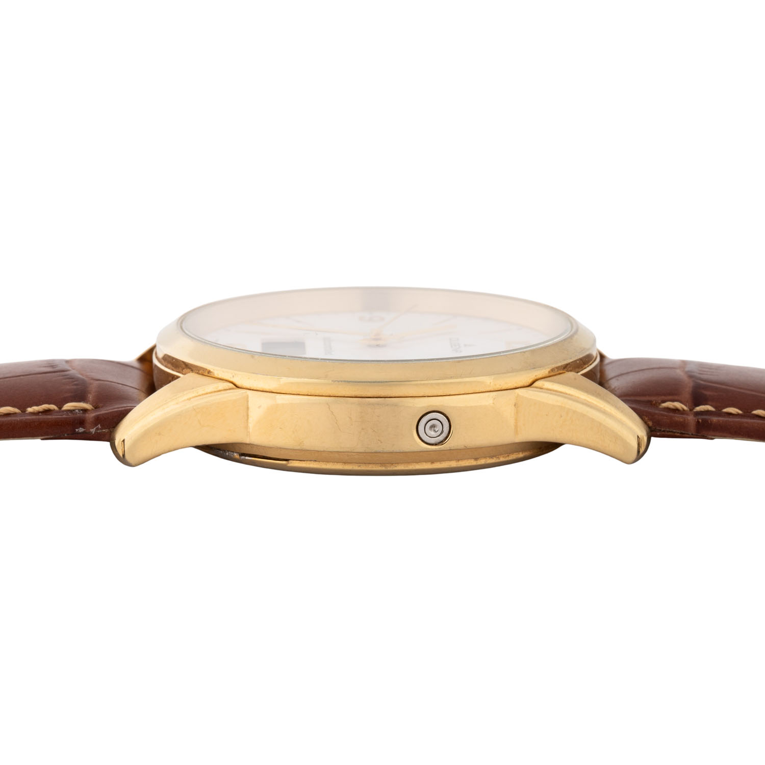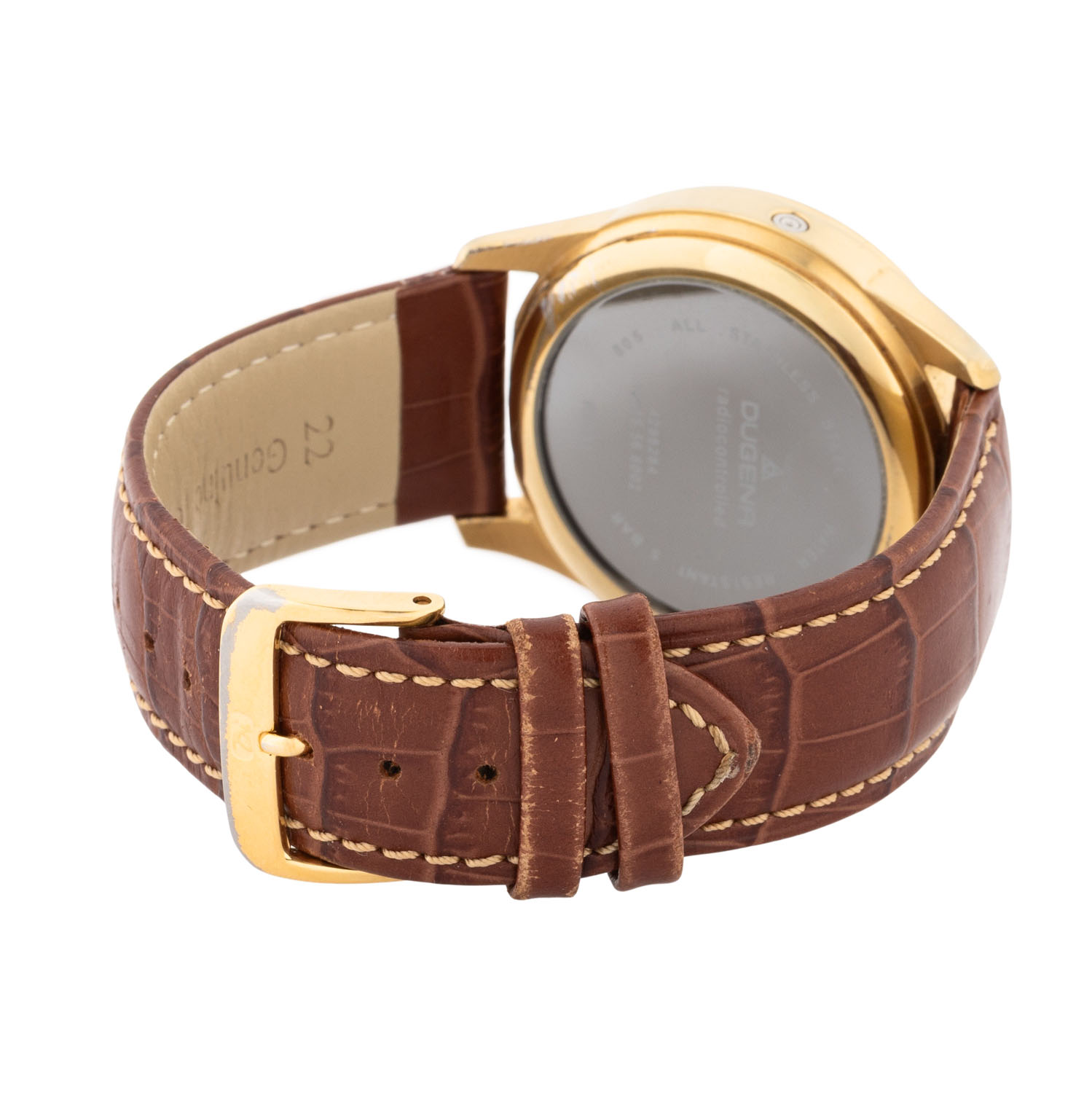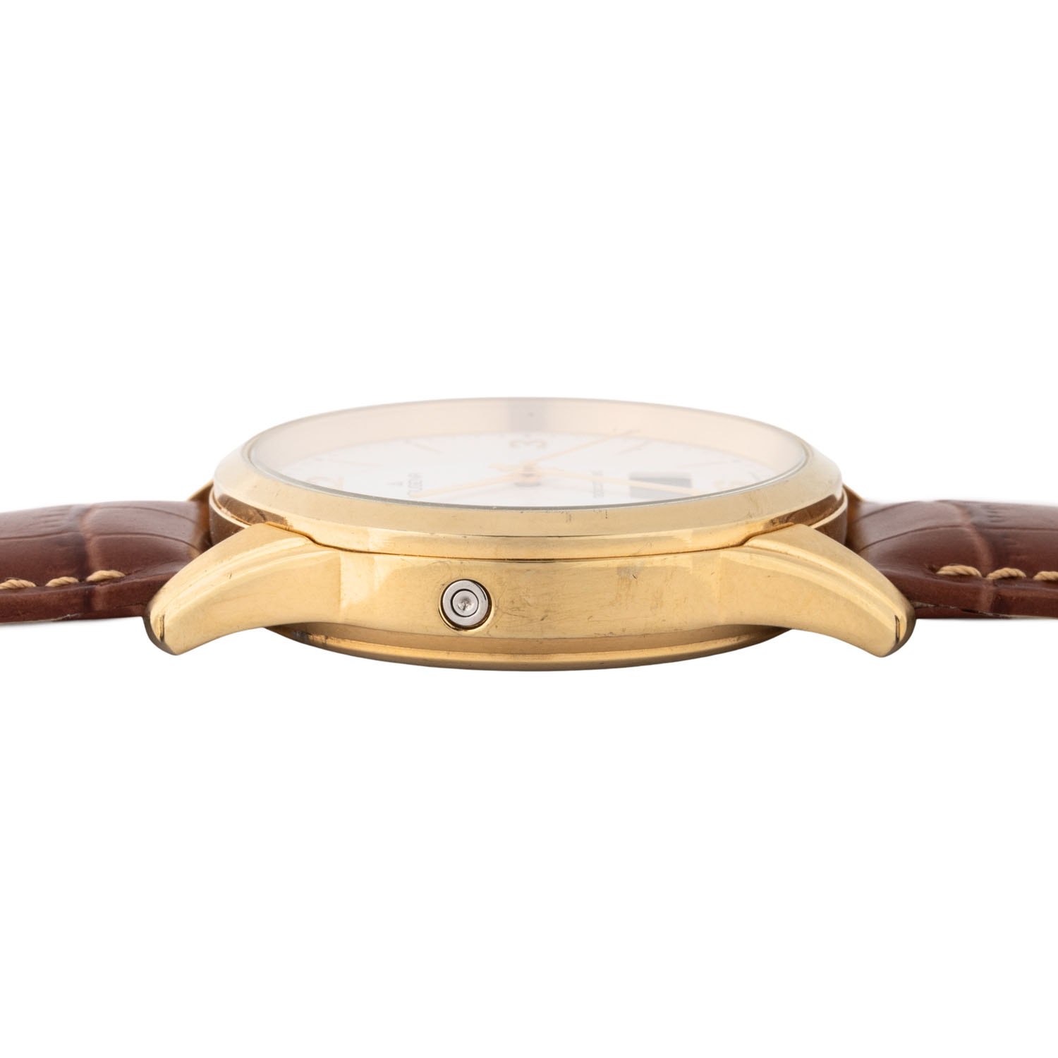 Edelstahl vergoldet. Funkuhrwerk Kal. W615.56.8002 mit neuer Batterie. Weißes Zifferblatt mit arabsichen Ziffern und Stabindizes, digitale Datumsanzeige. Braunes Lederarmband mit vergoldeter Dornschließe. Guter Zustand, leichte Tragespuren. Durchmesser ca. 40 mm.