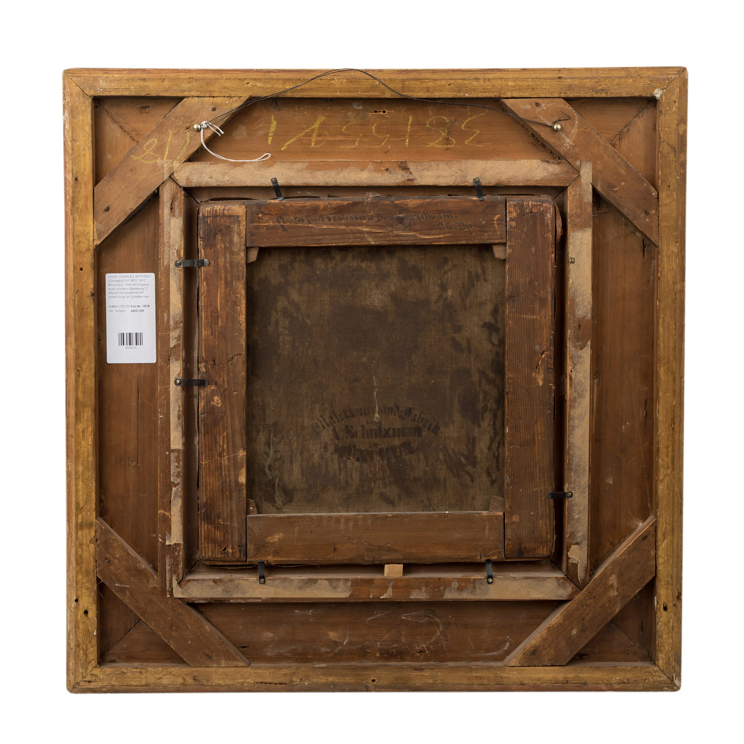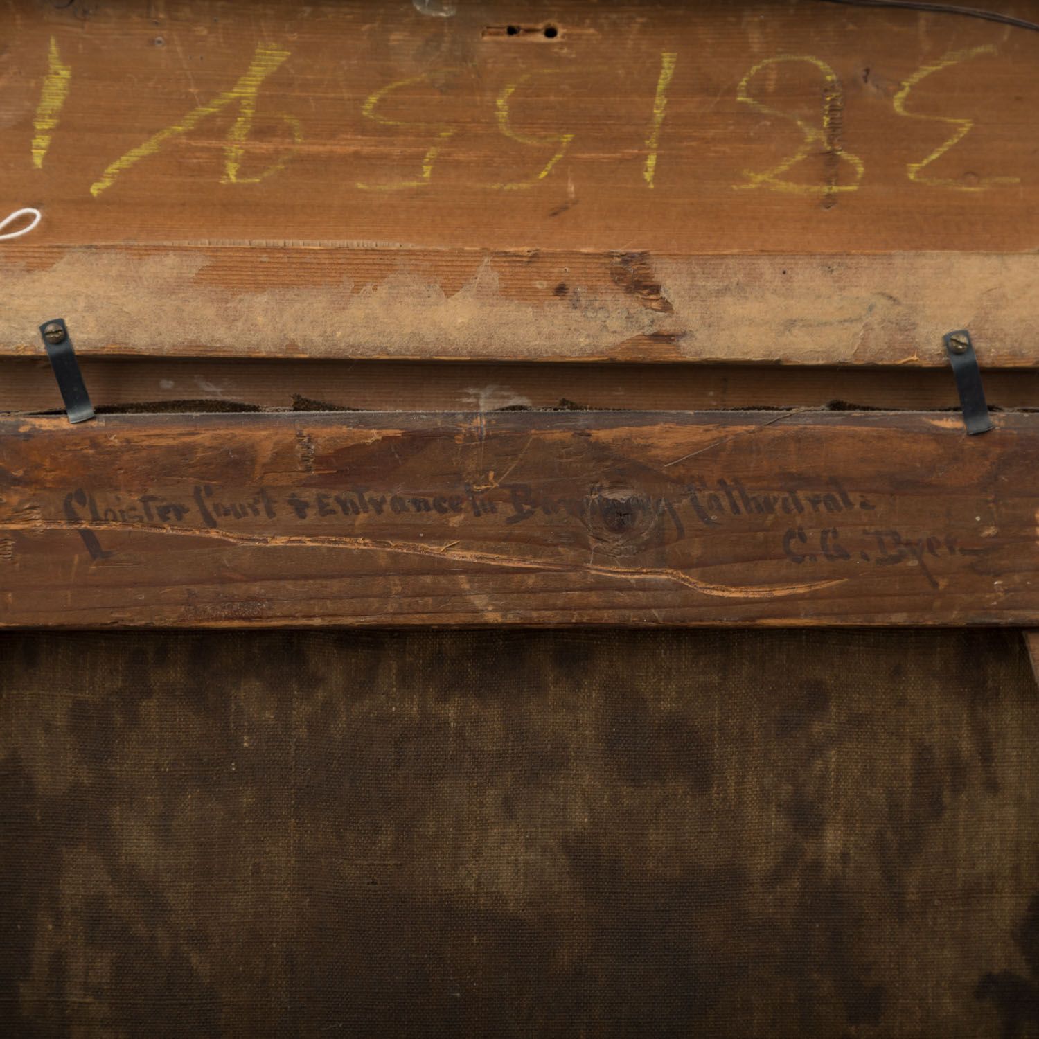 Mönch im Klosterhof mit einem Krug im Schatten des Kreuzganges stehend, der Eingang zur Kirche im Sonnenlicht, u.li. sign., bez. u. dat. 'C. G. Dyer, Munich, 1866', verso am Keilrahmen in Englisch betitelt, Öl/Leinwand, HxB: ca. 33x31 cm (56x55 cm mit Rahmen). Craquelé, Berieb, Lw. gewölbt am oberen Rand, rest.. Mir Rahmen (part. besch.).
