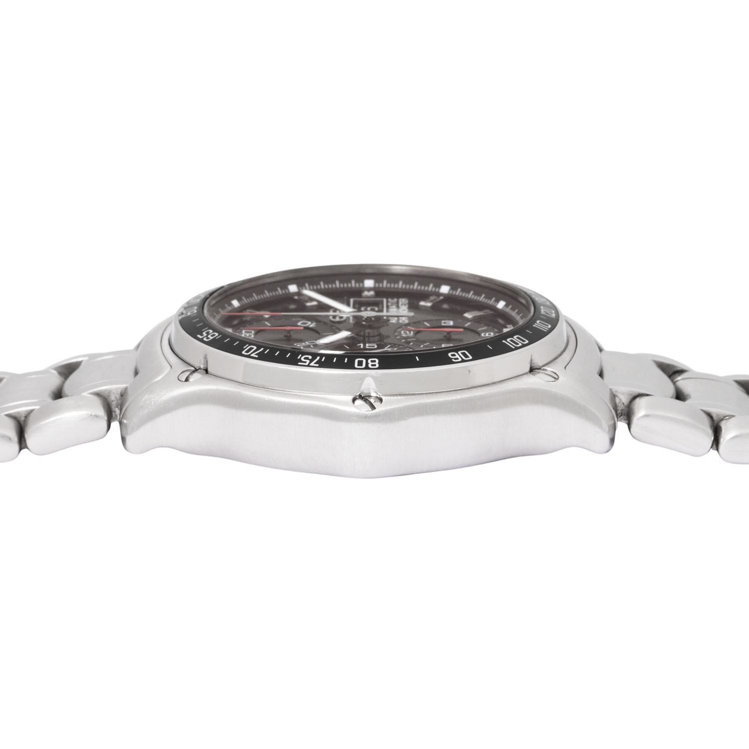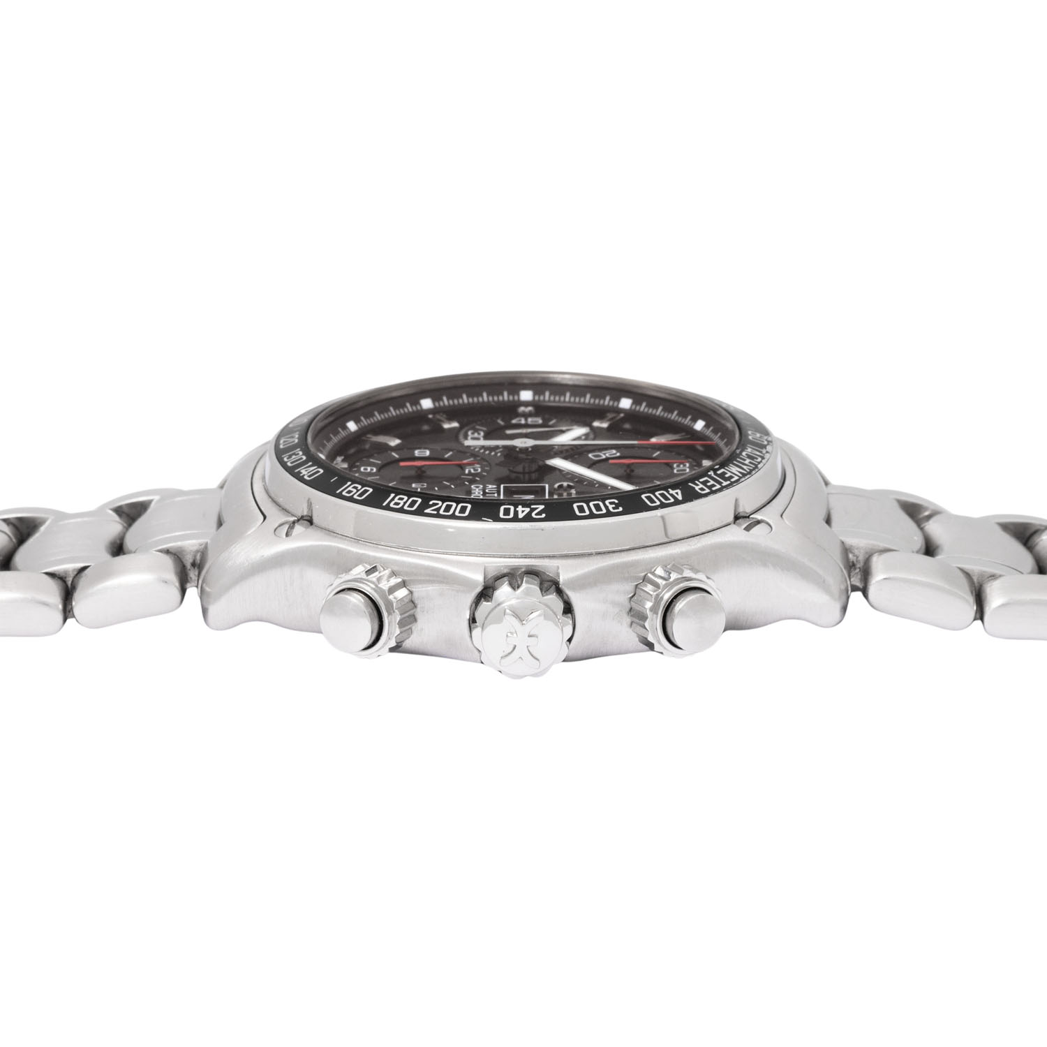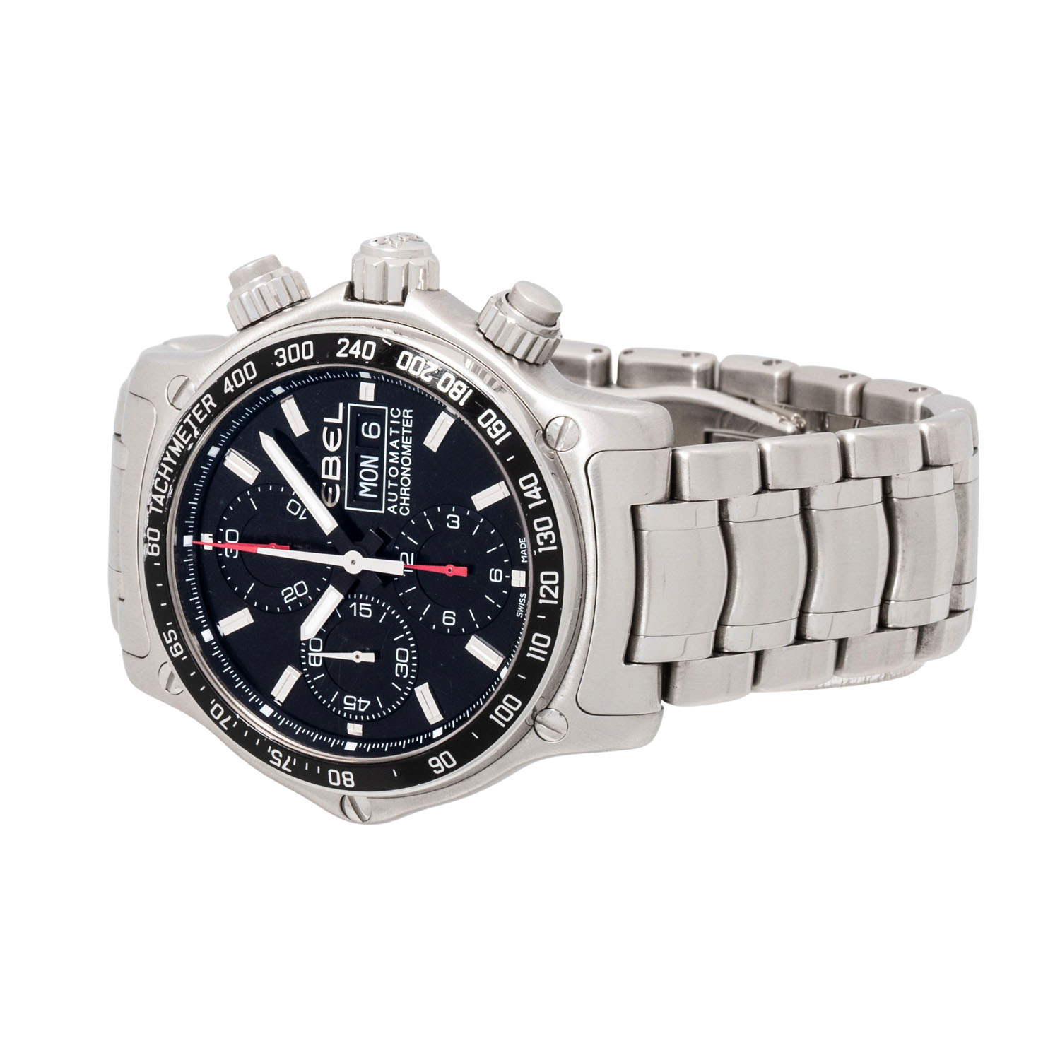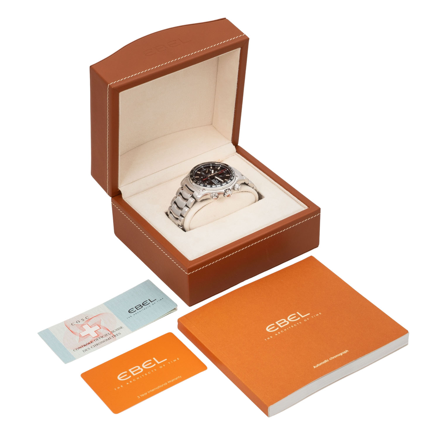 Edelstahl. Automatik-Werk Kal. Ebel 750 mit guten Gangwerten (+0s/d. 248°). Schwarzes Zifferblatt mit aufgesetzten Indizes, 3 Totalisatoren, kleiner Sekunde und Anzeige von Wochentag und Datum. Tachymeter Lünette. Ebel Edelstahl Armband mit Faltschließe. Guter Zustand mit Tragespuren. Original Box, Anleitung, Chrono Zertifikat, Händlerverzeichnis, Kassenbeleg vom Kauf der Uhr und Garantiekarte anbei. Gekauft im August 2007 bei Ntinga Ltd. im Tambo Airport in Südafrika. Durchmesser ca. 44 mm (gemessen ohne Krone). Passend bis zu ca. 19 cm Handgelenkumfang.