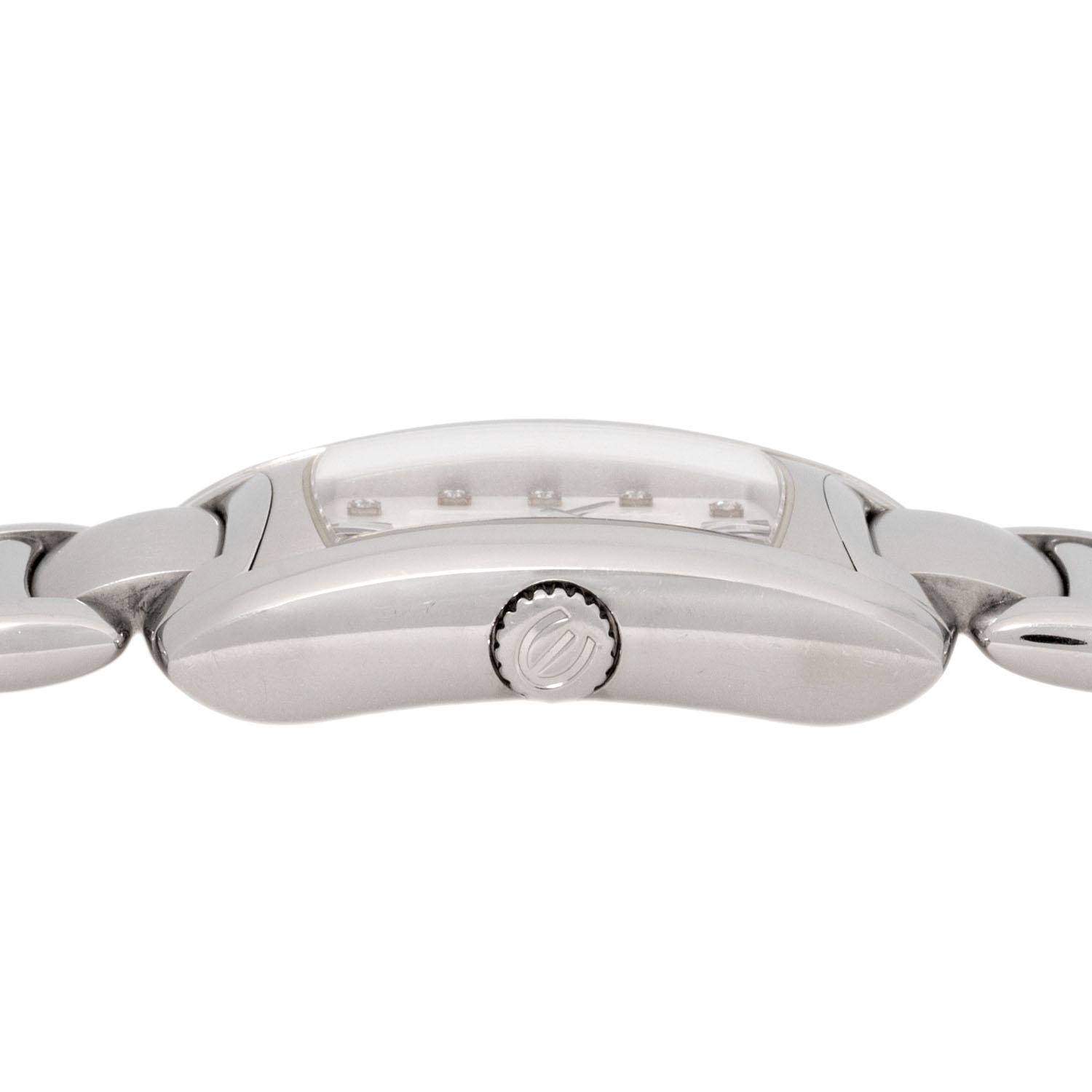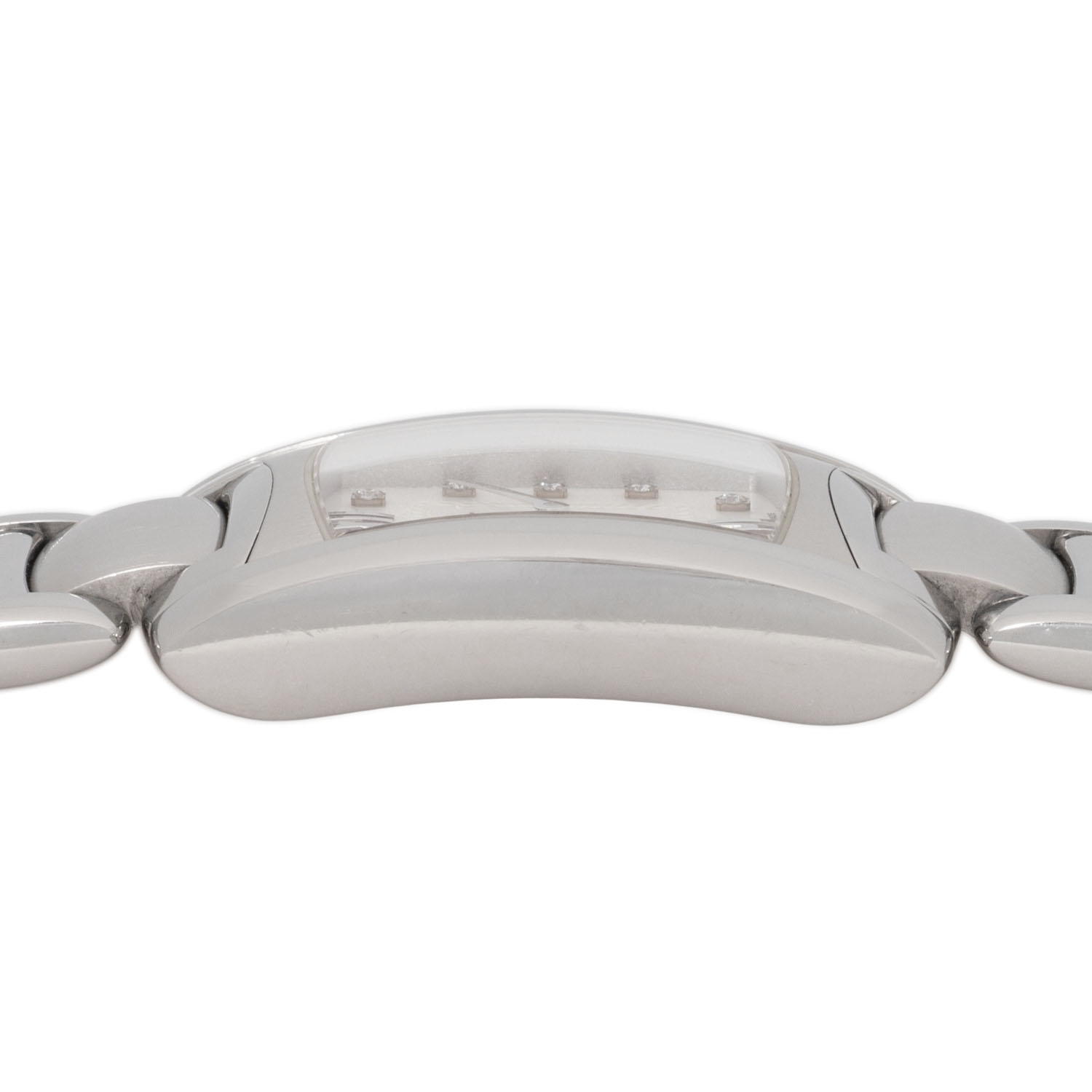 Edelstahl, Seriennummer A124768. Quarzwerk mit neuer Batterie, Werk läuft. Perlmutt-Zifferblatt mit 10 Diamant-Inizes und römischer 6 & 12. Edelstahl-Gliederarmband mit Butterflyschließe, passend für einen Handgelenksumfang von bis zu ca. 18 cm. Gebrauchter Zustand, sichtbare Tragespuren am Gehäuse und Band. Original Box und Papiere vom 13.12.2007 anbei. Durchmesser ca. 28 mm gemessen ohne Krone.