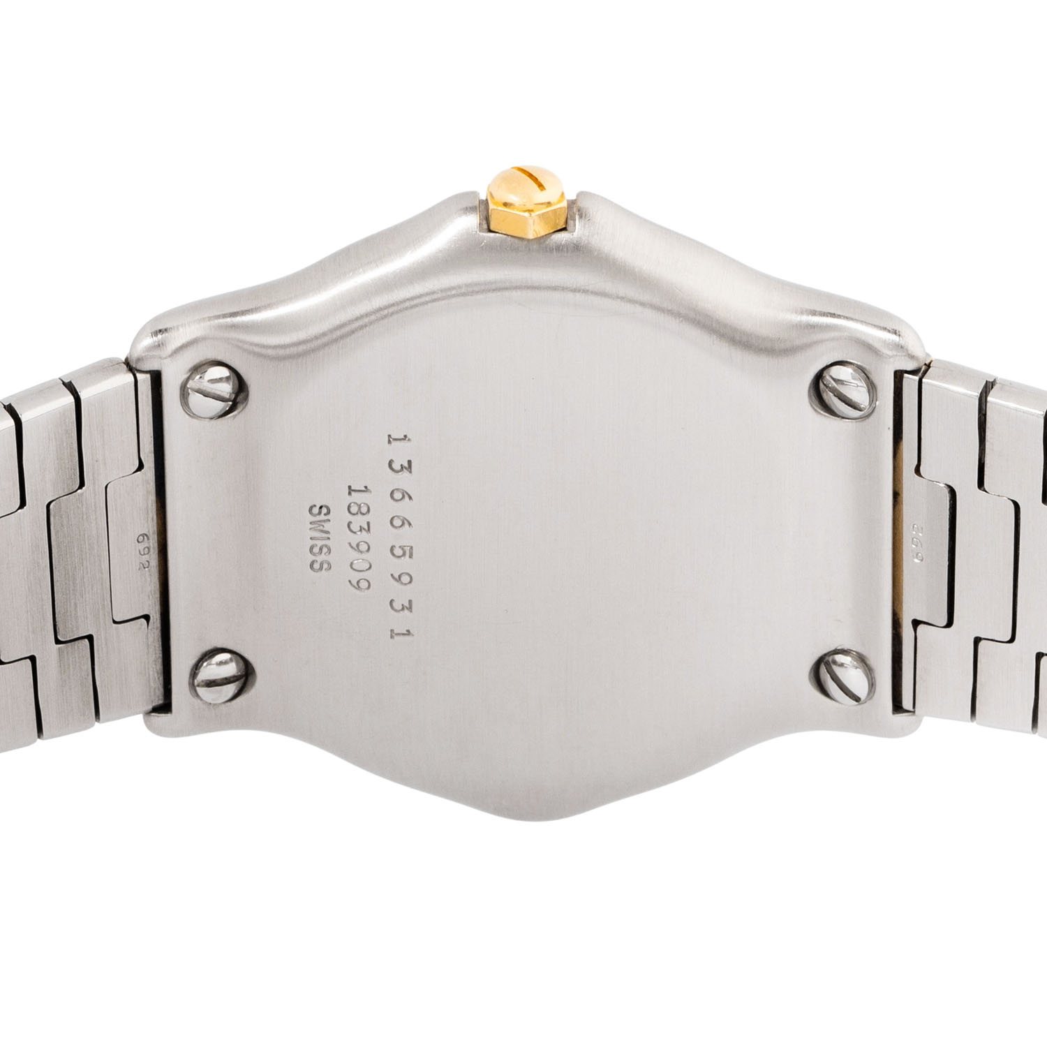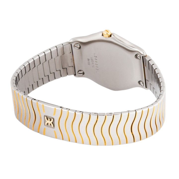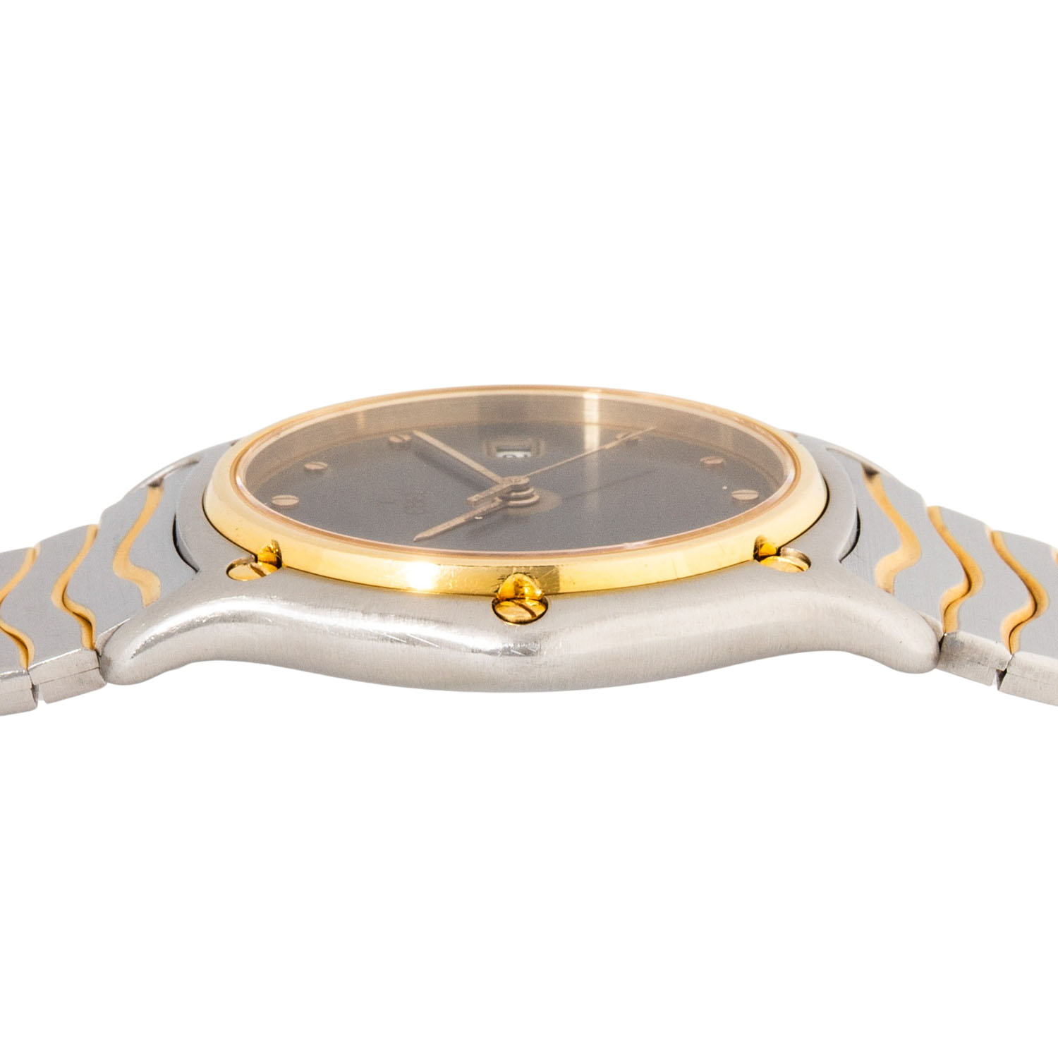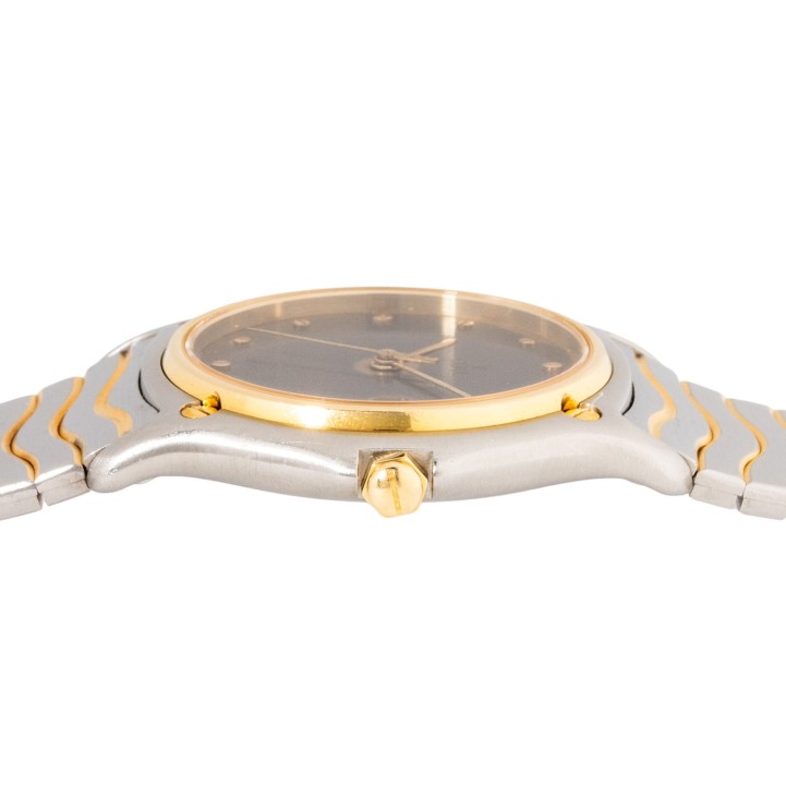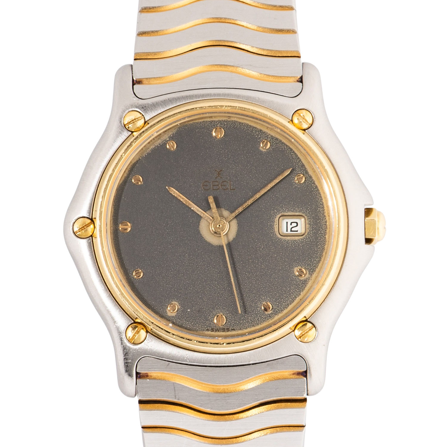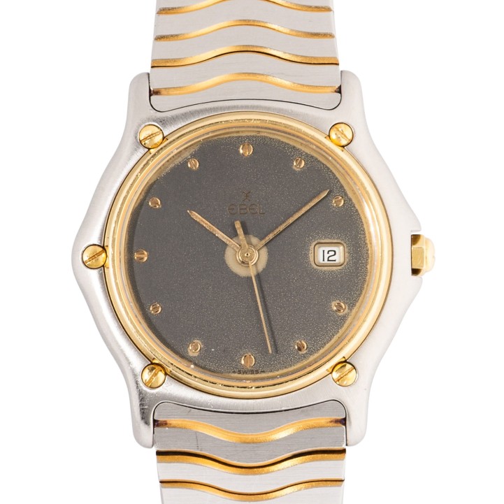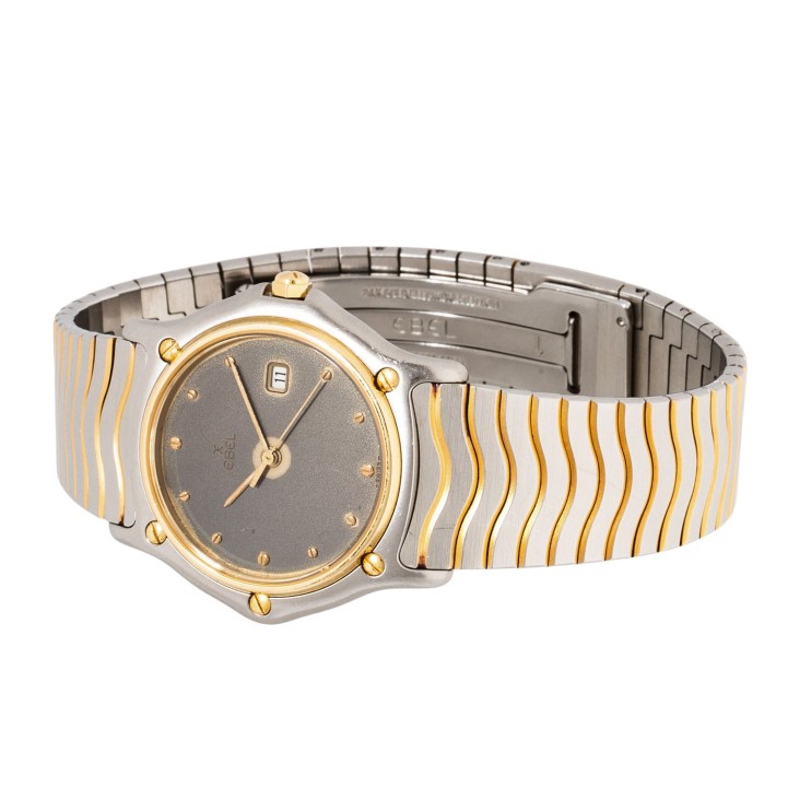 Edelstahl / Gelbgold 18K. Seriennummer 13665931. Quarzwerk in funktionsfähigem Zustand. Neue Batterie. Graues Zifferblatt (leicht Tropical) mit aufgesetzten Indizes und Datumsanzeige. Zeiger mit leichter Korrosion. Ebel Armband in Edelstahl / Gold mit Faltschließe. Gebrauchter Zustand mit sichtbaren Tragespuren am Gehäuse, Lünette, Glas und Armband. Durchmesser ca. 31 mm (gemessen ohne Krone). Passend bis zu ca. 18 cm Handgelenkumfang.