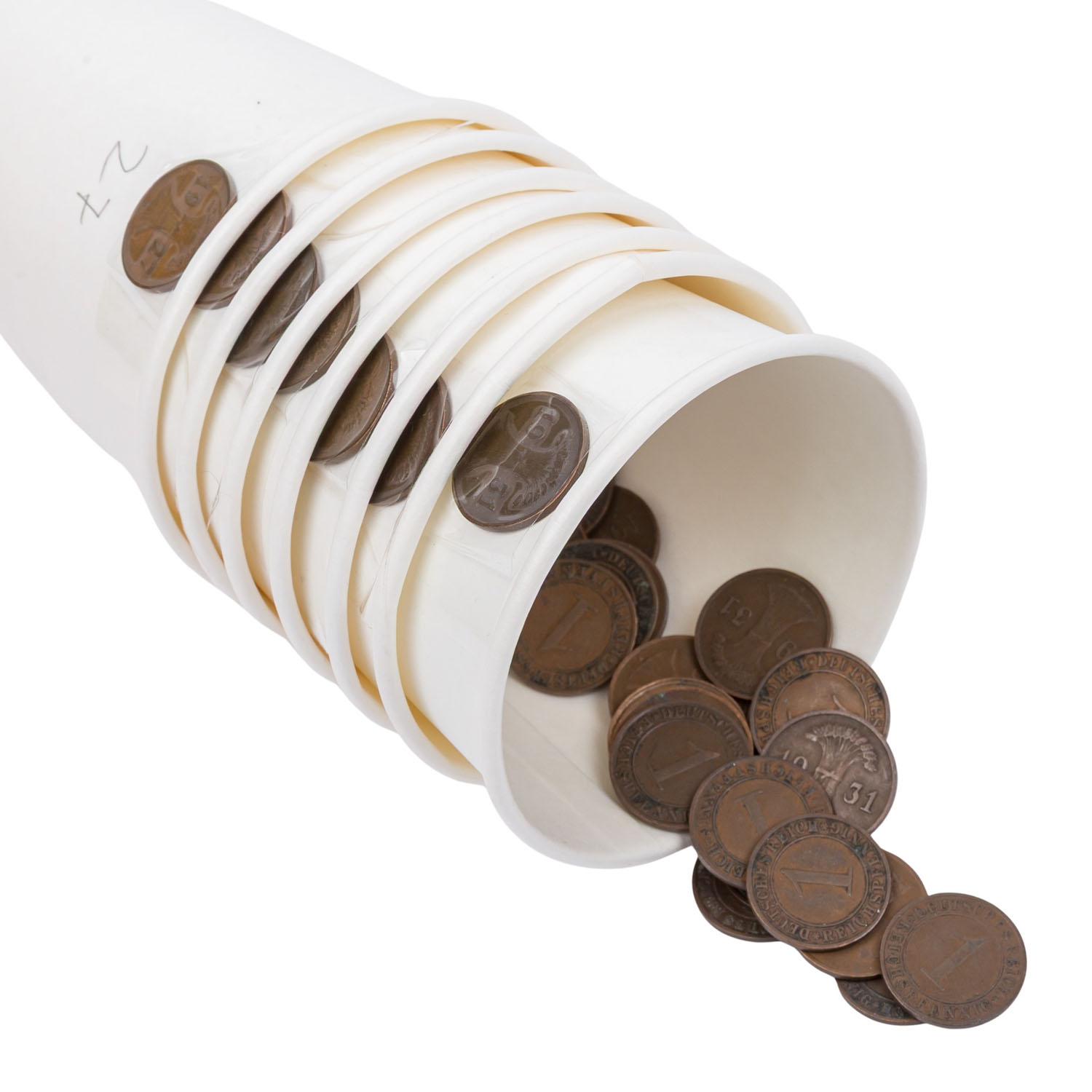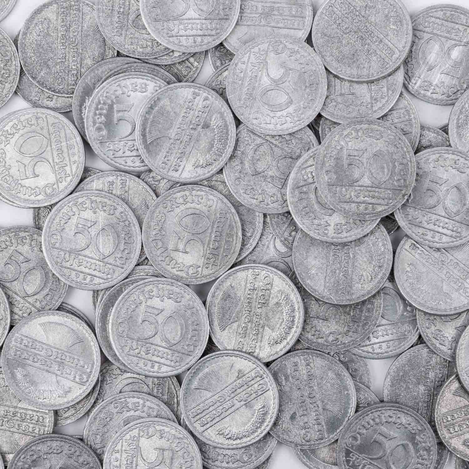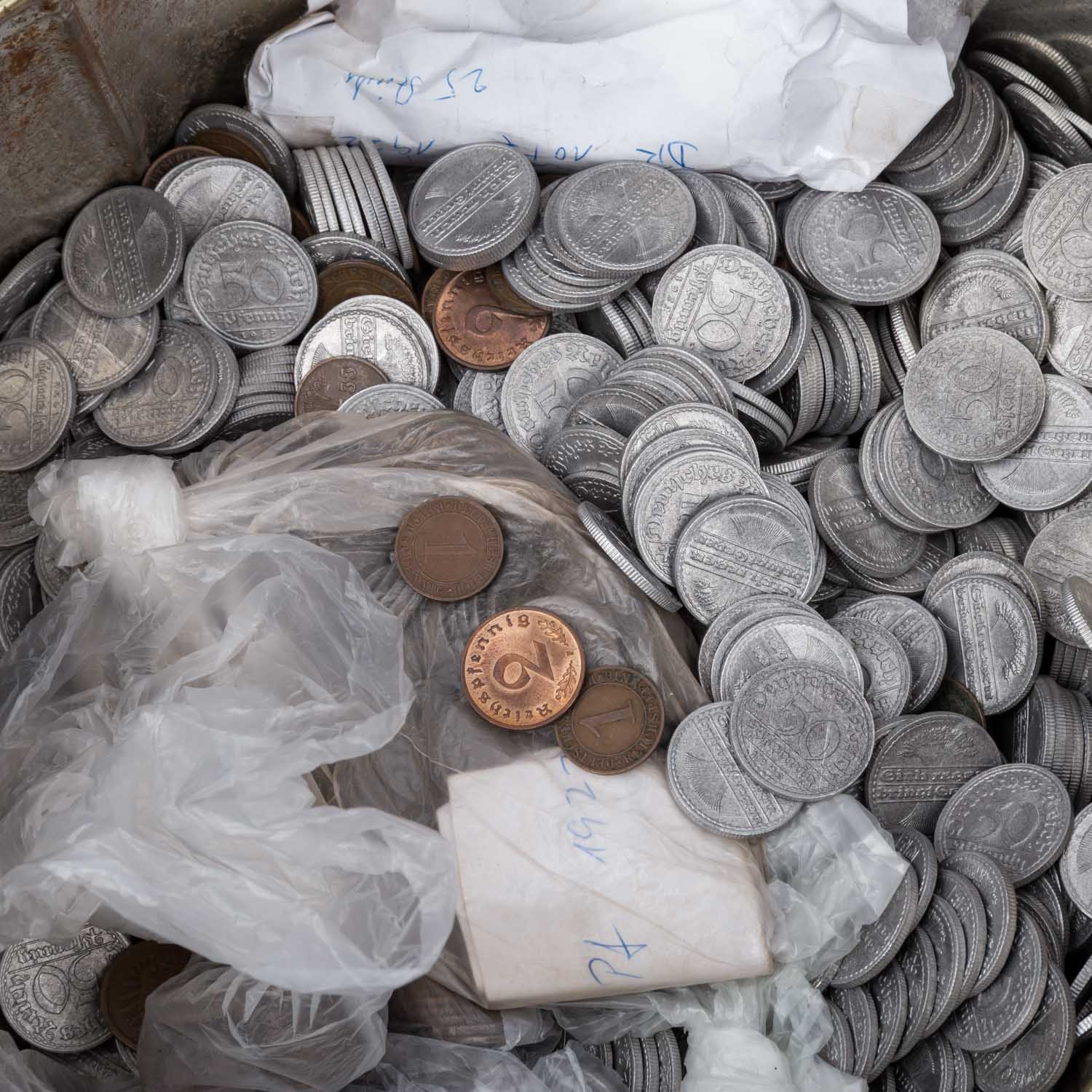 Eine Fundgrube mit überwiegend Weimarer Republik Ersatz- und Inflationsmünzen 50 Pfennig 1919-1922 (Jaeger 301) wie auch Weimarer Republik Kleinmünzen Rentenpfennige J. 306/307 sowie Reichspfennige J. 313/314. Dabei Ersatzmünzen des 1. Weltkrieges vor allem 10 Pfennige 1922 (J.299), ca. 1,7 kg und Weitere. Drittes Reich - Reichspfennige J. 361/362. Teilweise Kleinmünzen Dt. Kaiserreich enthalten. Diverse Jahrgänge und unterschiedliche Erhaltungsstufen. Größtenteils vorsortierte Sammlung. Bitte das Los unbedingt besichtigen.