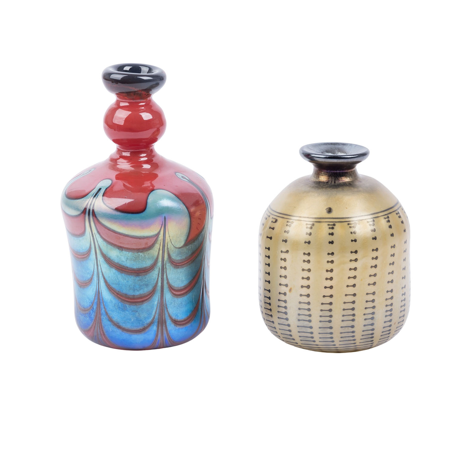 Glas mit polychromen Einschmelzungen in linearen Dekoren, signiert und datiert, Abrisse, H. ca. 6,5-15 cm. Leichte Altersspuren.