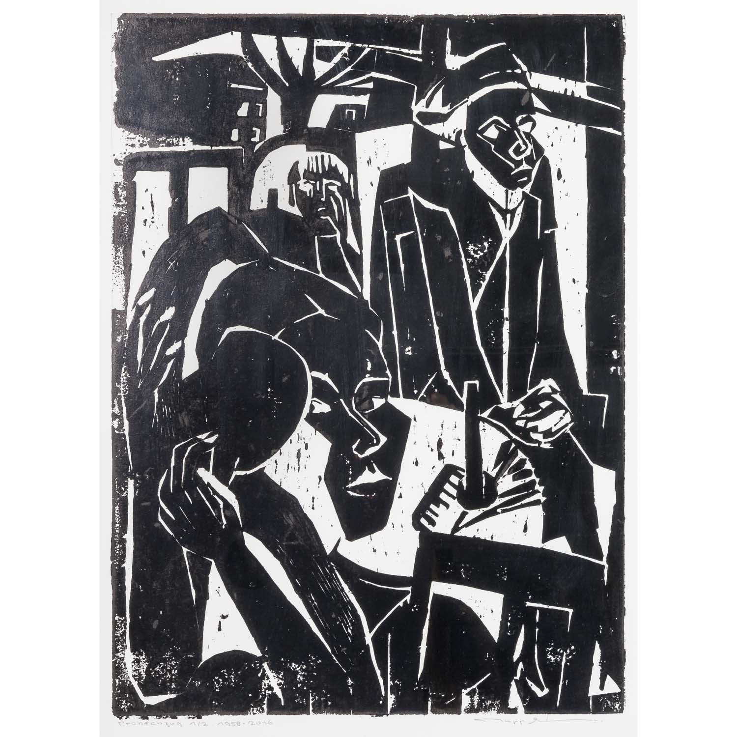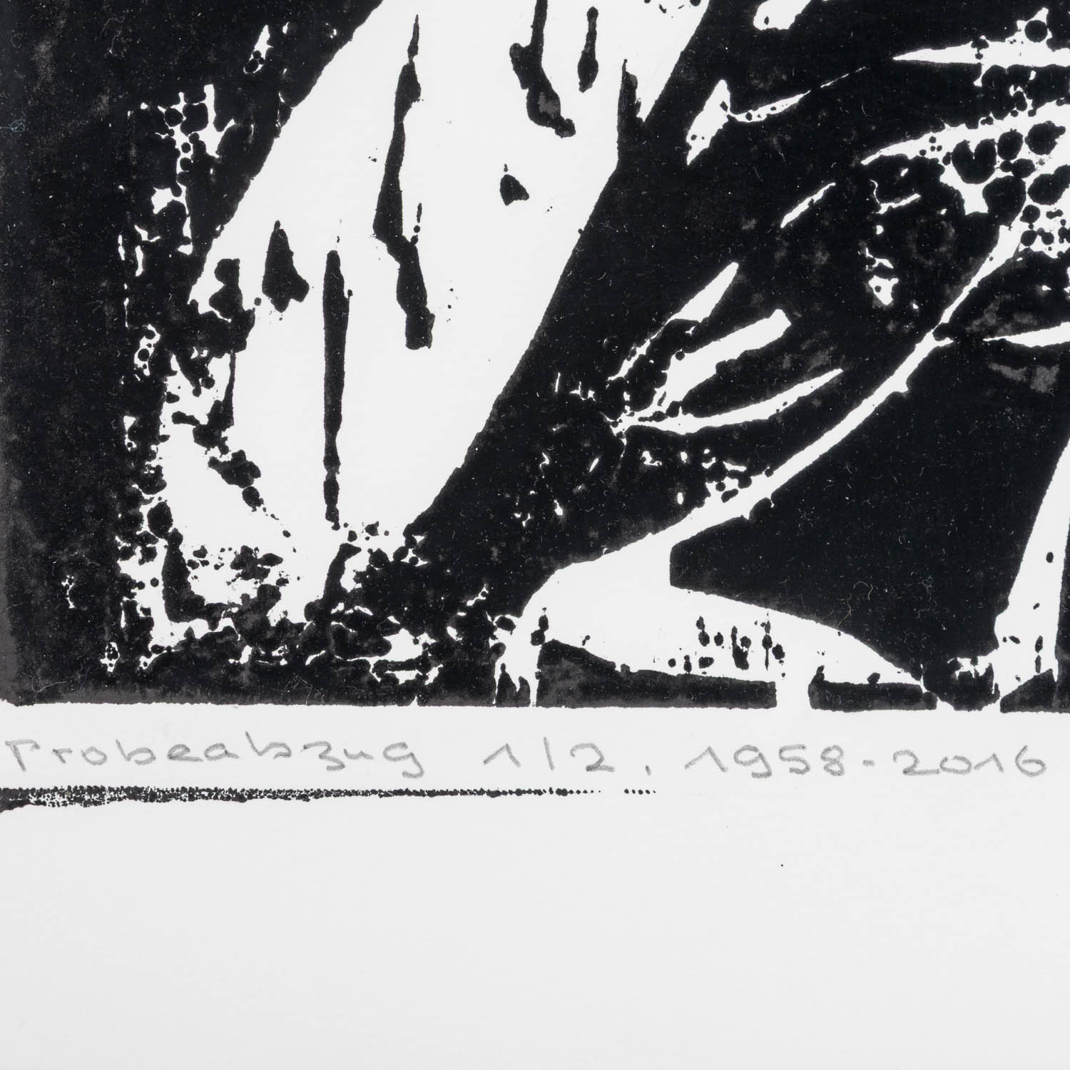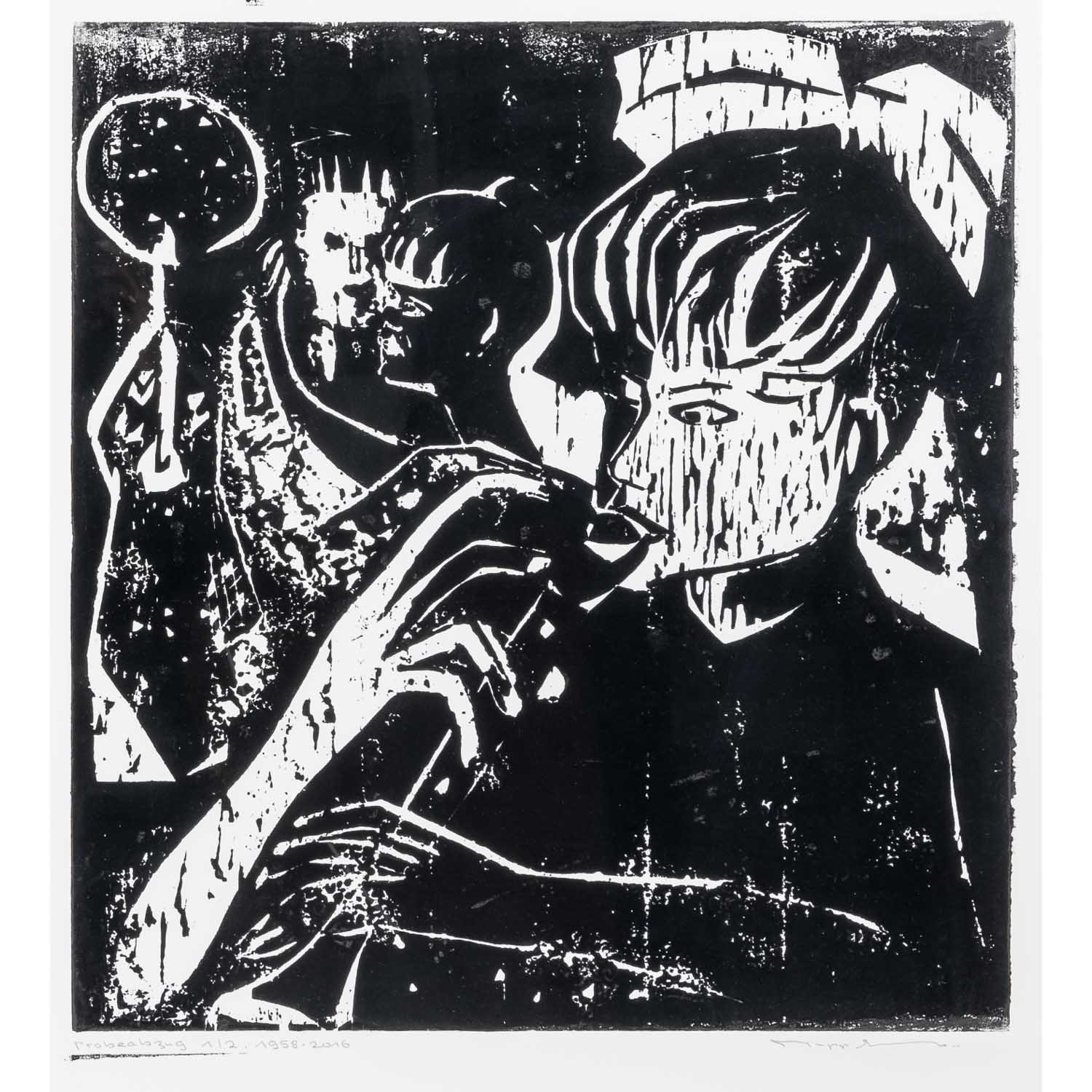 1) 'Gruppe am Tisch', Holzschnitt/Papier, u.li. bez. 'Probeabzug 1/2 1958-2016', jeweils u.re. mit Bleistift von Hand signiert, HxB: Platte ca. 71,5x52 cm, Blatt ca. 80x60 cm, Außenmaße Rahmen ca. 85x65 cm. 2) 'Klarinettenspielerin', Holzschnitt/Papier, u.li. bez. 'Probeabzug 1/2 1958-2016', jeweils u.re. mit Bleistift von Hand signiert, HxB: Platte ca. 55,5x51 cm, Blatt ca. 80x60 cm, Außenmaße Rahmen ca. 85x65 cm. Jeweils Alters- und Beriebsspuren. Jeweils mit verglastem Rahmen (Alters- und Beriebsspuren).