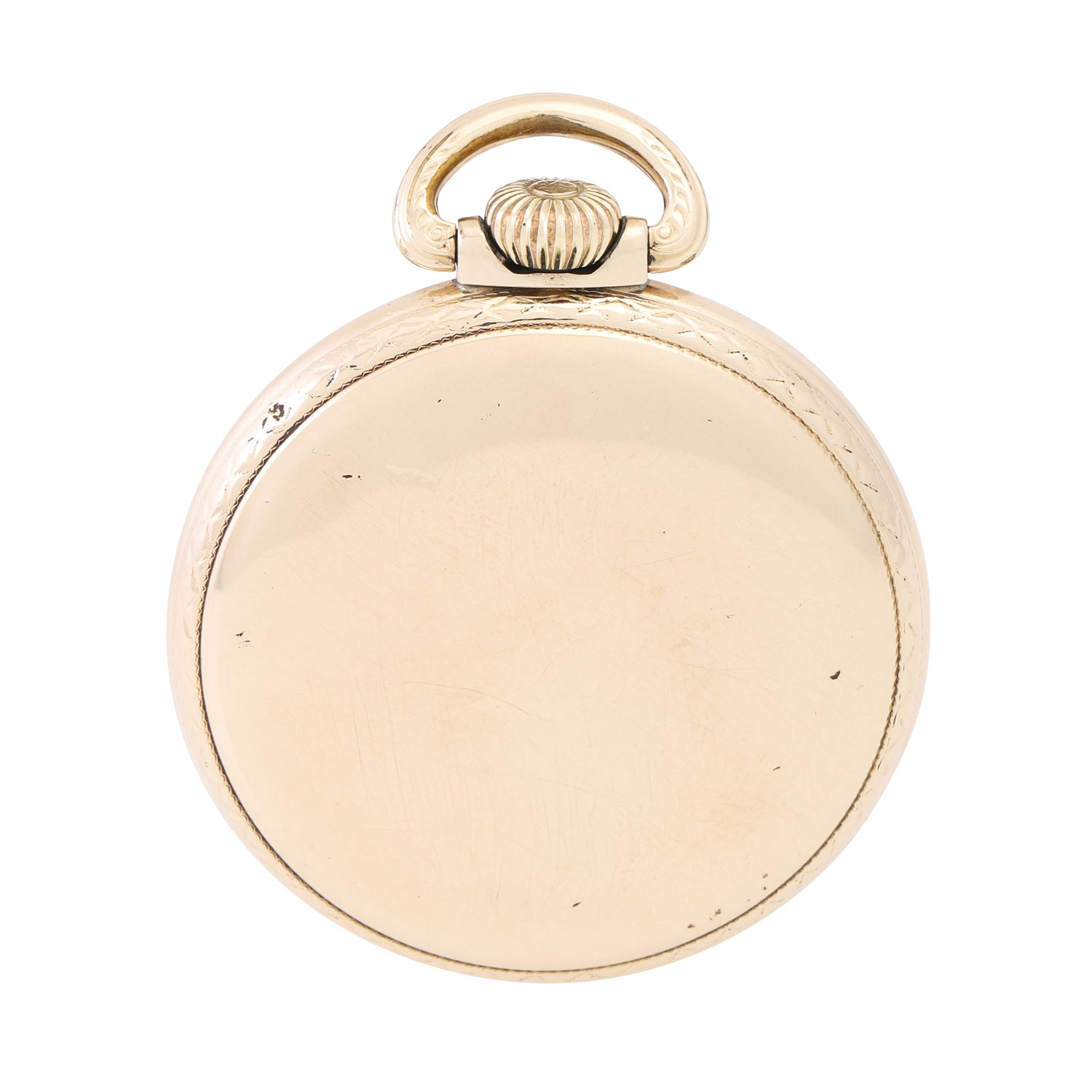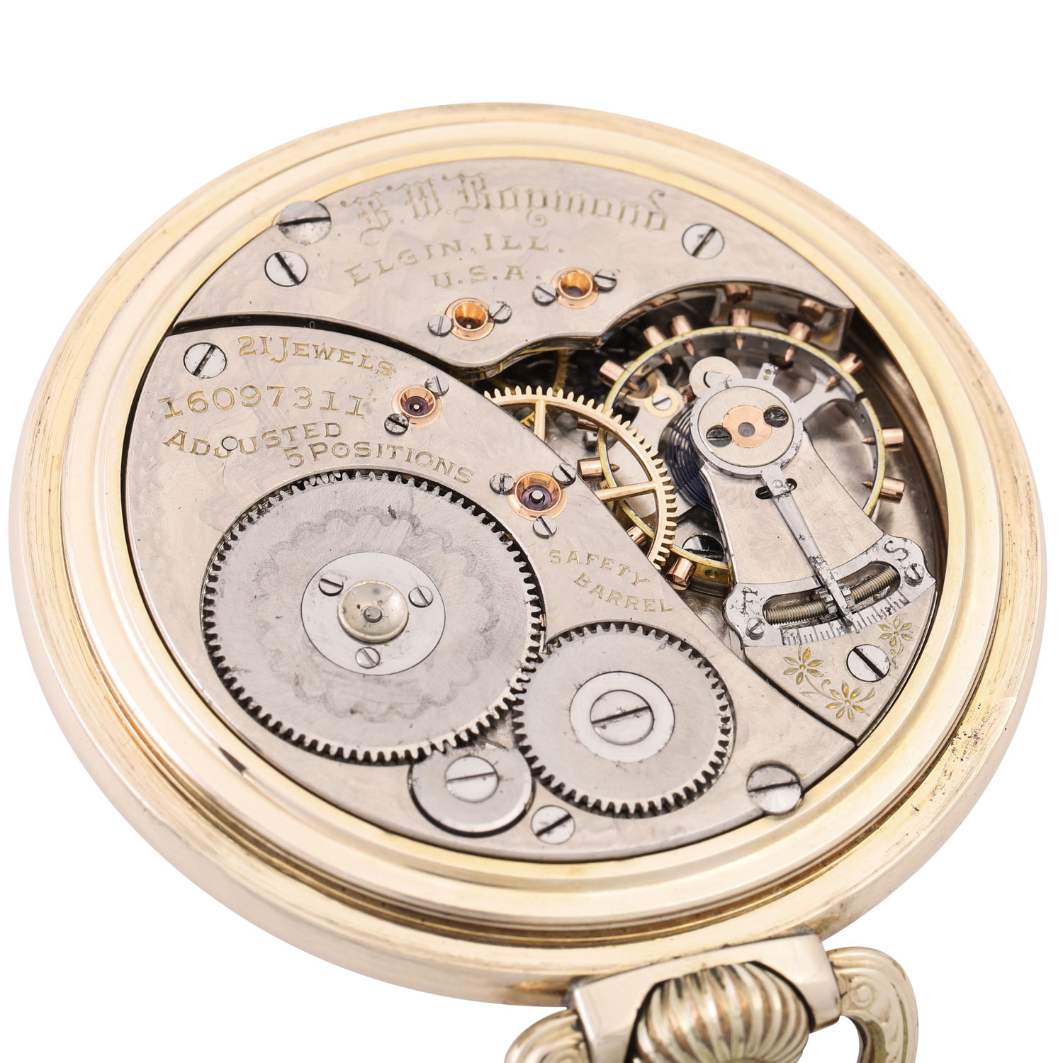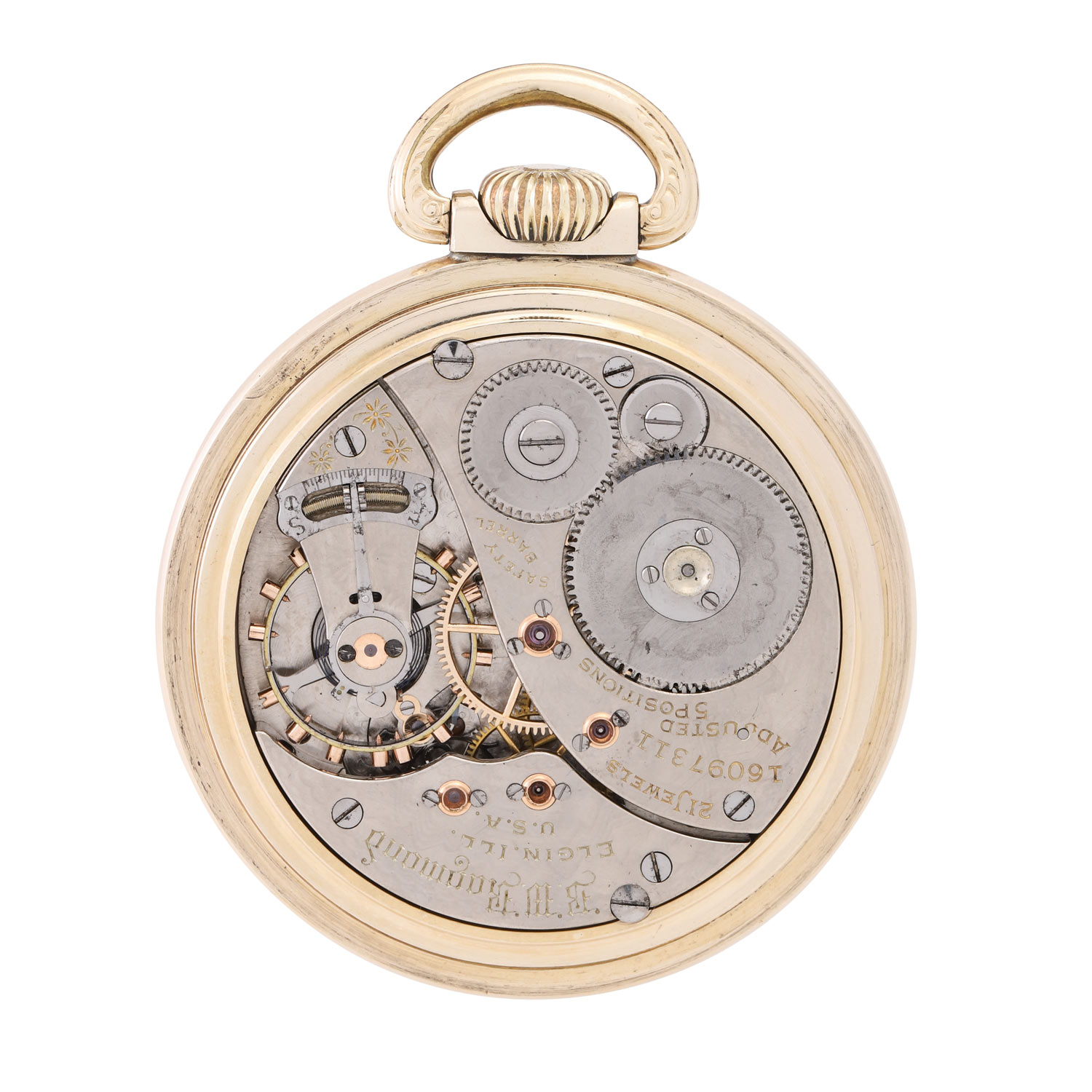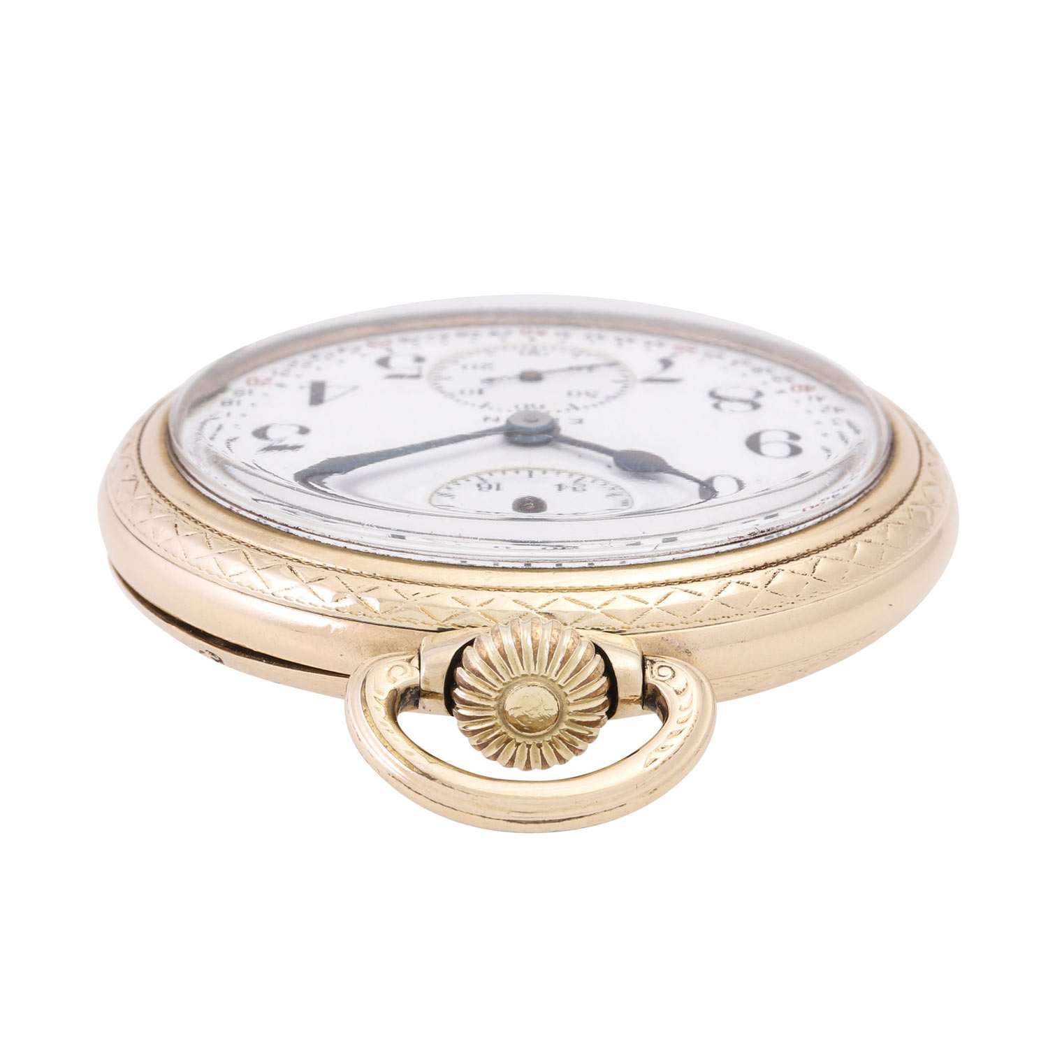 Vergoldet, Deckel verschraubt. Vernickeltes Handaufzug-Werk Kal. B.W. Raymond 391 mit 3/4-Platine, Ankerhemmung, 21 Lagersteinen, Minutenrad in Gold, verschraubte Gold-Chatons, bimetallische Kompensationsunruh, gebläute Breguet-Spirale, Feinregulierung, funktionsfähig. 3-teiliges weißes Emaille-Zifferblatt mit schwarzen arabischen Stundenziffern und roter Minuterie, Gangreserveanzeige bei 12 Uhr, Haarrisse, ausgebessert am Rand zw. 3 und 4 Uhr, gebläute Stahlzeiger. Guter Zustand. Durchmesser ca. 52mm ohne Krone.