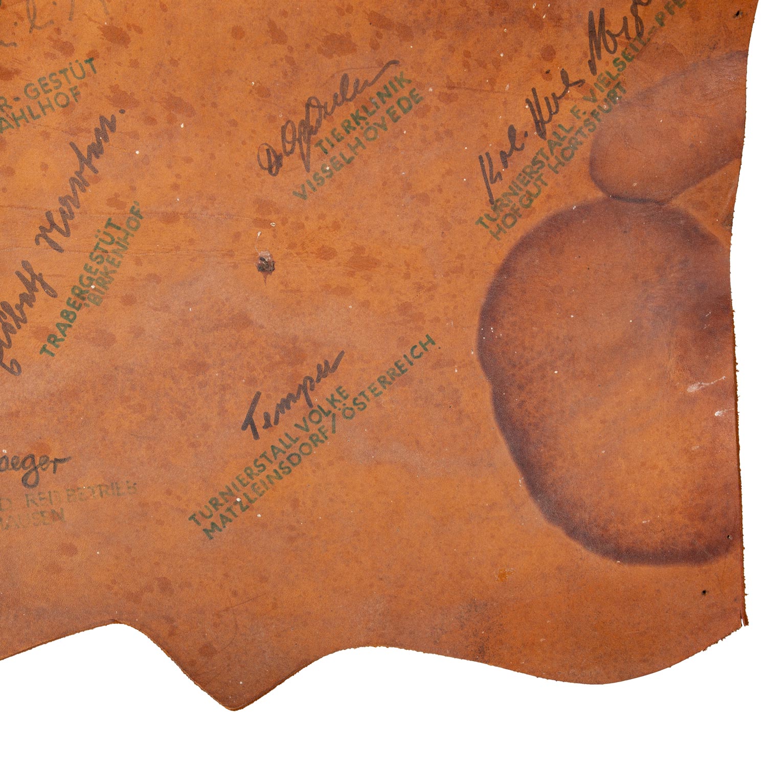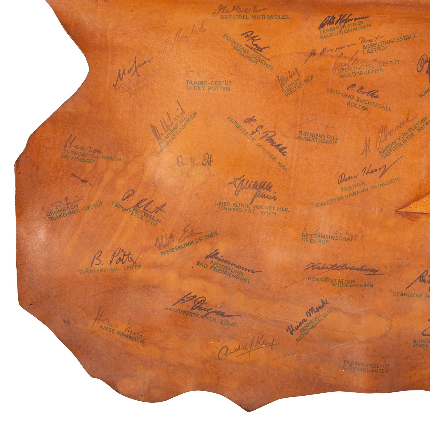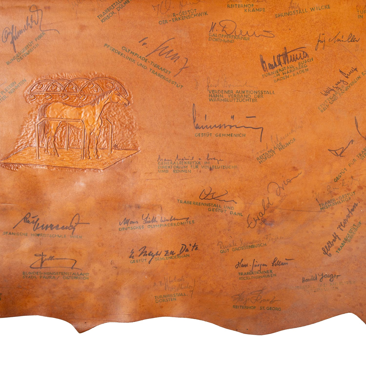 mit den Original-Unterschriften von ca. 70 Spitzenfunktionären, der gesamten damaligen Elite des Deutschen und Österreichischen Pferdesports. Es handelt sich um eine Auftragsarbeit aus 1978/79 des Erfinders der Weinsberger Pferde-Besonnungs-Anlagen an den Künstler Alois Klucken (1922-2018, Studien an der Folkwangschule Essen, Ausstellungen u.a. auf der größten Pferdemesse der Welt Equitana). Auf der ca. 170 x 110 cm großen Tafel aus Leder sind die Unterschriften u.a. folgender Persönlichkeiten: Hofrat und Gestütsleiter Dr. Lehrner, Bundesgestüt Piber (Österreich), der bekannte Pferdetierarzt Pferdeklinik Dr. Ende, Dr. Häussermann, Pferdeklinik Bad Friedrichshall, Hengststation Wildeshausen, Herbert Breckweg, Spanische Hofreitschule Wien, damaliger Leiter Oberst Kurt Albrecht, Bundeshengstenstallamt Stadl Paura (Österreich) Hofrat Dr. Lechleitner, Deutsches Olympiadekomitee Herr Lütke Westhues, Gestüt Schlenderhan, der damalige Gestütsleiter Meyer zu Düte, Olympiade Tierarzt, Pferdeklinik und Trabergestüt Dr. Grenz, Generalsekretär für Vollblutzucht und Rennen Köln, Herr von Loeper uvm. Die Tafel aus Leder ist oberhalb mit einer massiven Eichenholz-Schnitzerei versehen, die gleichsam als Aufhängemöglichkeit dient, die unterschiedliche Pferdesport-Disziplinen darstellt. In der Mitte der Ledertafel Punzierung einer Pferde-Besonnungs-Anlage. Altersspuren, das Leder teilweise etwas verfärbt oder fleckig. Maße ca. 160 x 110 cm.