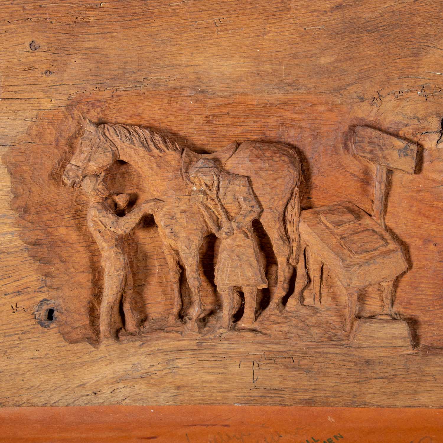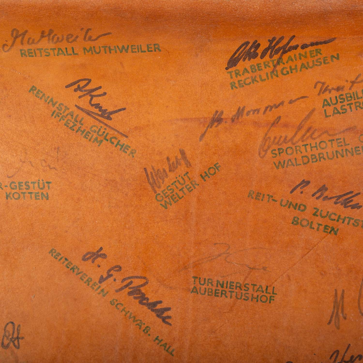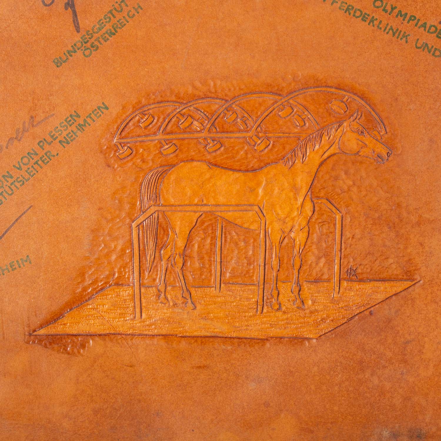 mit den Original-Unterschriften von ca. 70 Spitzenfunktionären, der gesamten damaligen Elite des Deutschen und Österreichischen Pferdesports. Es handelt sich um eine Auftragsarbeit aus 1978/79 des Erfinders der Weinsberger Pferde-Besonnungs-Anlagen an den Künstler Alois Klucken (1922-2018, Studien an der Folkwangschule Essen, Ausstellungen u.a. auf der größten Pferdemesse der Welt Equitana). Auf der ca. 170 x 110 cm großen Tafel aus Leder sind die Unterschriften u.a. folgender Persönlichkeiten: Hofrat und Gestütsleiter Dr. Lehrner, Bundesgestüt Piber (Österreich), der bekannte Pferdetierarzt Pferdeklinik Dr. Ende, Dr. Häussermann, Pferdeklinik Bad Friedrichshall, Hengststation Wildeshausen, Herbert Breckweg, Spanische Hofreitschule Wien, damaliger Leiter Oberst Kurt Albrecht, Bundeshengstenstallamt Stadl Paura (Österreich) Hofrat Dr. Lechleitner, Deutsches Olympiadekomitee Herr Lütke Westhues, Gestüt Schlenderhan, der damalige Gestütsleiter Meyer zu Düte, Olympiade Tierarzt, Pferdeklinik und Trabergestüt Dr. Grenz, Generalsekretär für Vollblutzucht und Rennen Köln, Herr von Loeper uvm. Die Tafel aus Leder ist oberhalb mit einer massiven Eichenholz-Schnitzerei versehen, die gleichsam als Aufhängemöglichkeit dient, die unterschiedliche Pferdesport-Disziplinen darstellt. In der Mitte der Ledertafel Punzierung einer Pferde-Besonnungs-Anlage. Altersspuren, das Leder teilweise etwas verfärbt oder fleckig. Maße ca. 160 x 110 cm.