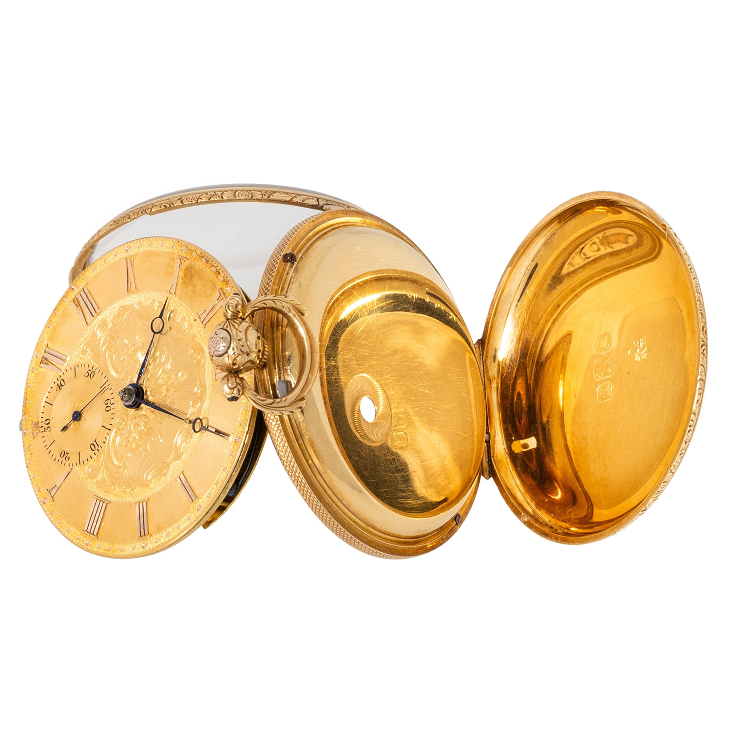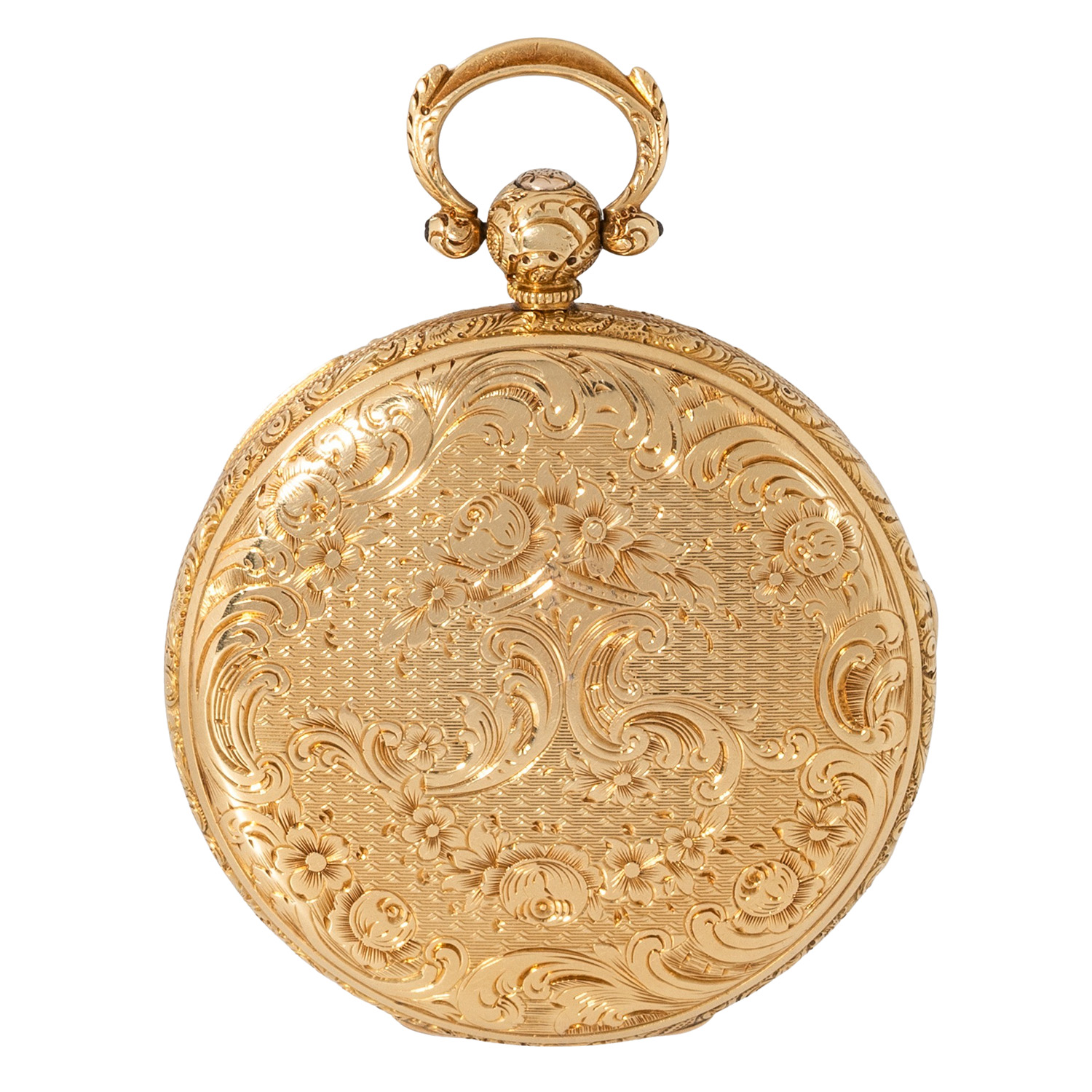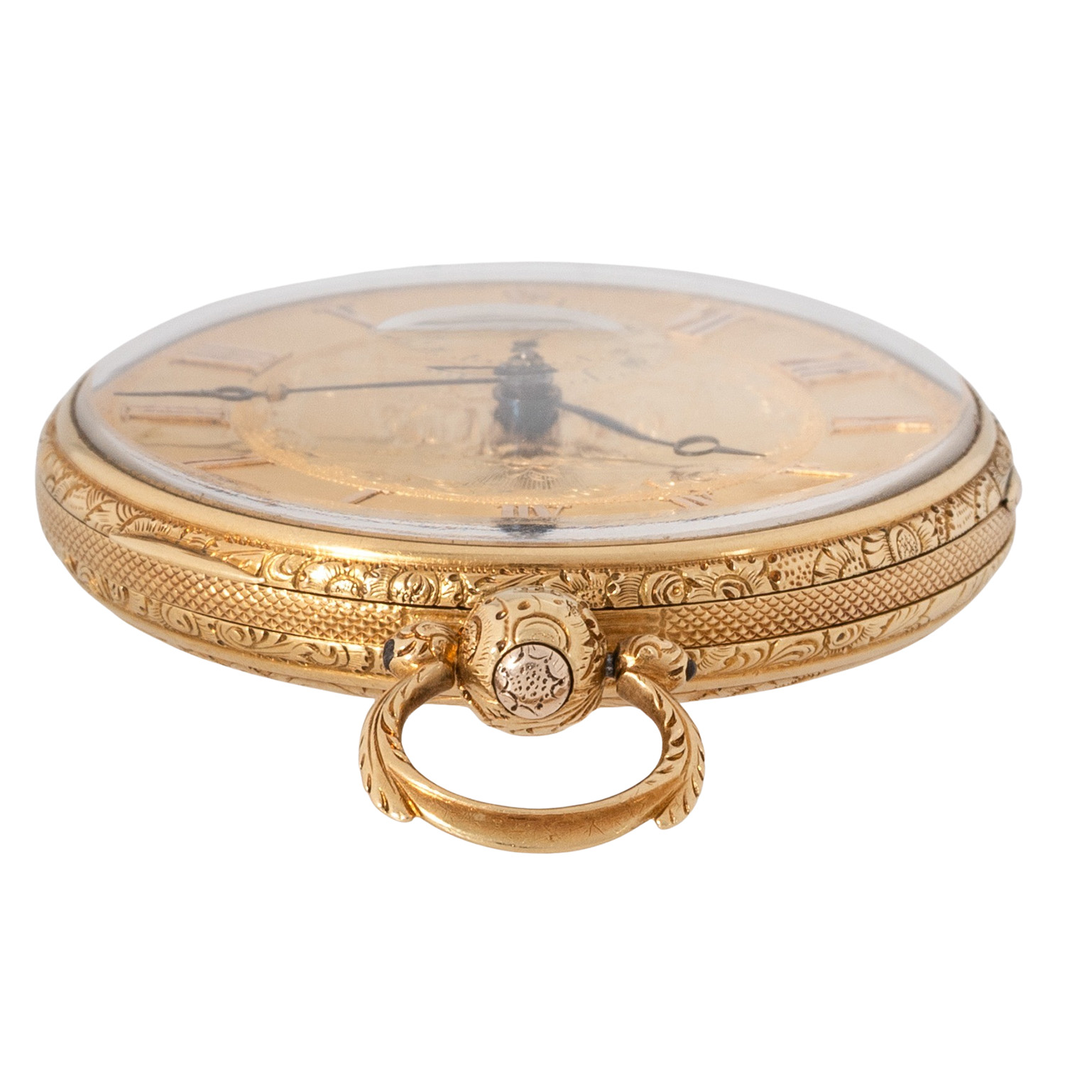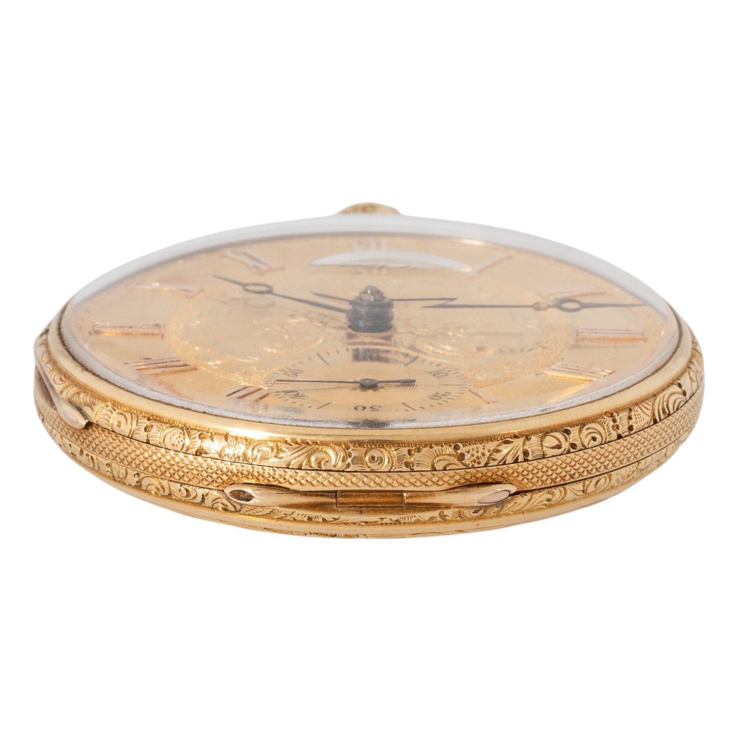 Fein verziertes, guillochiertes 18K Gelbgold-Gehäuse. Mechanisches Werk mit Schlüsselaufzug (Schlüssel nicht anbei) in funktionsfähigem Zustand, mit bimetallischer Kompensationsunruh, verschraubten Chatons und Feinregulierung. 18K Gelbgold-Zifferblatt mit Guillochierung und floraler Gravur, römische Zahlen, kleine Sekunde und Breguet-Zeiger. Guter Zustand, leichte Gerbauchsspuren. Durchmesser ca. 52 mm gemessen ohne Krone.