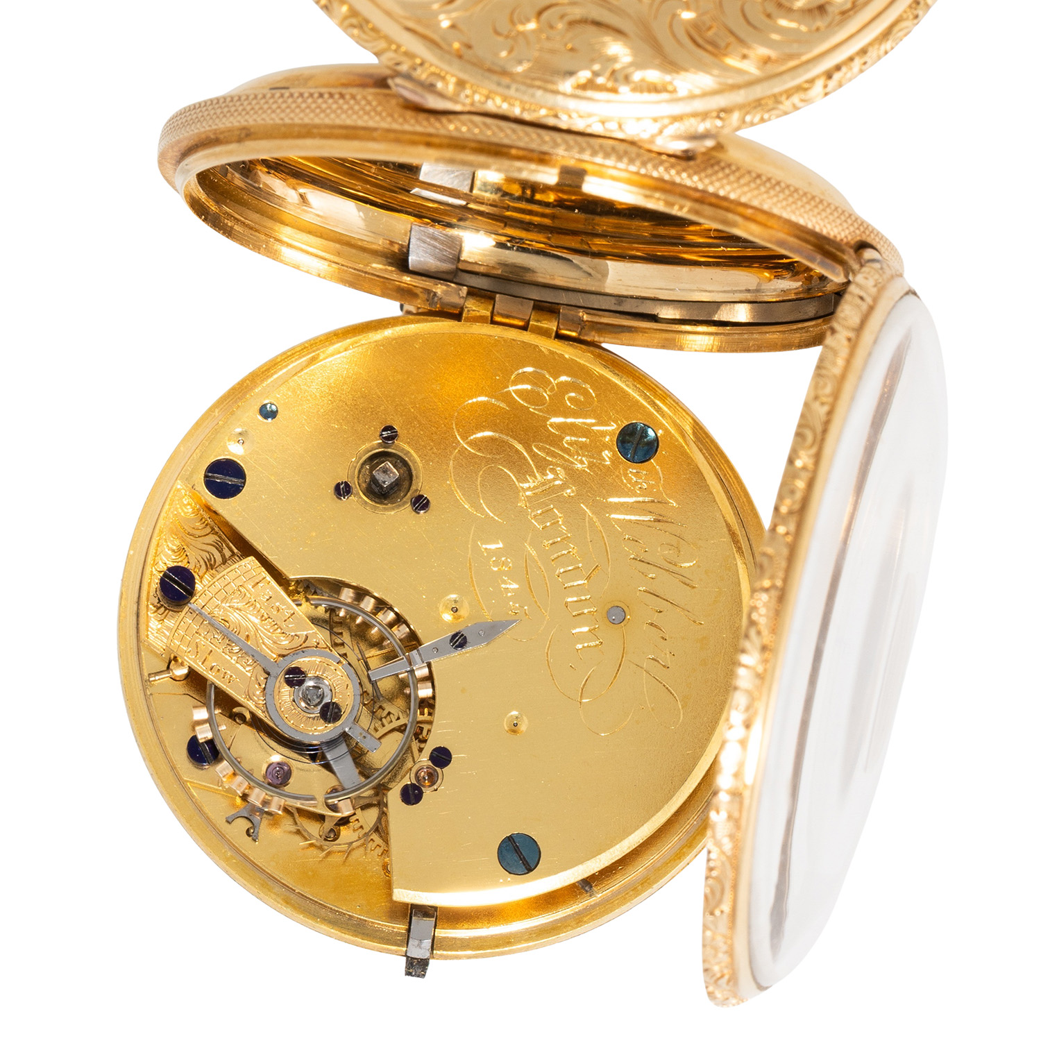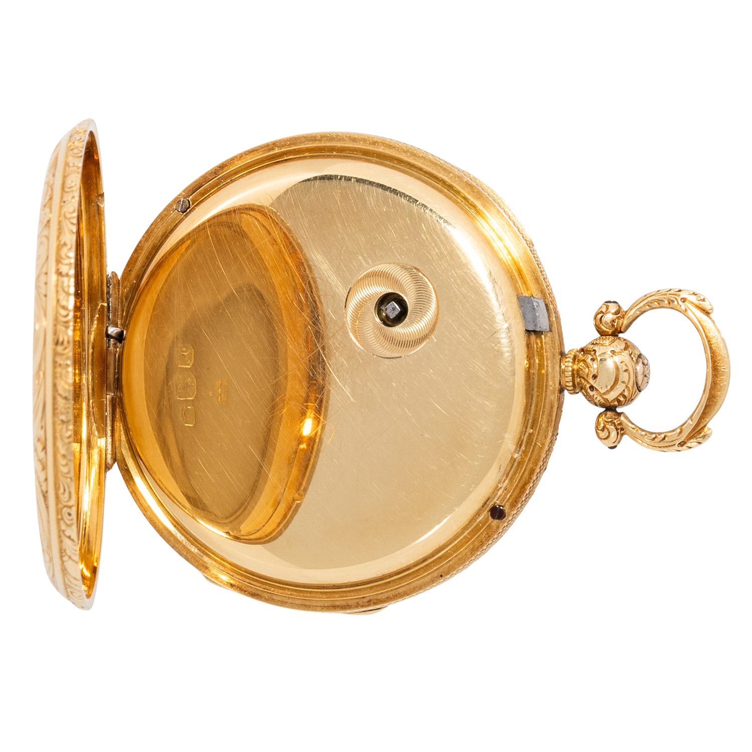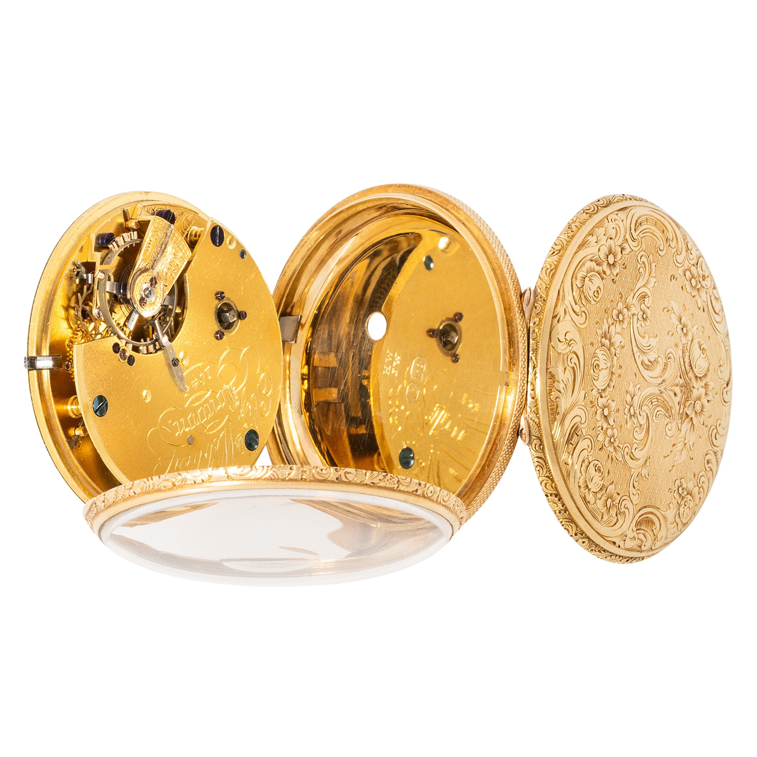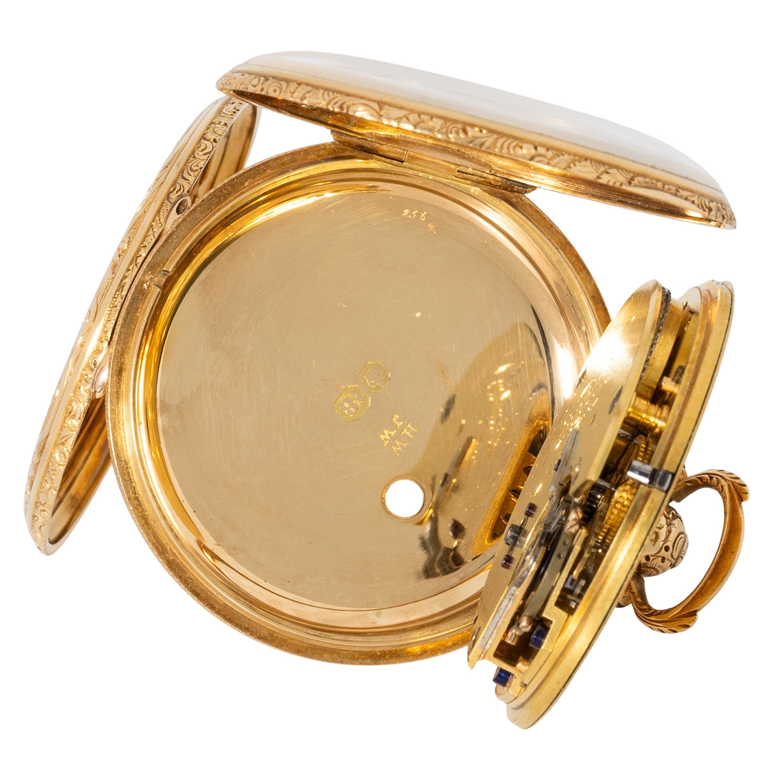 Fein verziertes, guillochiertes 18K Gelbgold-Gehäuse. Mechanisches Werk mit Schlüsselaufzug (Schlüssel nicht anbei) in funktionsfähigem Zustand, mit bimetallischer Kompensationsunruh, verschraubten Chatons und Feinregulierung. 18K Gelbgold-Zifferblatt mit Guillochierung und floraler Gravur, römische Zahlen, kleine Sekunde und Breguet-Zeiger. Guter Zustand, leichte Gerbauchsspuren. Durchmesser ca. 52 mm gemessen ohne Krone.