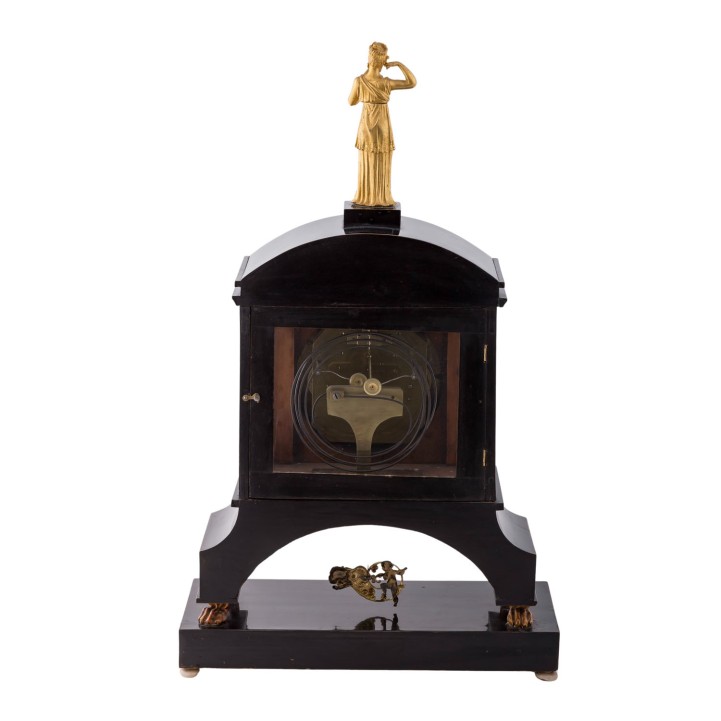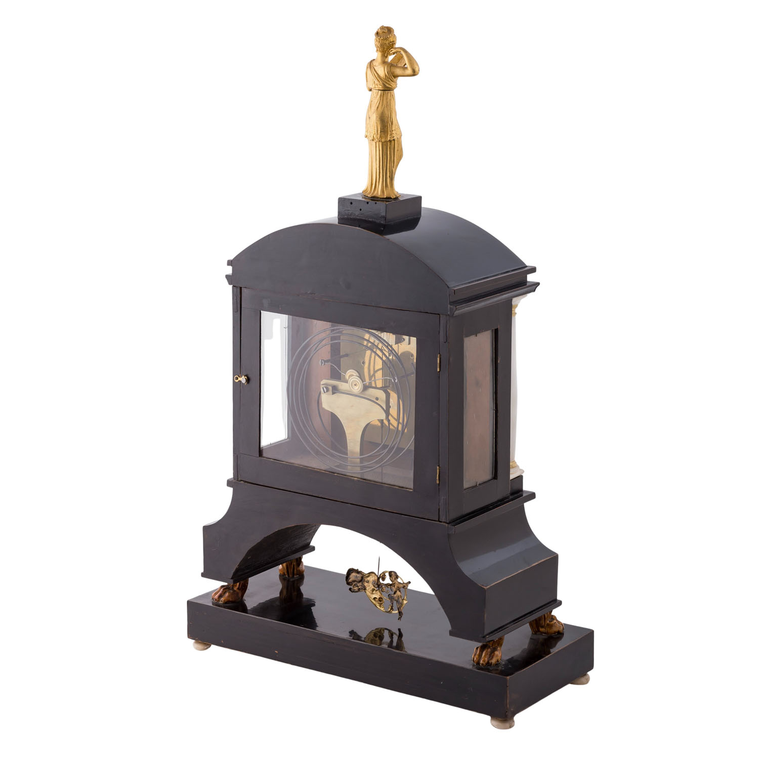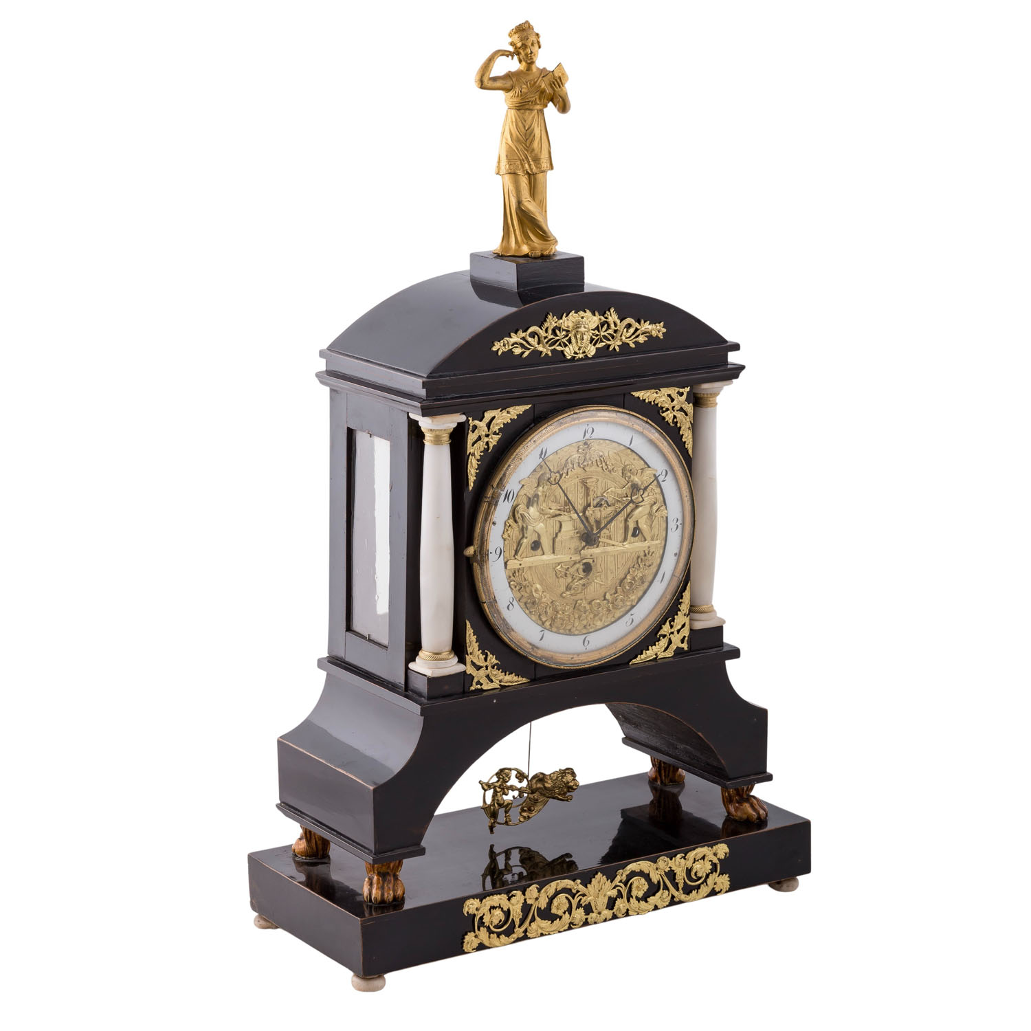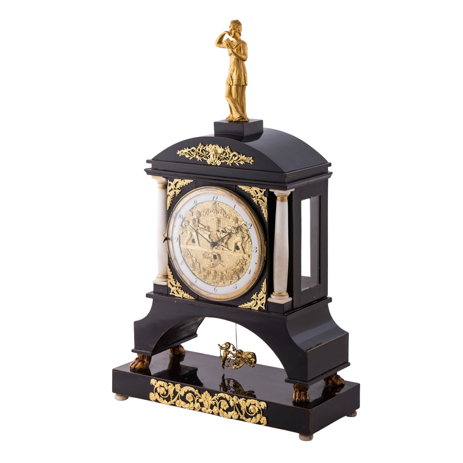 Österreich, um 1830, Weichholzgehäuse mit geschwärzter Furnierauflage, architektonische Gliederung mit dem zwischen zwei Alabastersäulen liegenden Ziffernblattautomat mit schmiedendem und schleifendem Putto, oben bekrönt durch eine figürliche Allegorie des Studiums (ergänzt). HxBxT: 64/39/16,5 cm. Leichte Alters- und Gebrauchsspuren, im Kurztest funktionstüchtig, Arm des Schmiedes ohne Funktion.