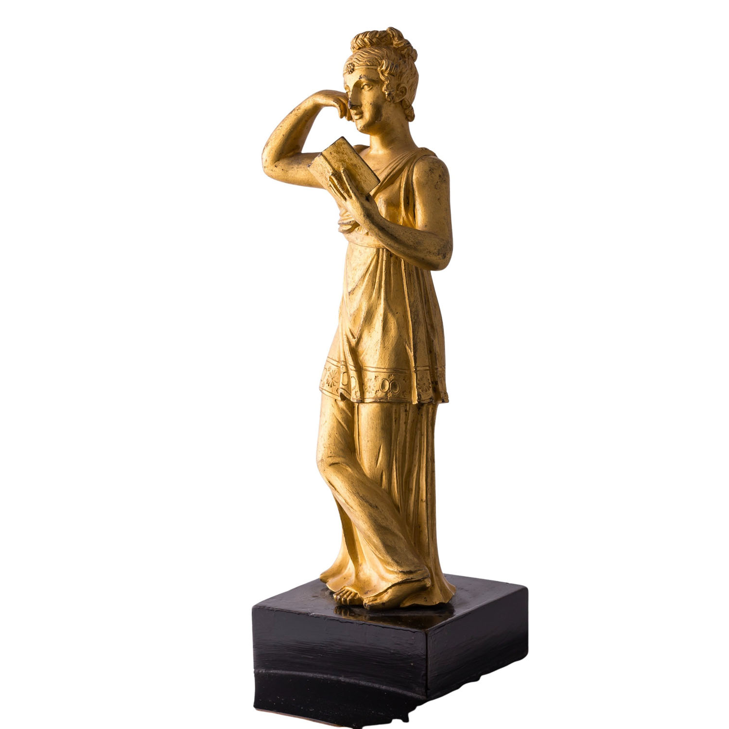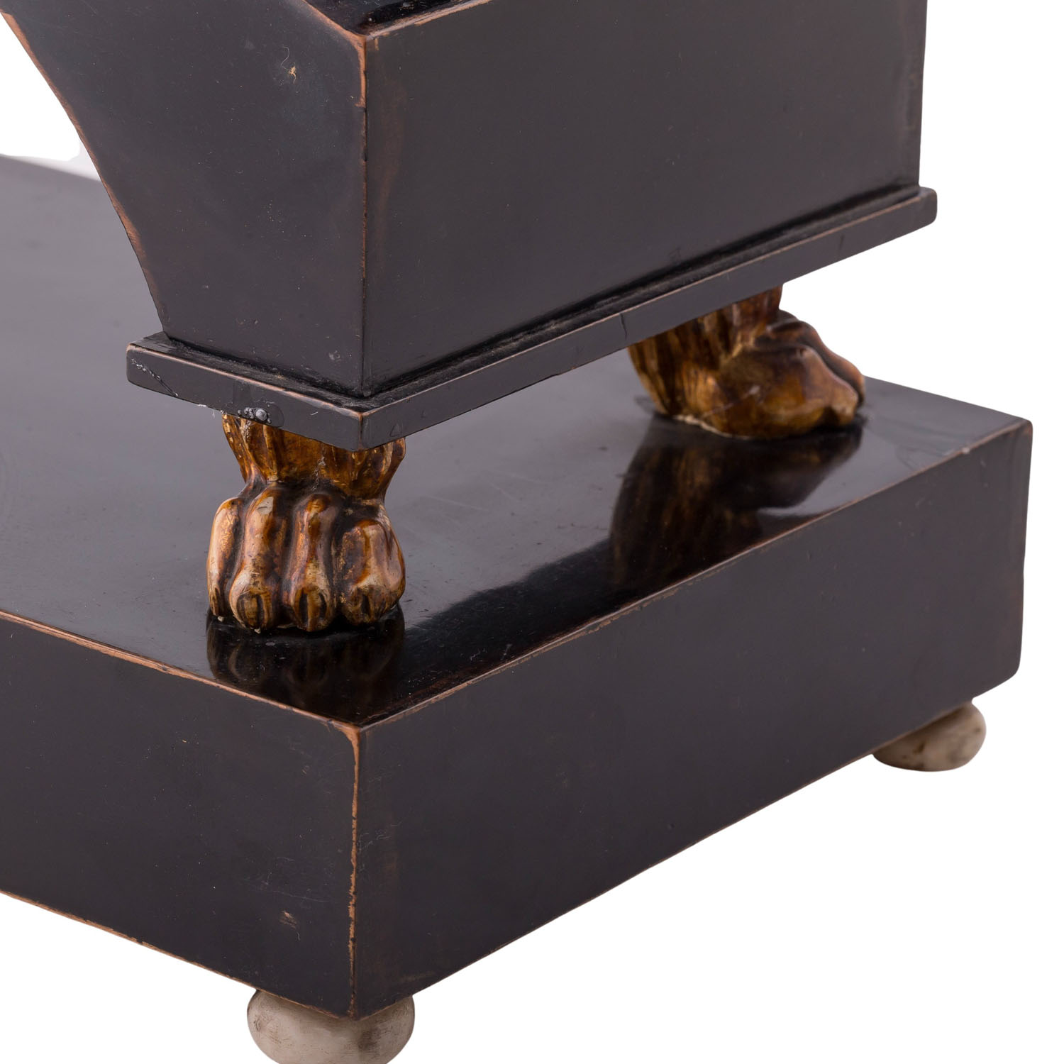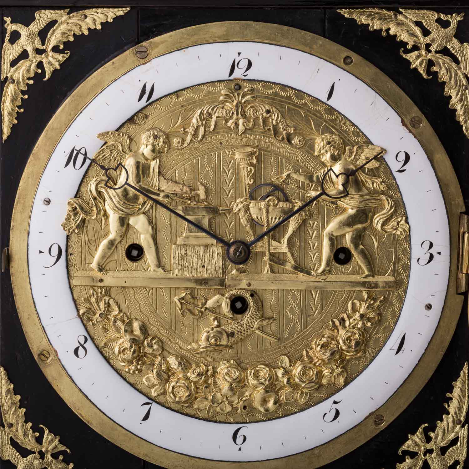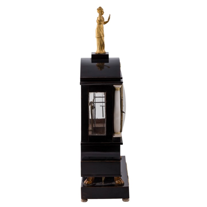 Österreich, um 1830, Weichholzgehäuse mit geschwärzter Furnierauflage, architektonische Gliederung mit dem zwischen zwei Alabastersäulen liegenden Ziffernblattautomat mit schmiedendem und schleifendem Putto, oben bekrönt durch eine figürliche Allegorie des Studiums (ergänzt). HxBxT: 64/39/16,5 cm. Leichte Alters- und Gebrauchsspuren, im Kurztest funktionstüchtig, Arm des Schmiedes ohne Funktion.