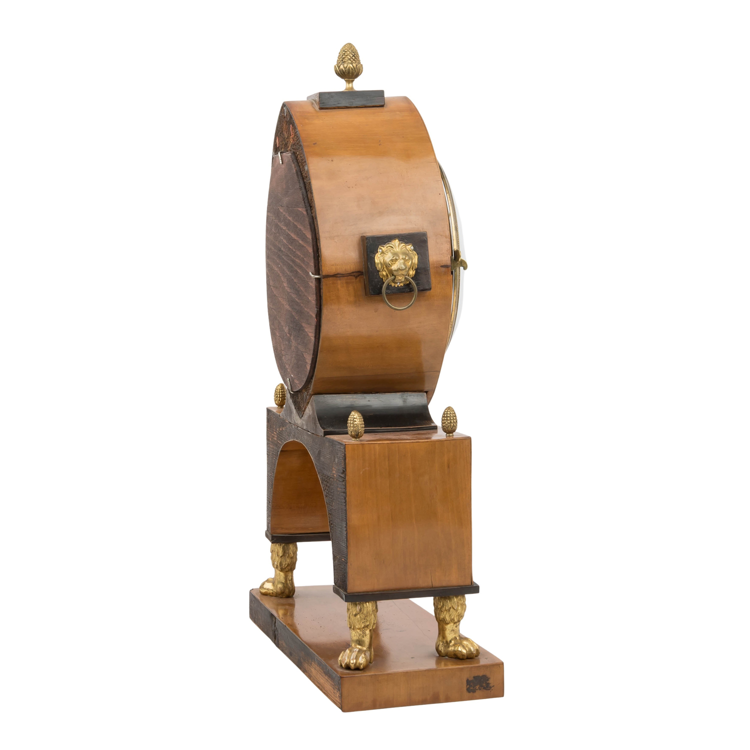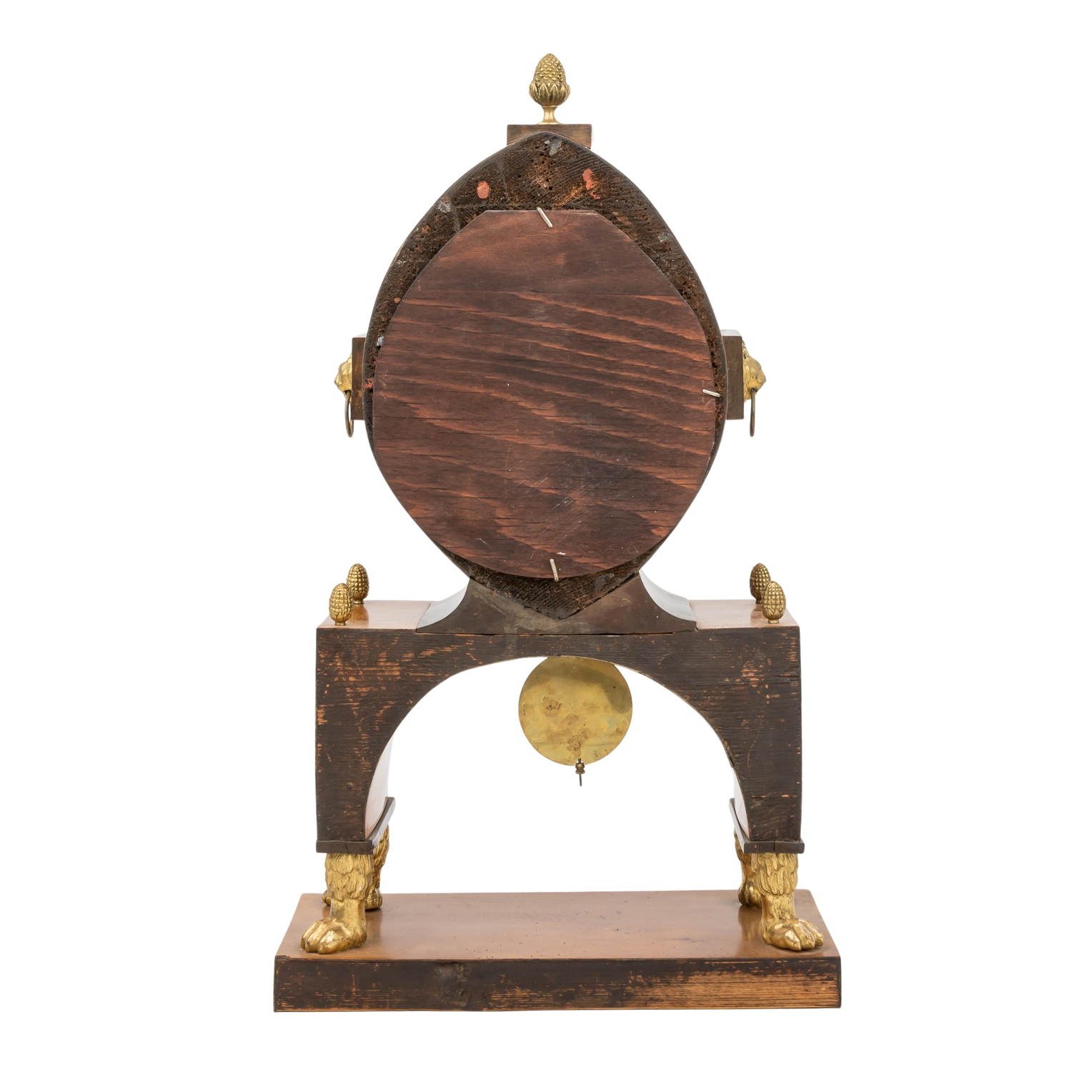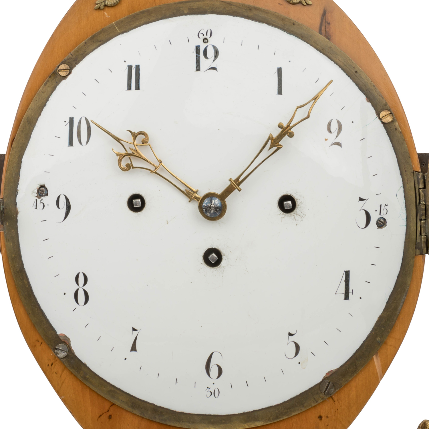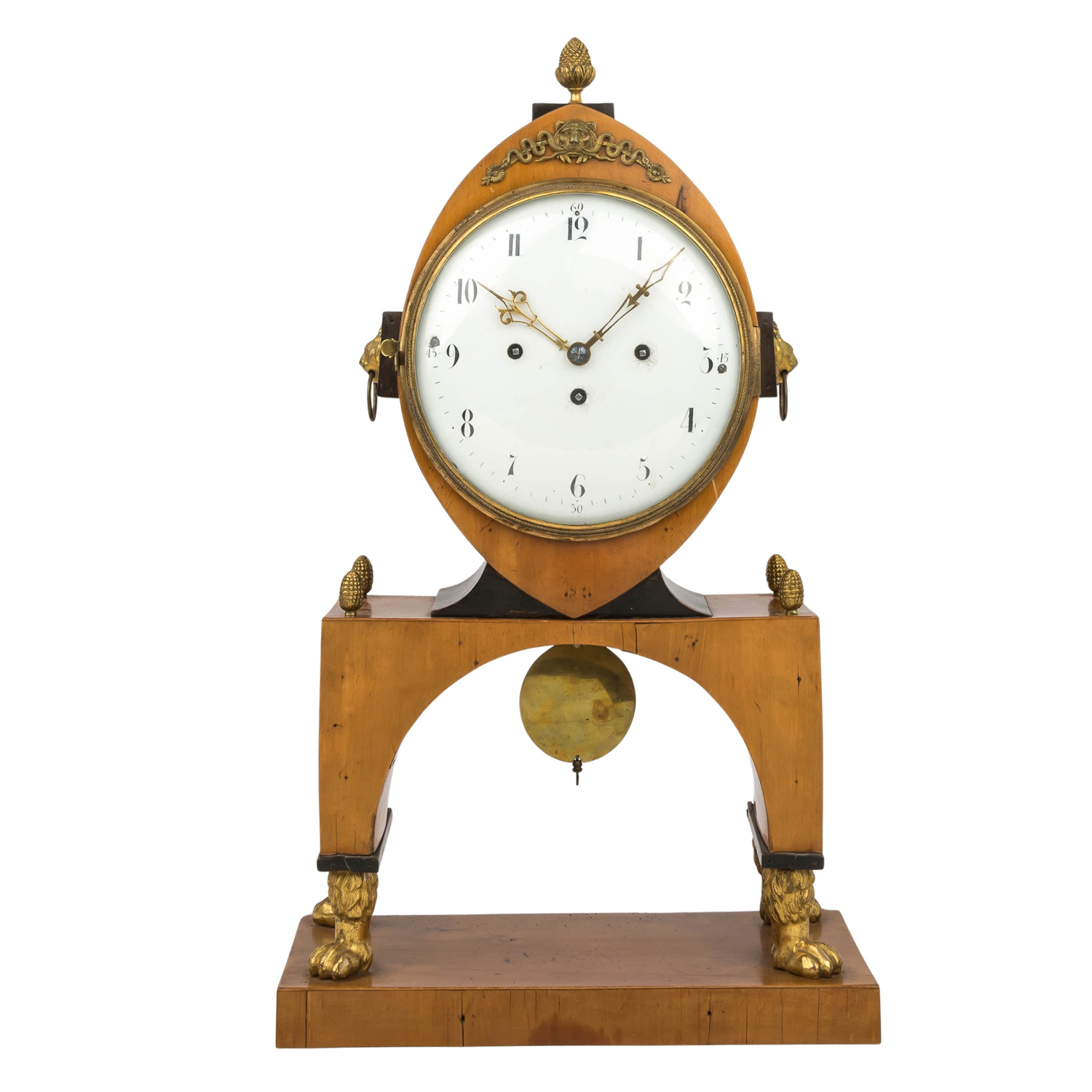 Österreich, um 1810-20, Weichholzgestell mit Nussholz furniert, auf hölzernen Tatzenfüßen und quadratischem Sockel ruhende Basis mit obenliegendem spitzovalem Uhrwerksgehäuse, zierende Messingapplikationen, frontseitig emailliertes Ziffernblatt, Werk mit Fadenaufhängung und Wiener 4/4 Schlag auf zwei Tonspiralen. HxBxT: 54/31/14 cm. Alters- und Gebrauchsspuren, Pendelaufhängung defekt.