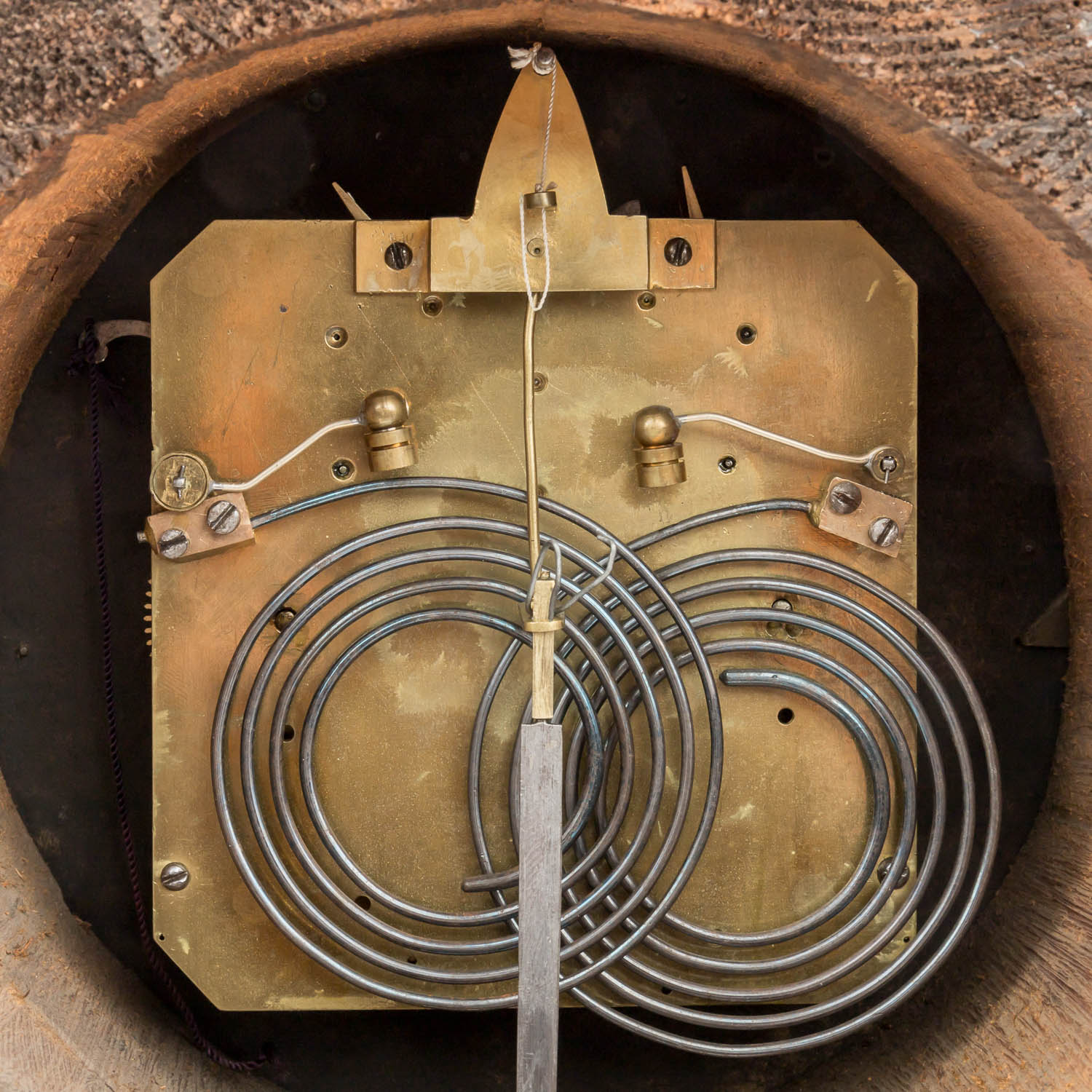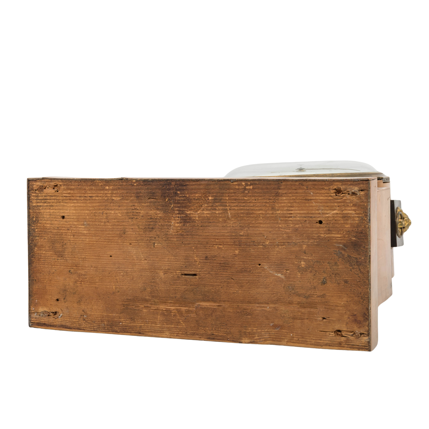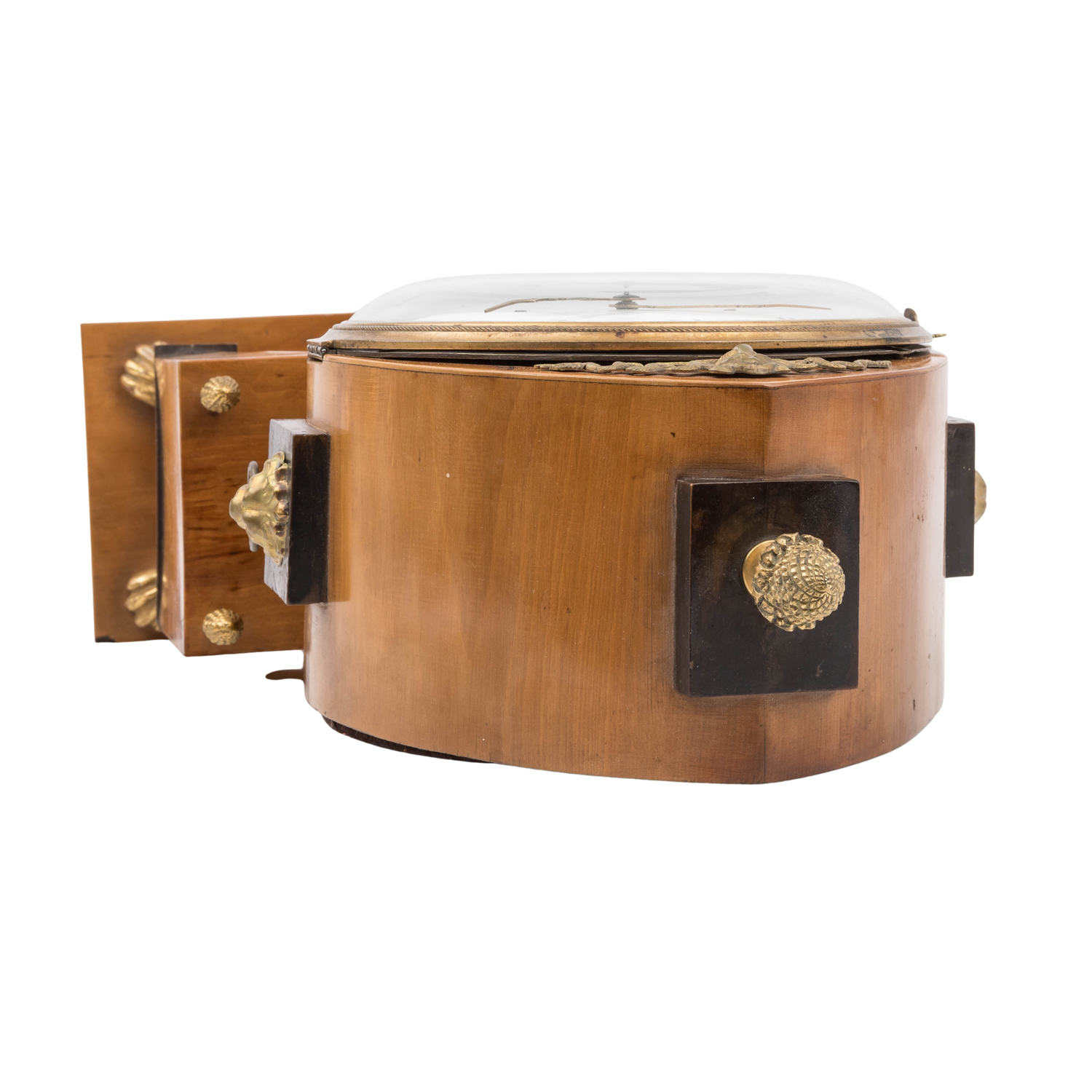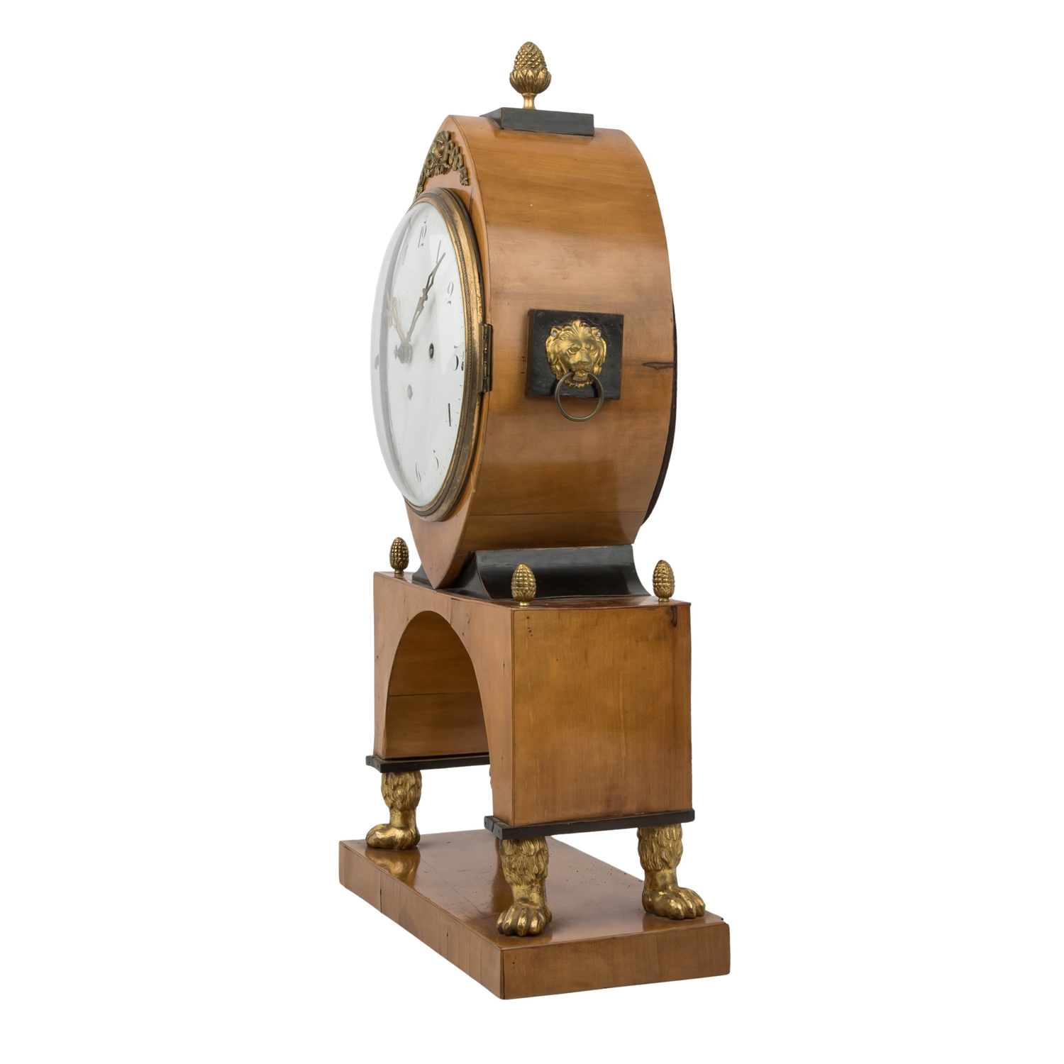 Österreich, um 1810-20, Weichholzgestell mit Nussholz furniert, auf hölzernen Tatzenfüßen und quadratischem Sockel ruhende Basis mit obenliegendem spitzovalem Uhrwerksgehäuse, zierende Messingapplikationen, frontseitig emailliertes Ziffernblatt, Werk mit Fadenaufhängung und Wiener 4/4 Schlag auf zwei Tonspiralen. HxBxT: 54/31/14 cm. Alters- und Gebrauchsspuren, Pendelaufhängung defekt.