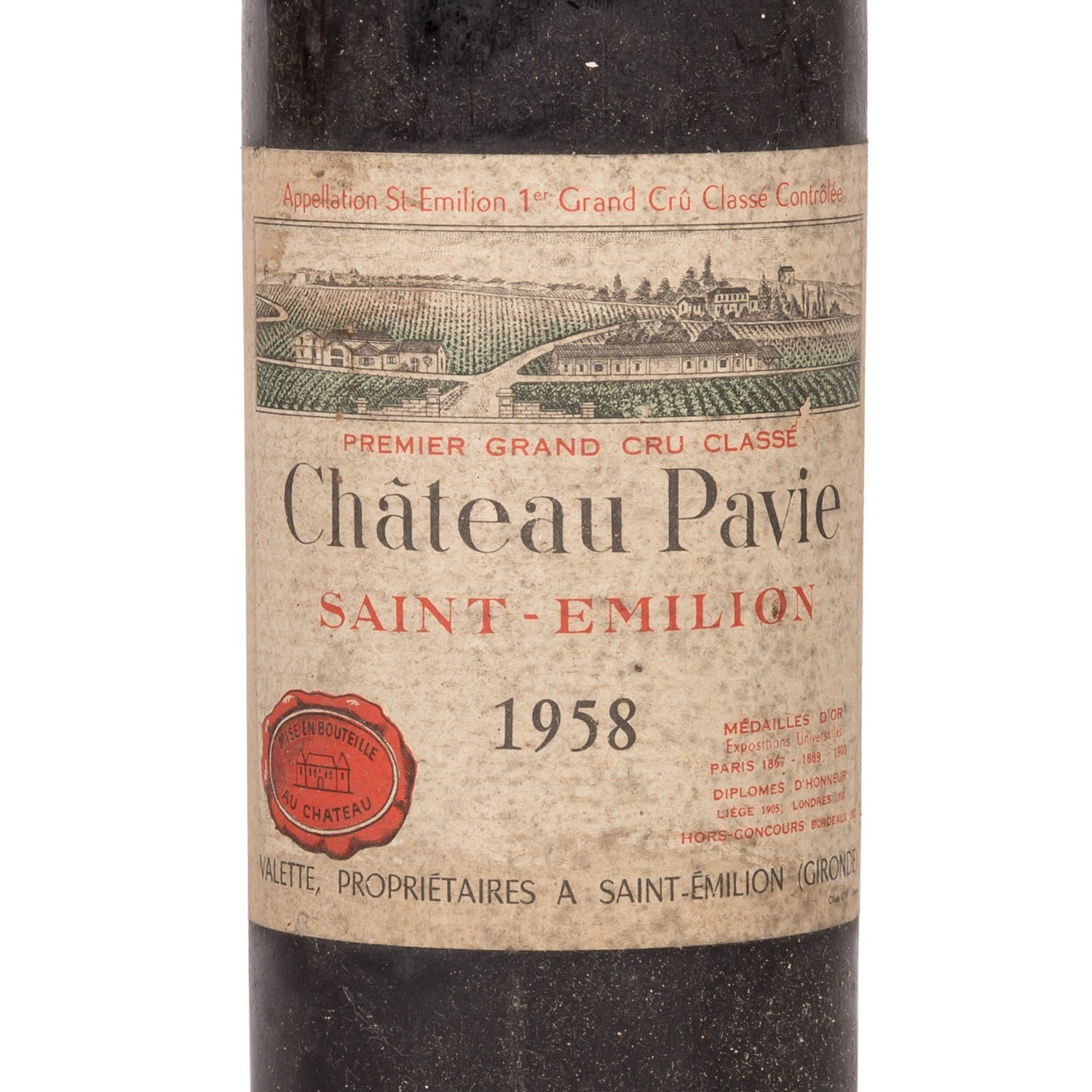 1958 CHÂTEAU PAVIE Saint-Emilion 1 bottle, 1er Grand Cru Classé, Bordeaux, France, 750 ml, 12.5% vol, level TS (top shoulder). Signs of age and storage. Label slightly damaged.