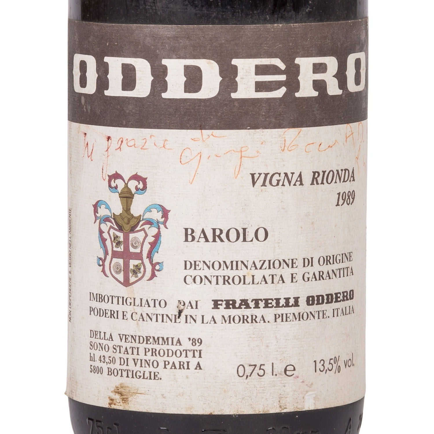 1989 BAROLO Fratelli Oddero 1 bottle, Piedmont, Italy, 750 ml, 13.5% vol., level IN (into neck). Signs of age and storage. Label rubbed and with personal dedication.
