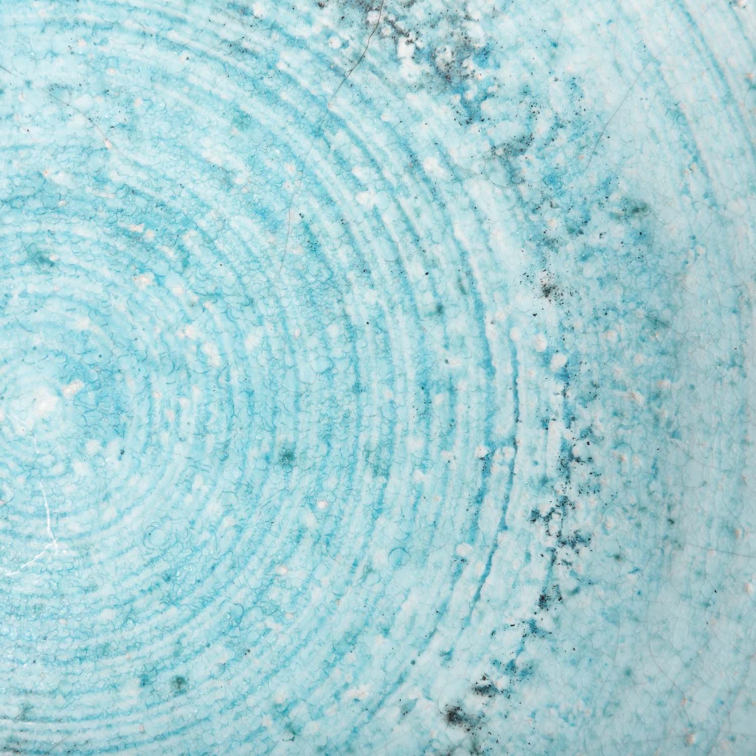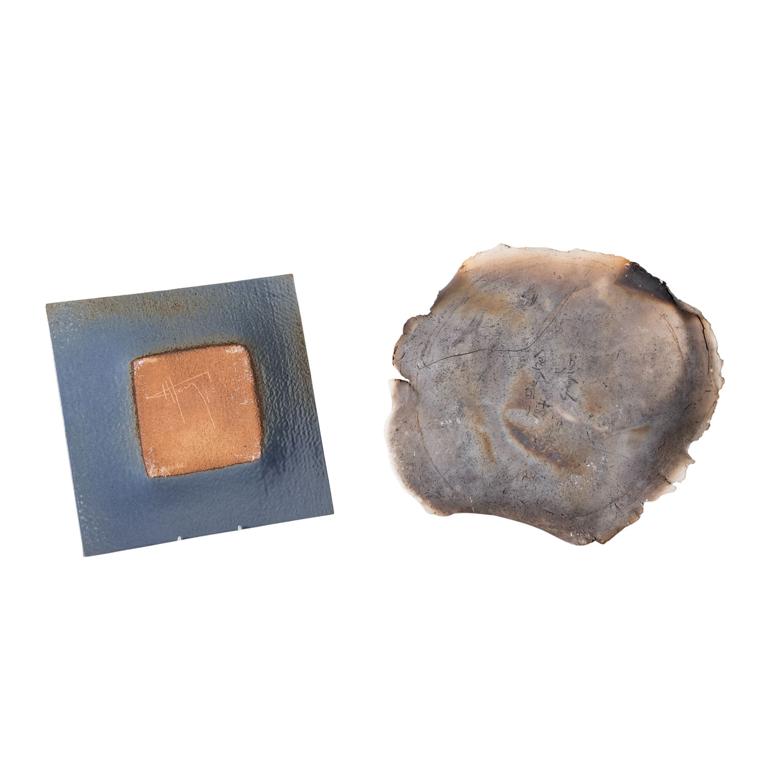 2 modern unique ceramic bowls, 20th century from various artists: 1.st) SILVIA.BEGHÉ. irregular round bowl in light turquoise, dated: 1987, d: approx. 34 cm. 2nd) 1 square, gray-blue bowl, 25x25.5 cm, illegibly signed.