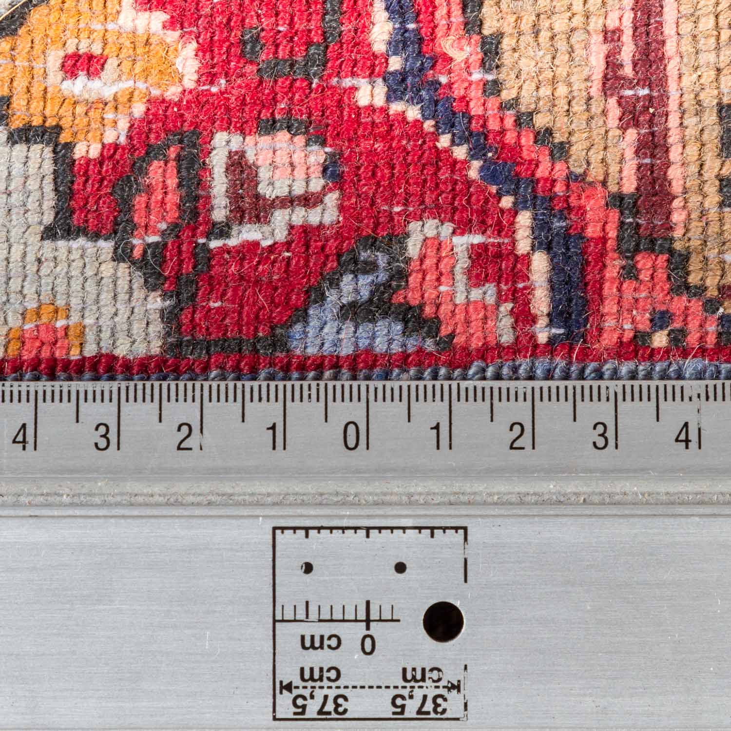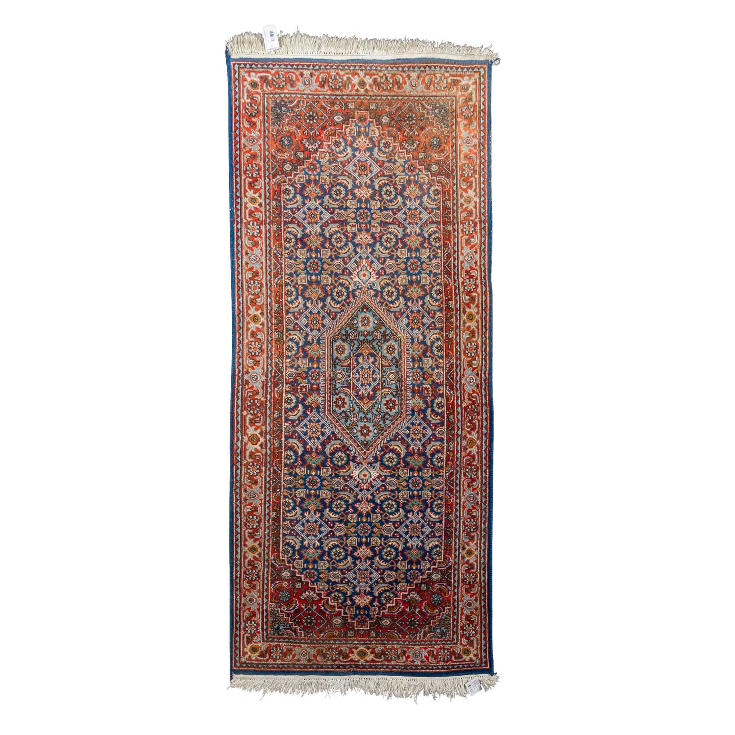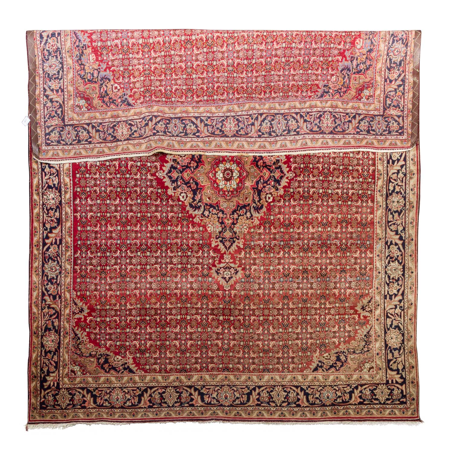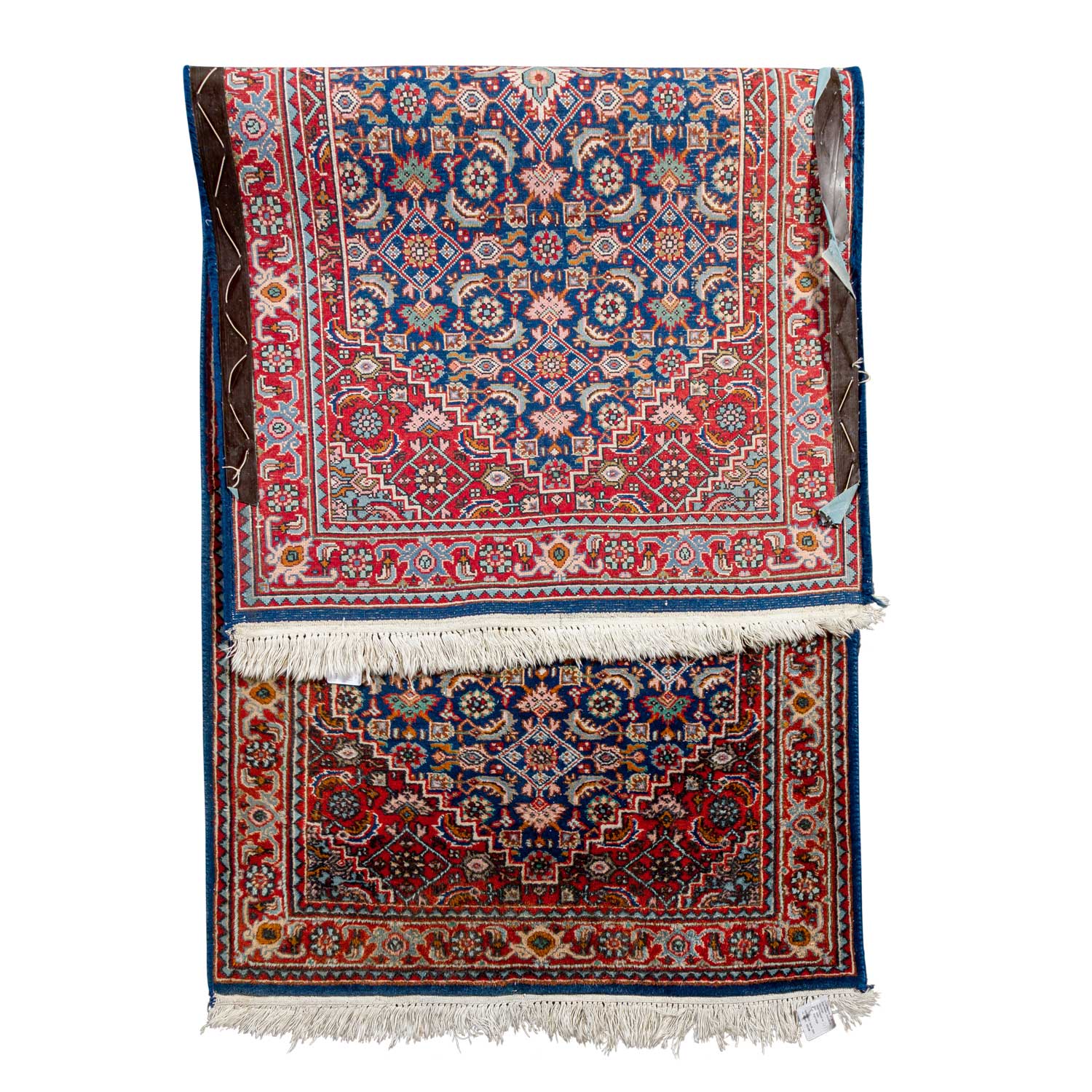 2 oriental carpets, 20th century: Bidjar/Persia, 342x258 cm, red-ground medallion carpet with diamond pattern, dark blue-ground main border. Comes with: Indian blue-ground bridge with Bidjar design, 180x76 cm. Signs of age and wear.