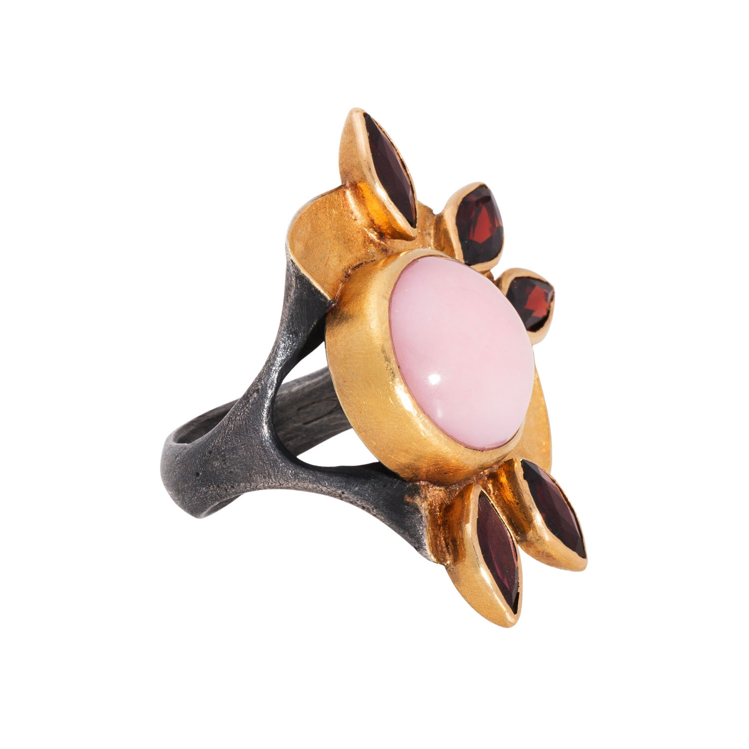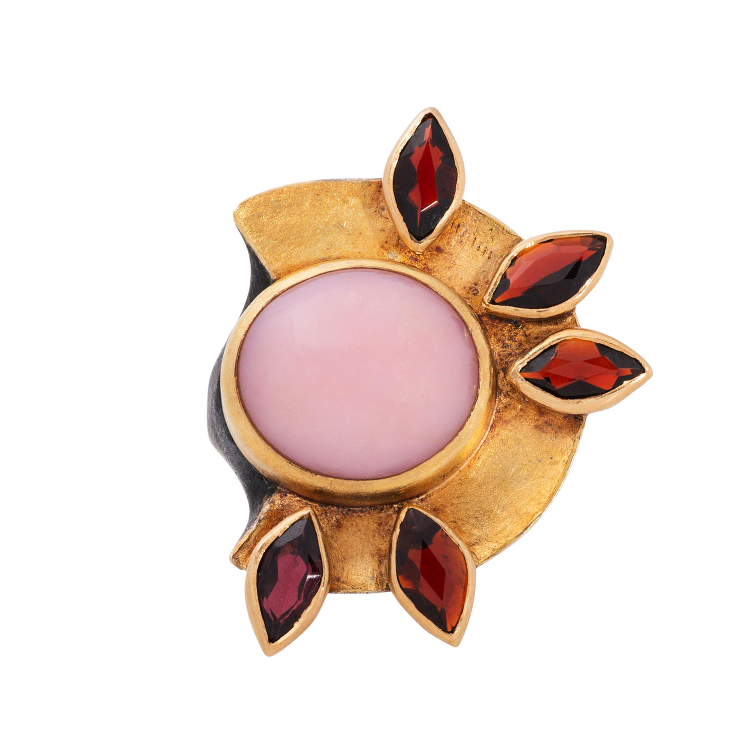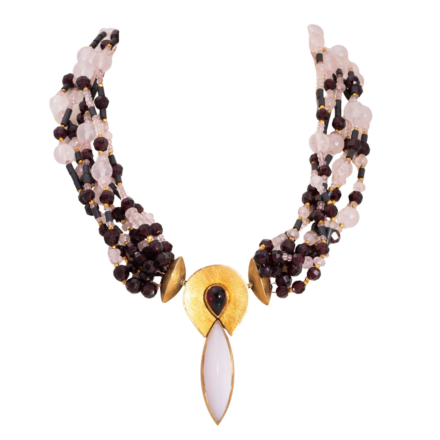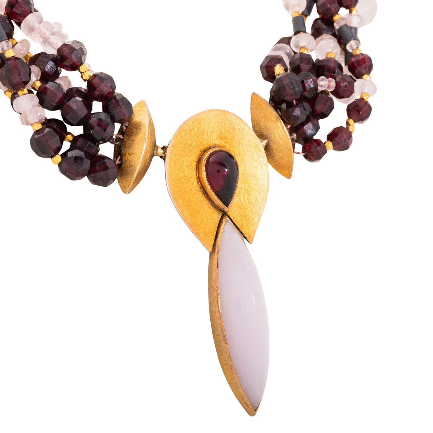 2 pc bundle ring and necklace with garnet, rose quartz, andenopal (ring), hematite and prob. hydrogrossular (pendant), silver gold plated, ring size 55, necklace L: ca. 47 cm, 21st century, mint condition.