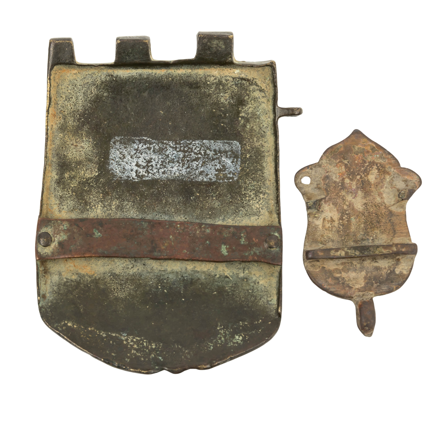 2 pieces of bronze jewelry. OSMANIAN: 1 pendant, h: 5 cm and 1 part of a two-part belt buckle, l: 8.5 cm. Each ornamentally decorated in relief and accentuated in color.