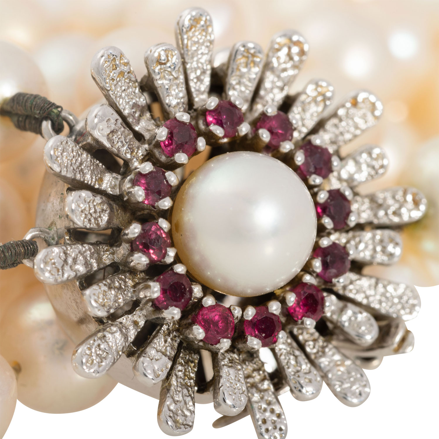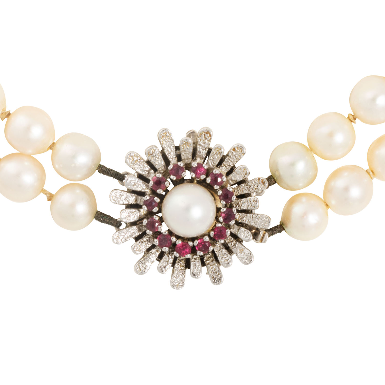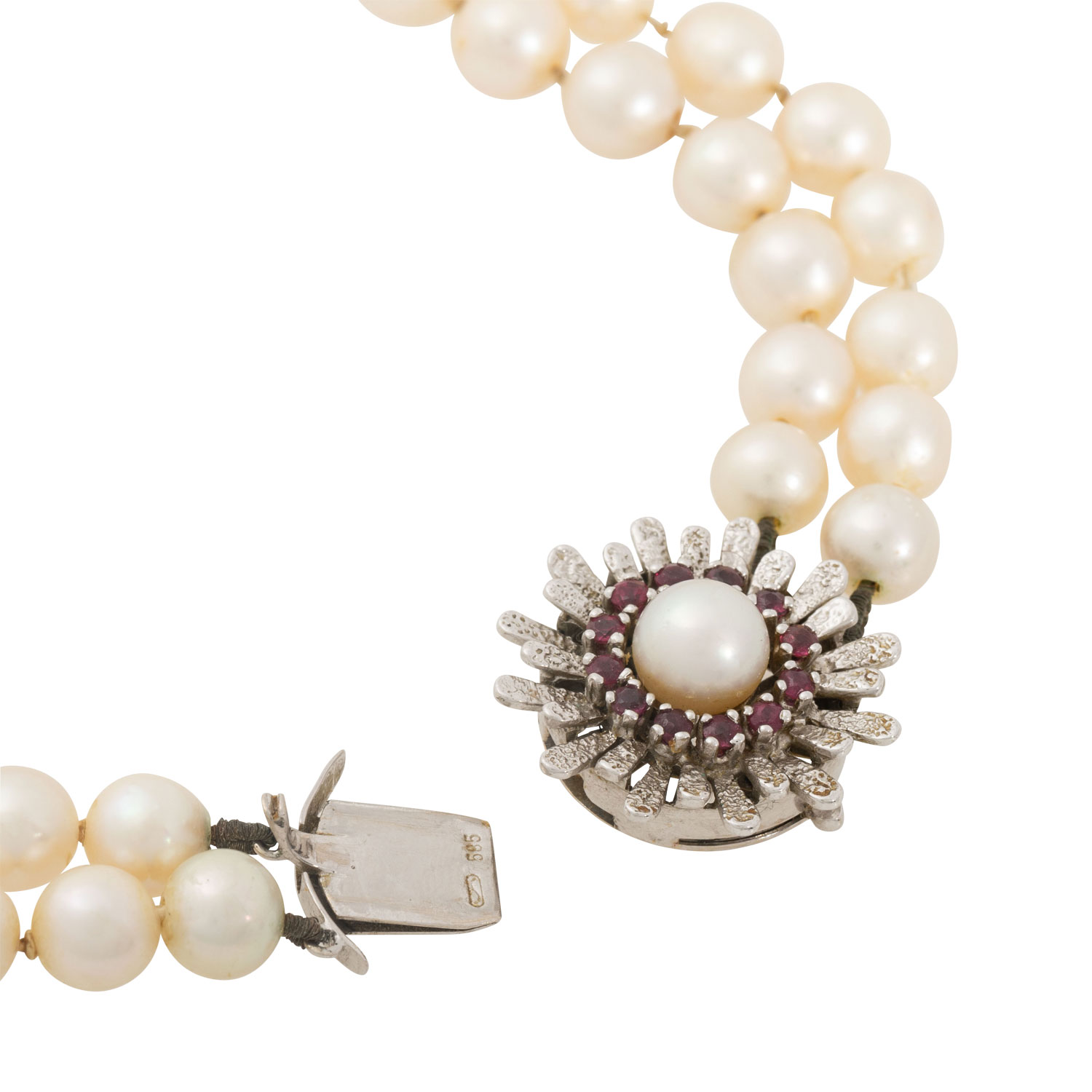 2 row cultured Akoya pearl necklace, 138 white - cream coloured pearls, surface characteristics, clasp in 14K white gold with 12 faceted round rubies, D: ap. 2 mm and white Akoya pearl, D: 7.7 mm, good lustre, box clasp with anti-skid device, totalling 82.6 g, L: 61 knoted, late 20th century, signs of wear.