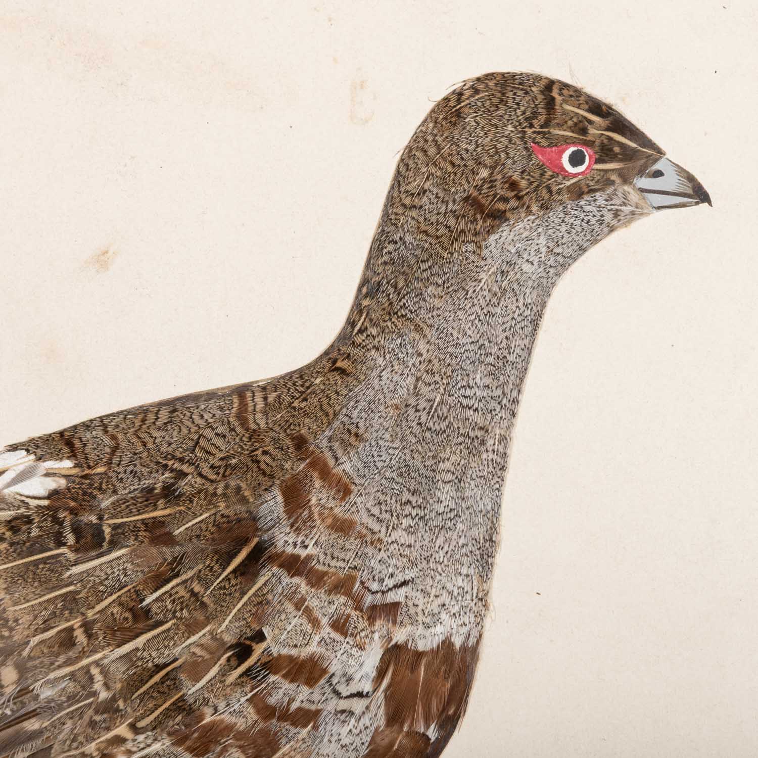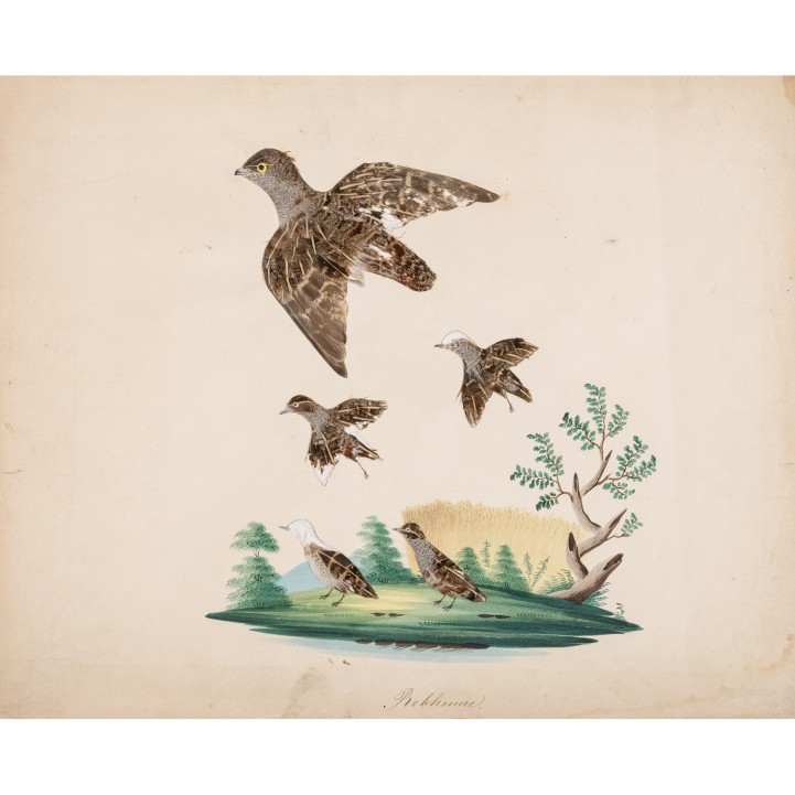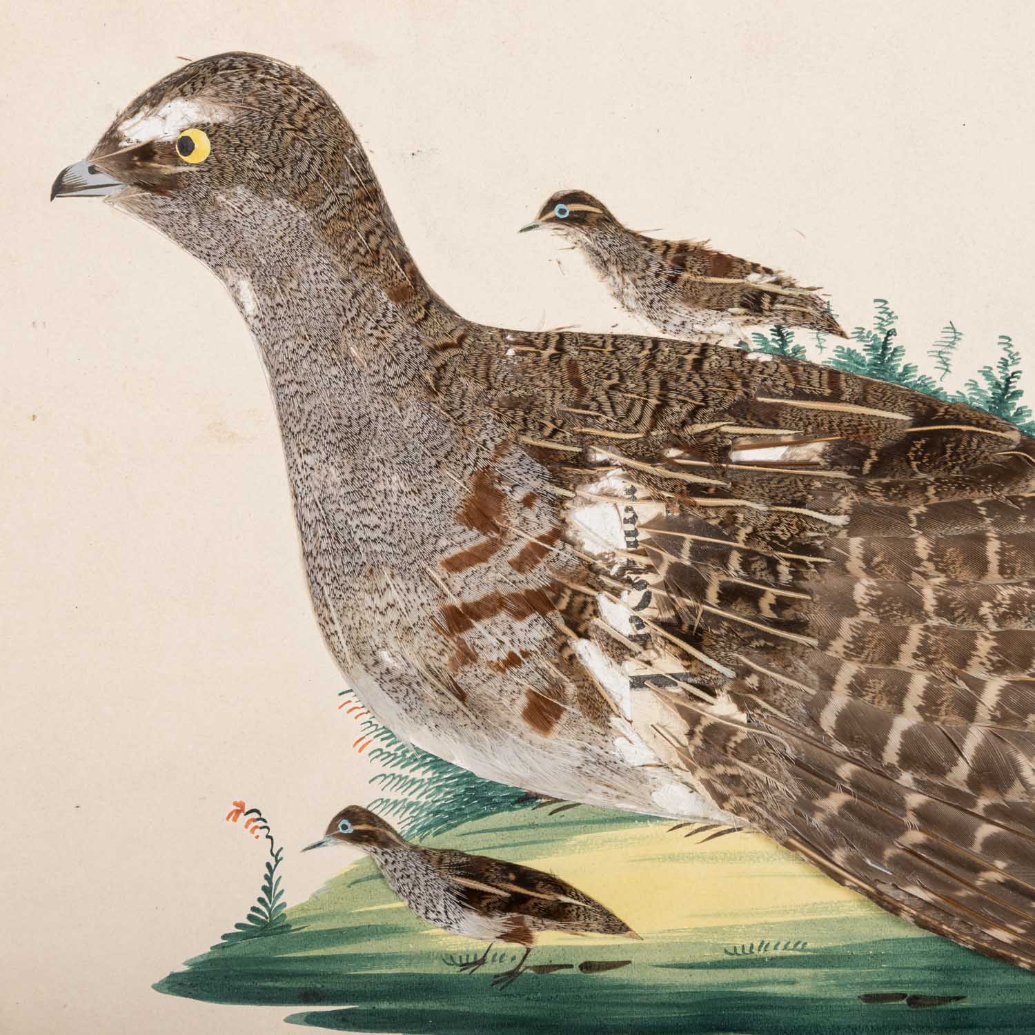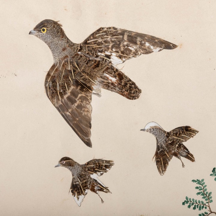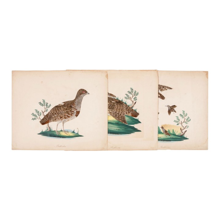 3 HUNTING COLLAGES with partridge motifs in landscape, 19th century, 1x partridge cock and 2x partridge hens, the depictions of the birds collaged with feathers, the landscape in gouache on paper, HxW: each sheet approx. 34x42 cm. Signs of age and creases, browned and stained, partially damaged.