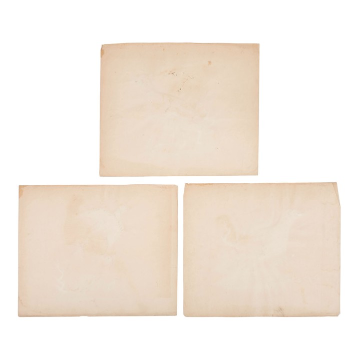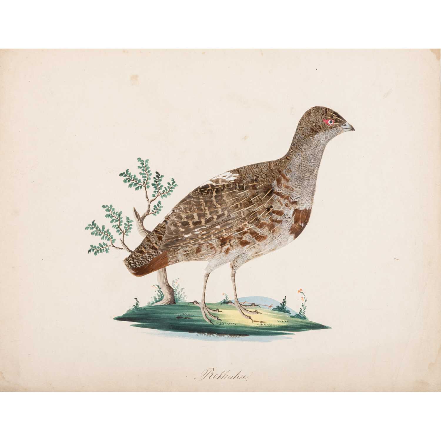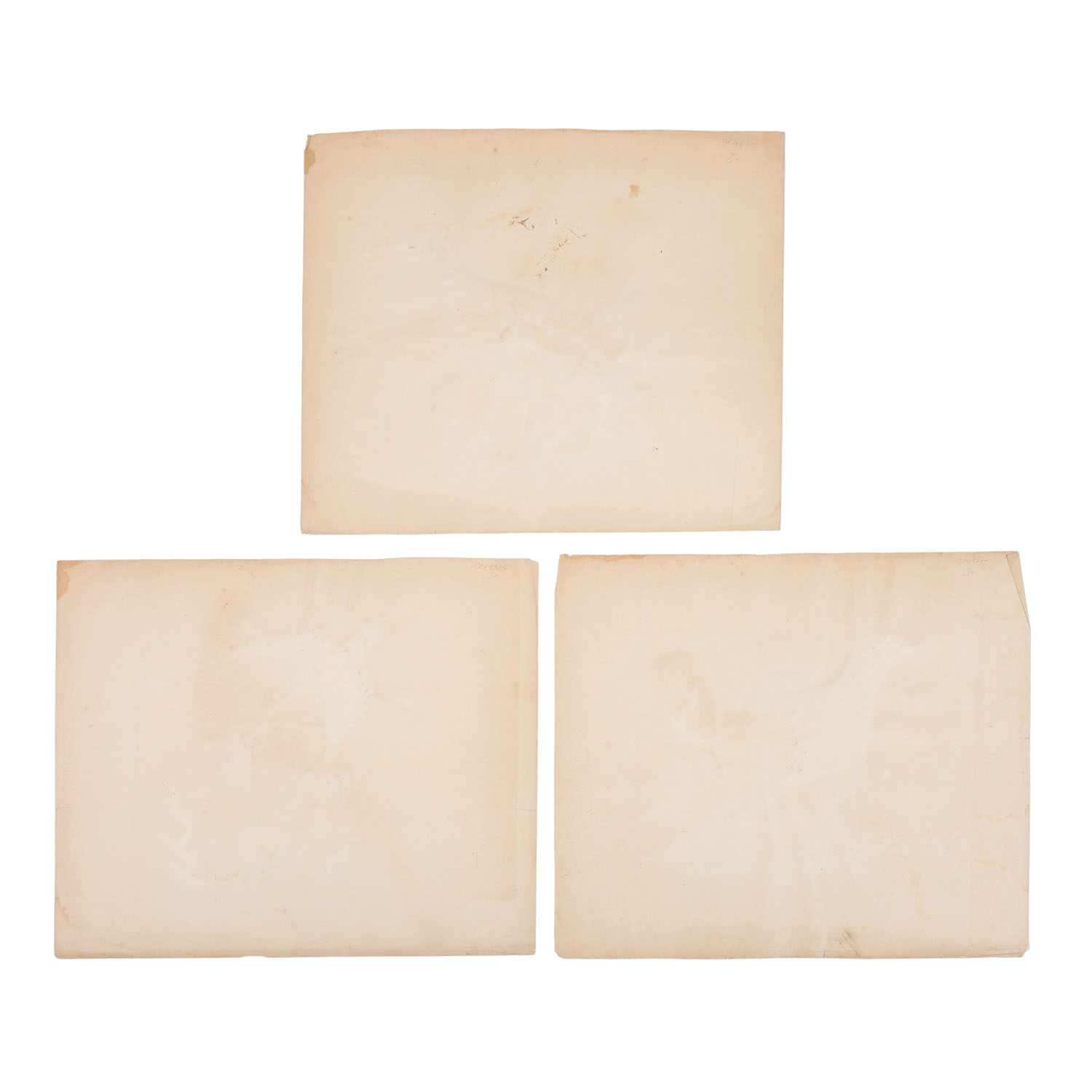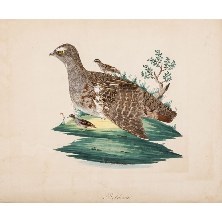 3 HUNTING COLLAGES with partridge motifs in landscape, 19th century, 1x partridge cock and 2x partridge hens, the depictions of the birds collaged with feathers, the landscape in gouache on paper, HxW: each sheet approx. 34x42 cm. Signs of age and creases, browned and stained, partially damaged.