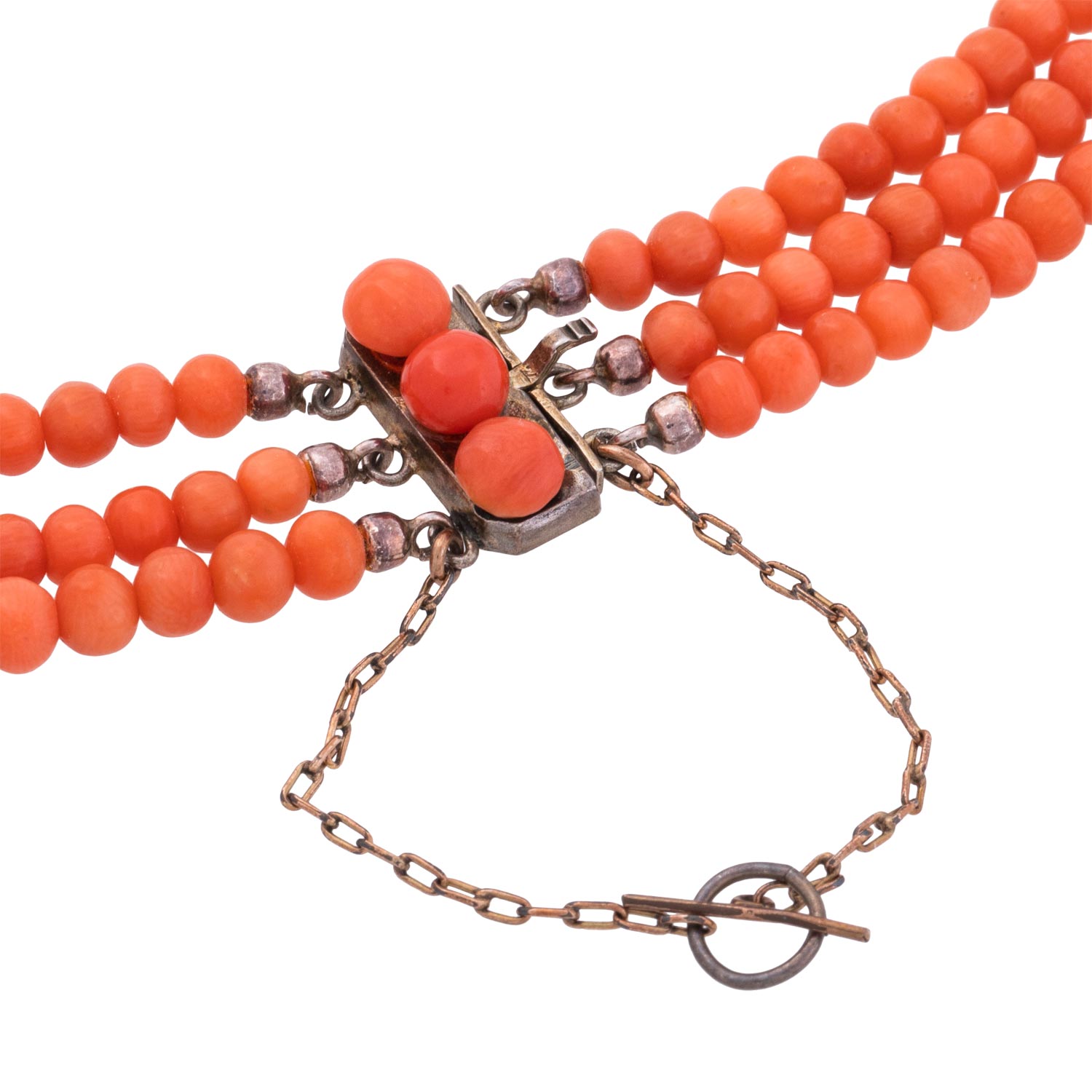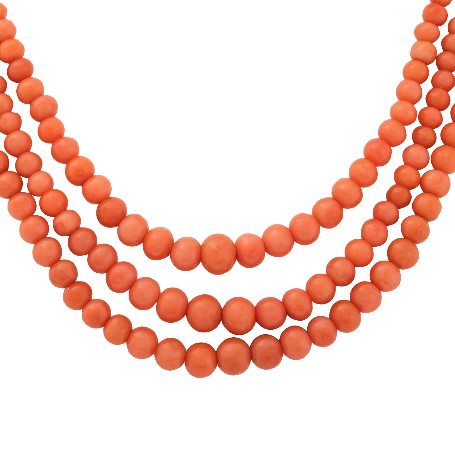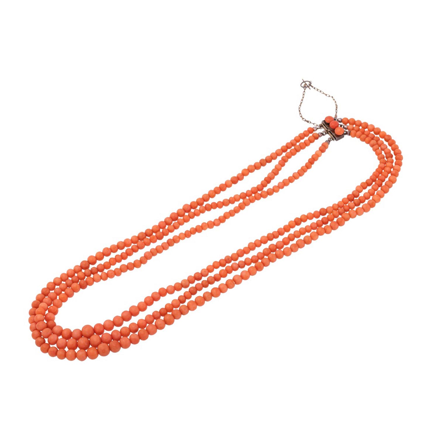 3-row coral necklace, beads graduating from ca. 4-7.7 mm, clasp silver, 55.3 gr, L: ca. 46 cm, early 20th century, signs of wear. IMPORT/EXPORT RESTRICTIONS OUTSIDE THE EU!