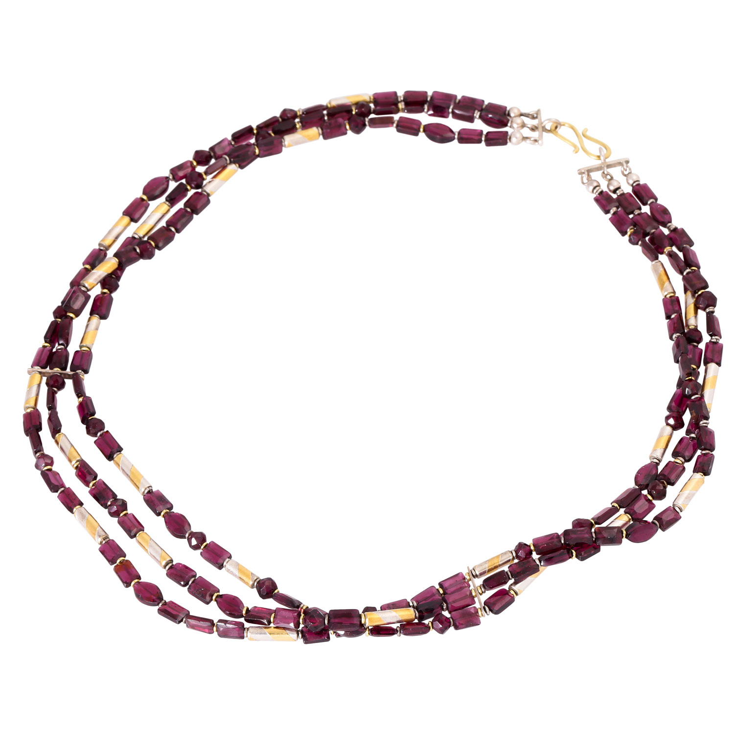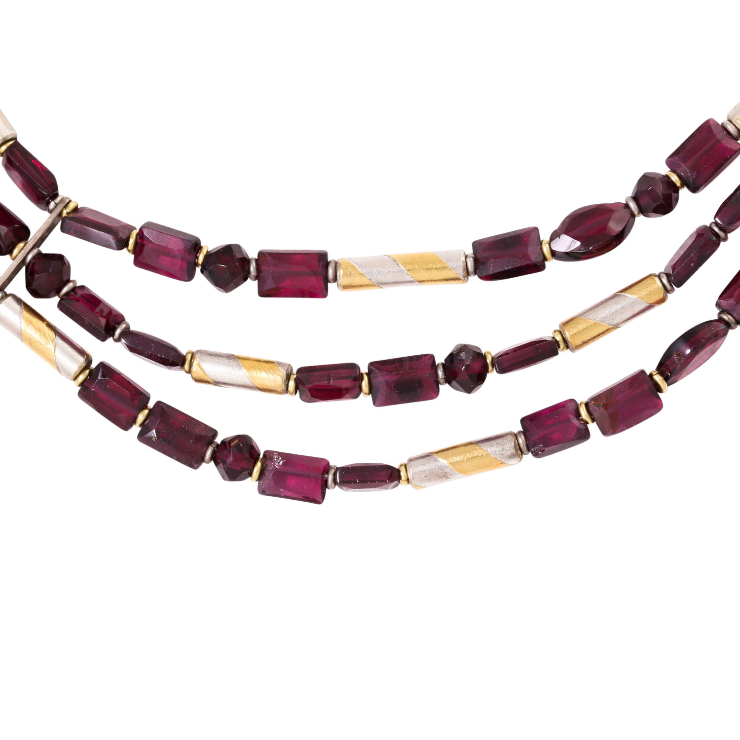 3-row garnet necklace (rhodolilte) with parts made of silver with gold 18K, claps 18K YG, 44.7 gr, L: ca. 45 cm, 21st century, signs of wear.