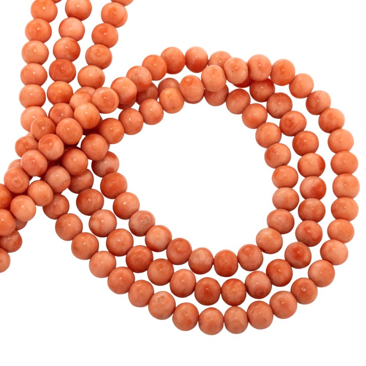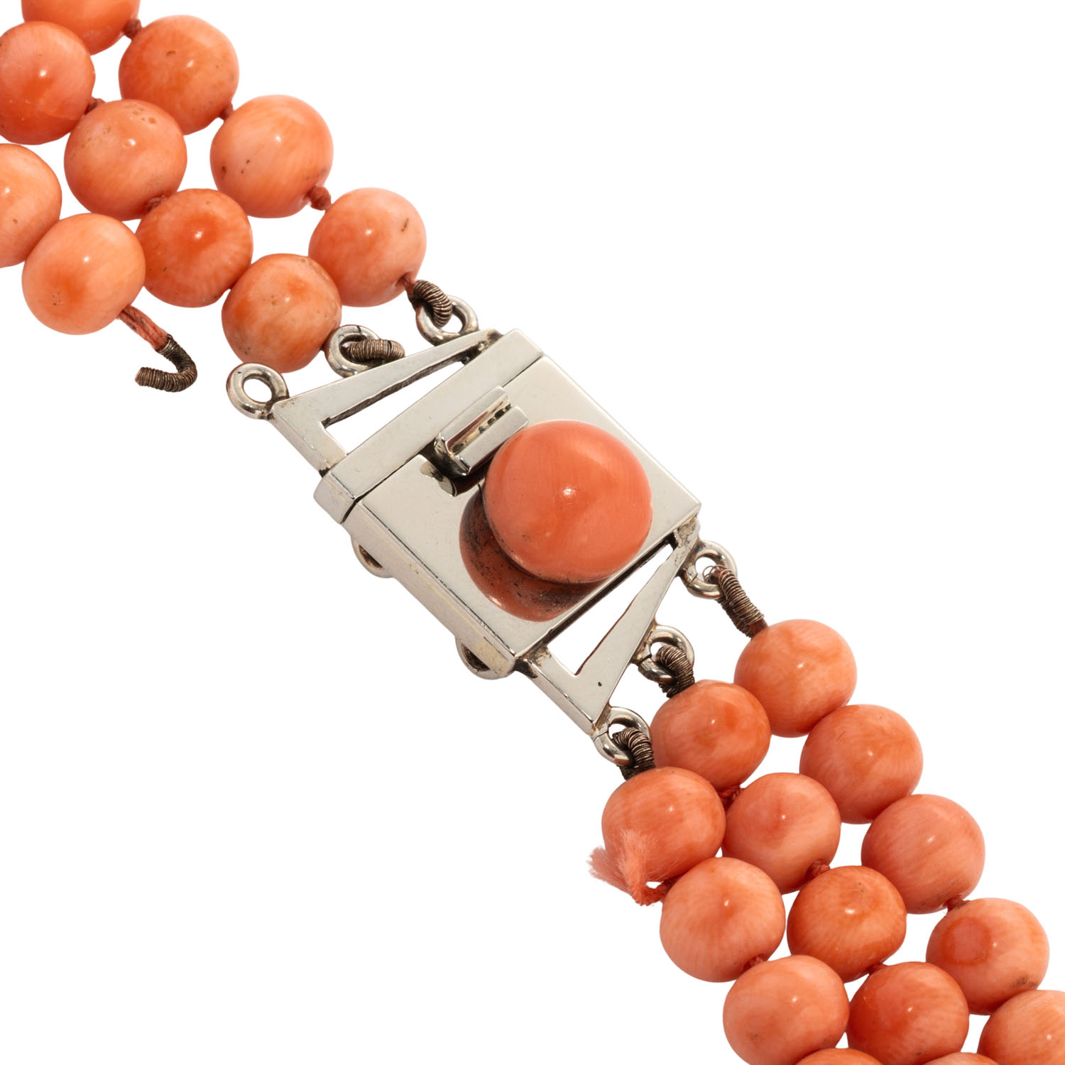 3-row necklace of corals 6 mm, L: 40 cm, handcrafted clasp of 18K white gold, with coral bouton, 2nd half of 20th century, 1 row at one side loose, necklace should be threaded new, corals in good condition. NO SHIPPING OUTSIDE THE EU!