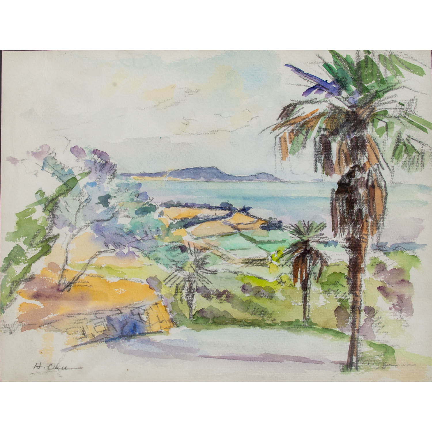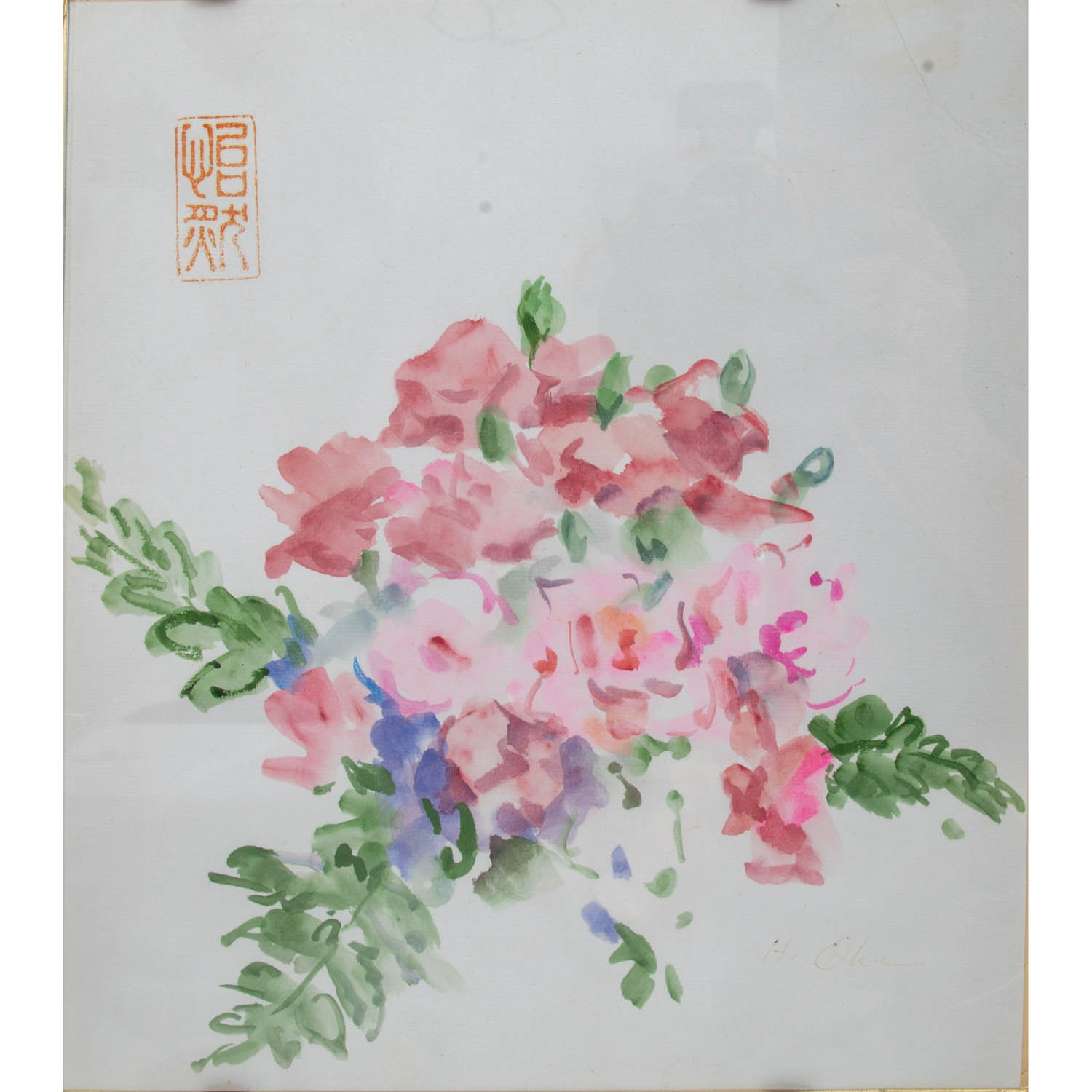 3 small framed pictures, JAPAN and INDIA-PERSIA: 1.) HACHIRO OKU (b. 1927) Watercolor of a landscape, 26x34 cm. 2.) Flower painting, 27x24 cm 3.) Indo-Persian relief picture of a scene with 3 figures, 30x24 cm. Frame partly damaged.