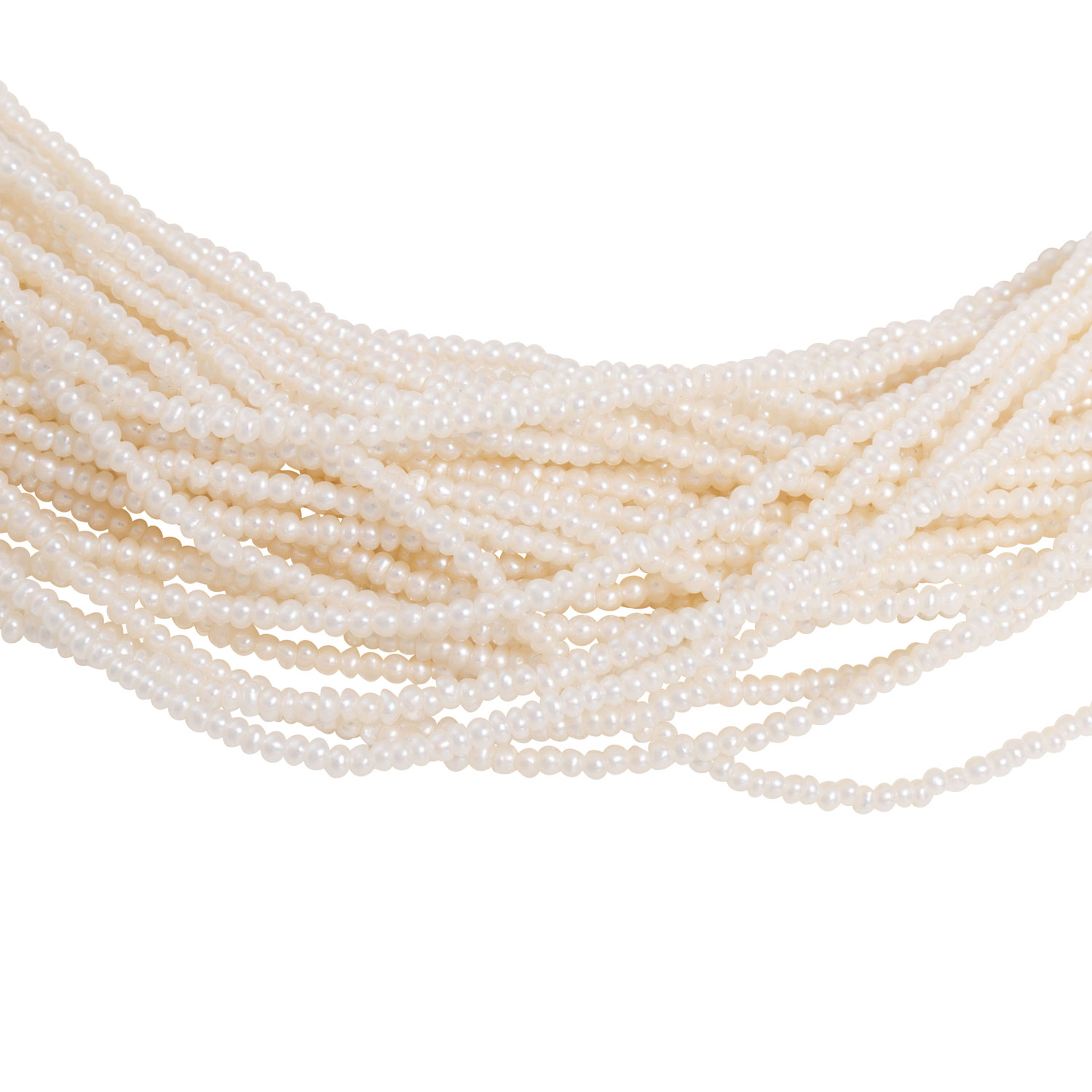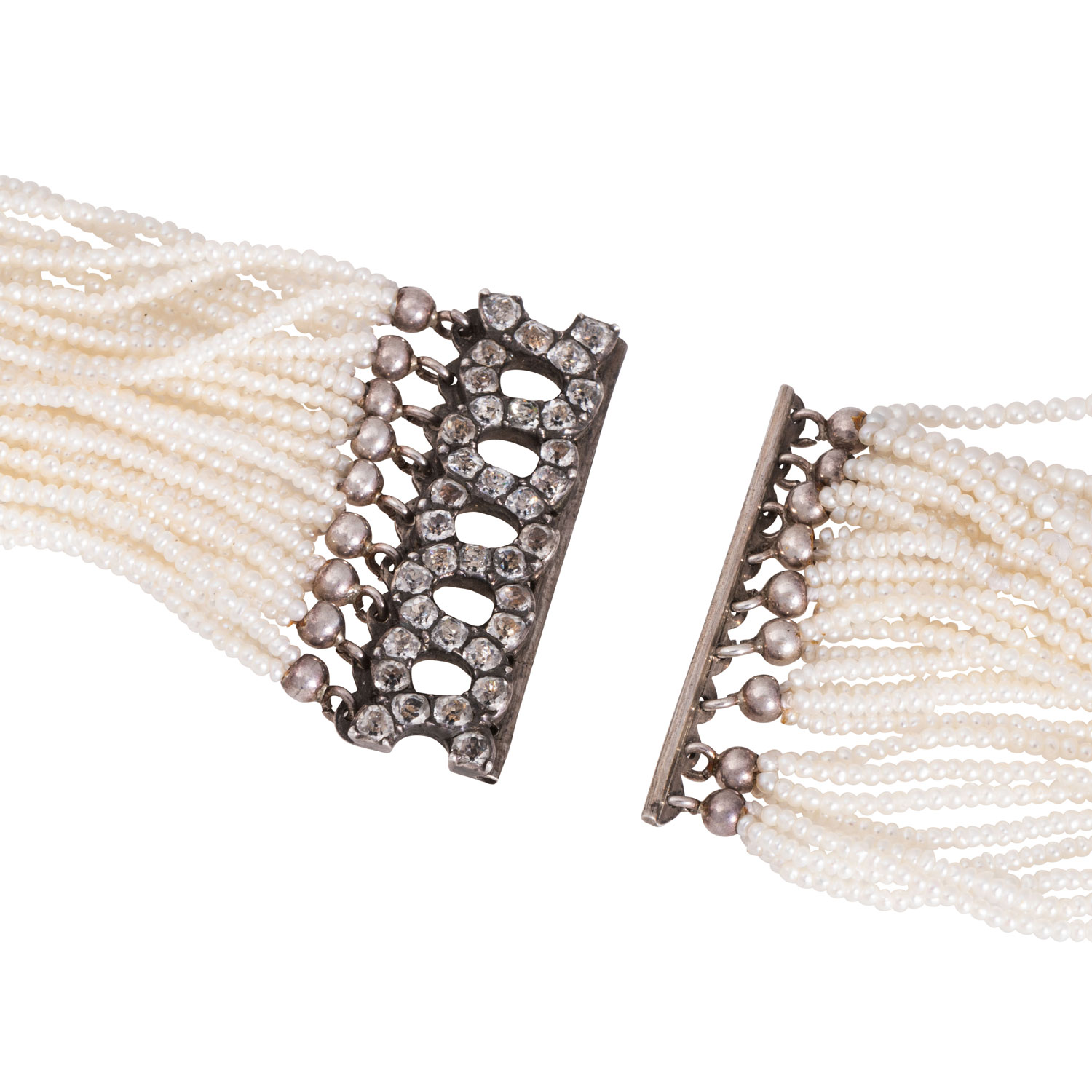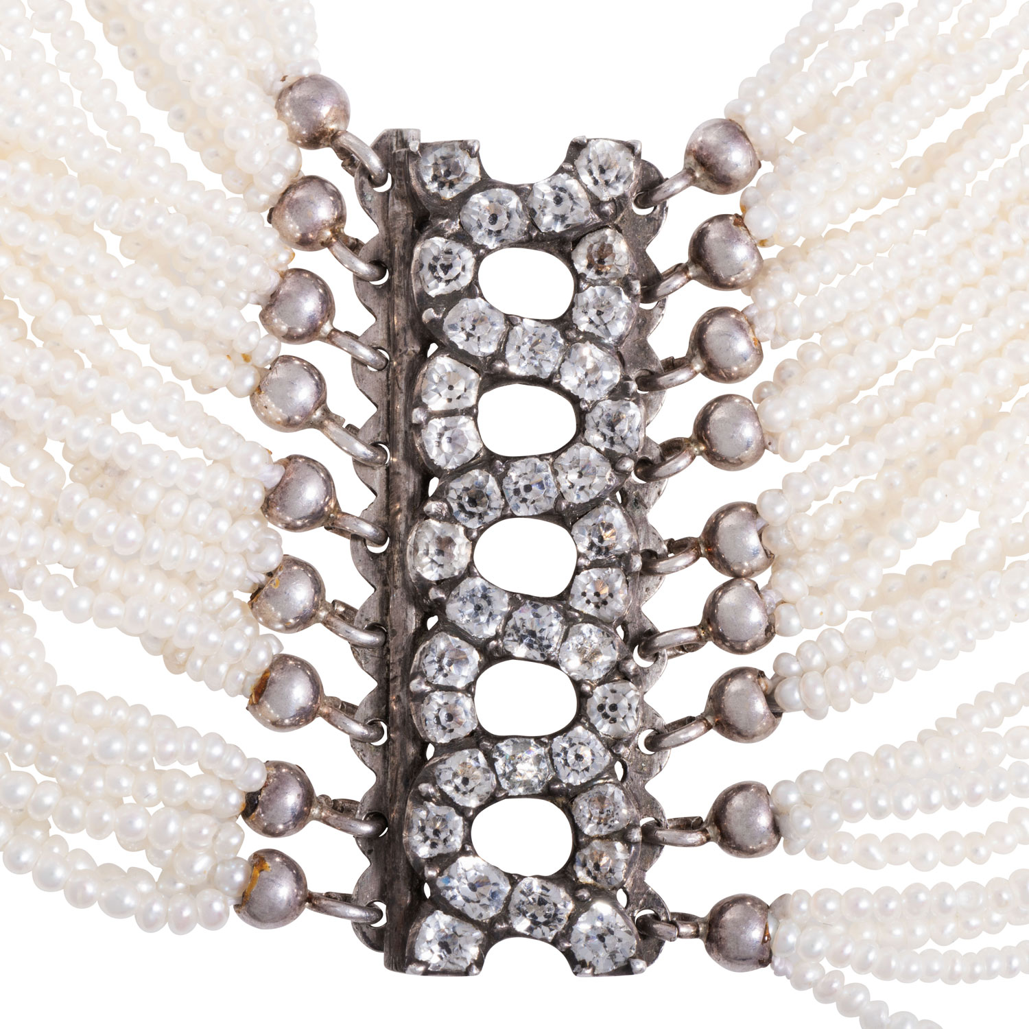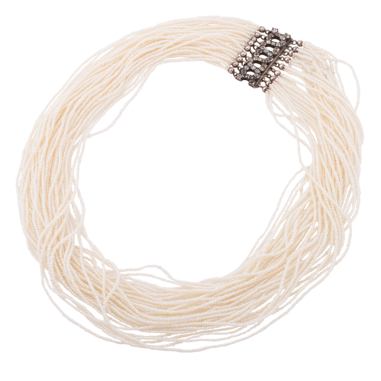 Seed pearl necklace, 36-row, d.: approx. 1.5 mm, 800 silver clasp, gilded, colourless imitation stones, round-cut, total weight 44.6 g, l.: approx. 41 cm, 1st half of 20th century, good condition.