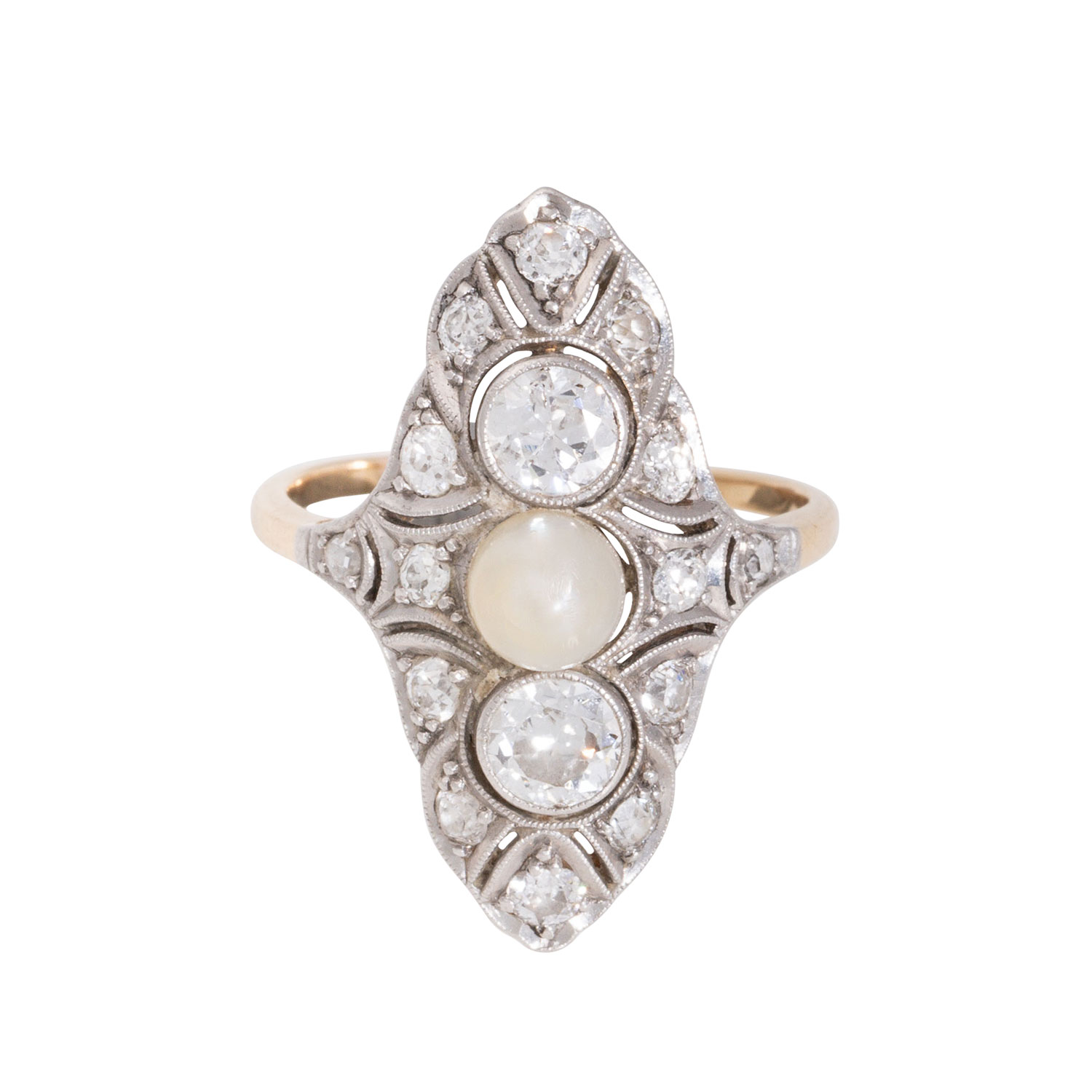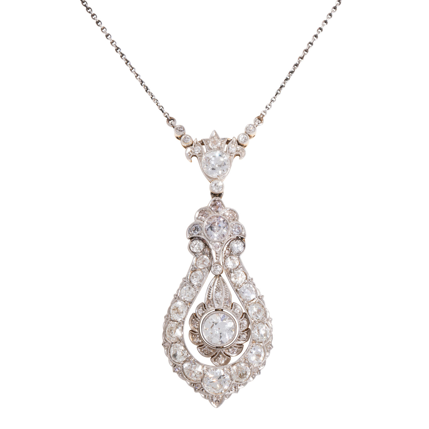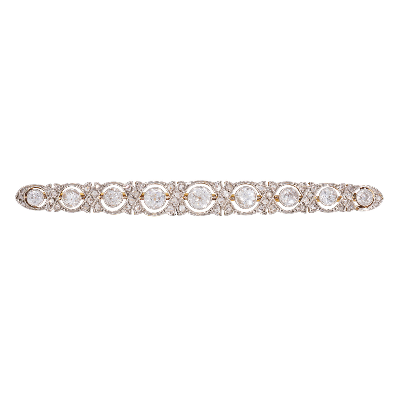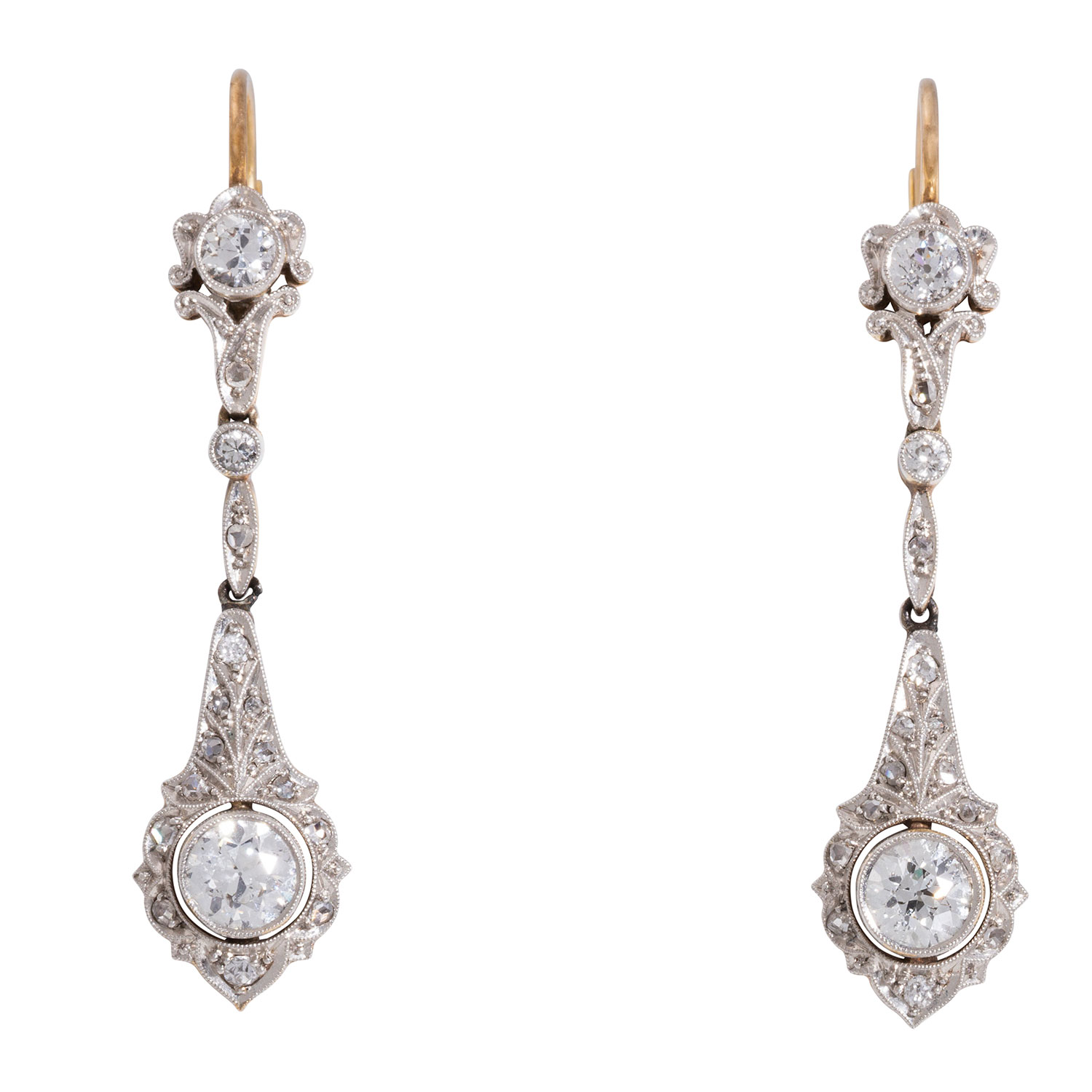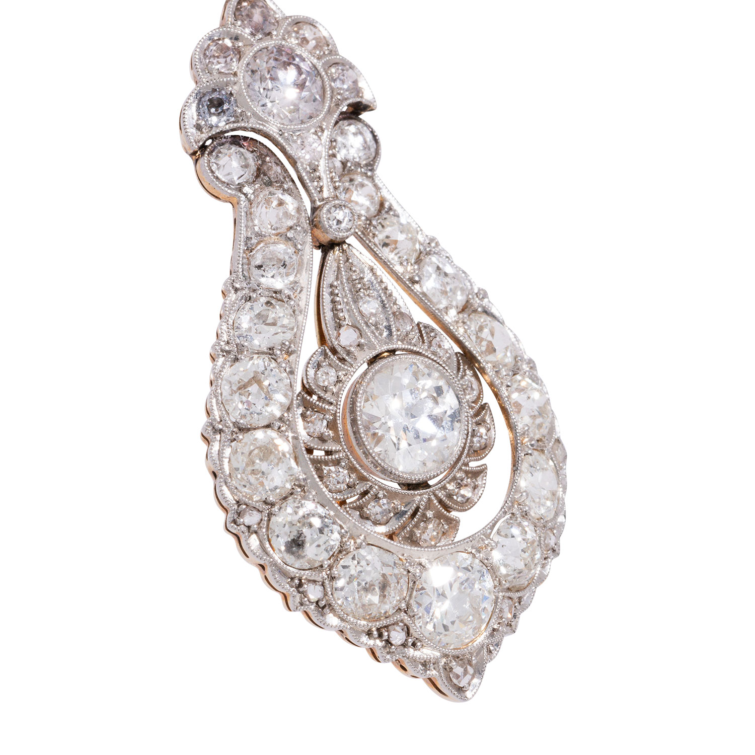 4 pc Belle Époque jewellery set: necklace (L: ca. 44 cm, ca. 9.5 gr), ear hangers (L: ca. 4.5 cm, ca. 5.4 gr), ring (size 50, 3.5 gr) and brooch (L: ca. 6.5 cm, 6.4 gr), set with numerous old-cut diamonds totalling ca. 9.8 ct of which largest stone ca. 0.8 ct, all stones ca. WHITE-STW (H-J)/VS-I1, 14K YG, face side platinum, 1910s, good condition consistent with age, incl. case for necklace a. ear hangers (not original).