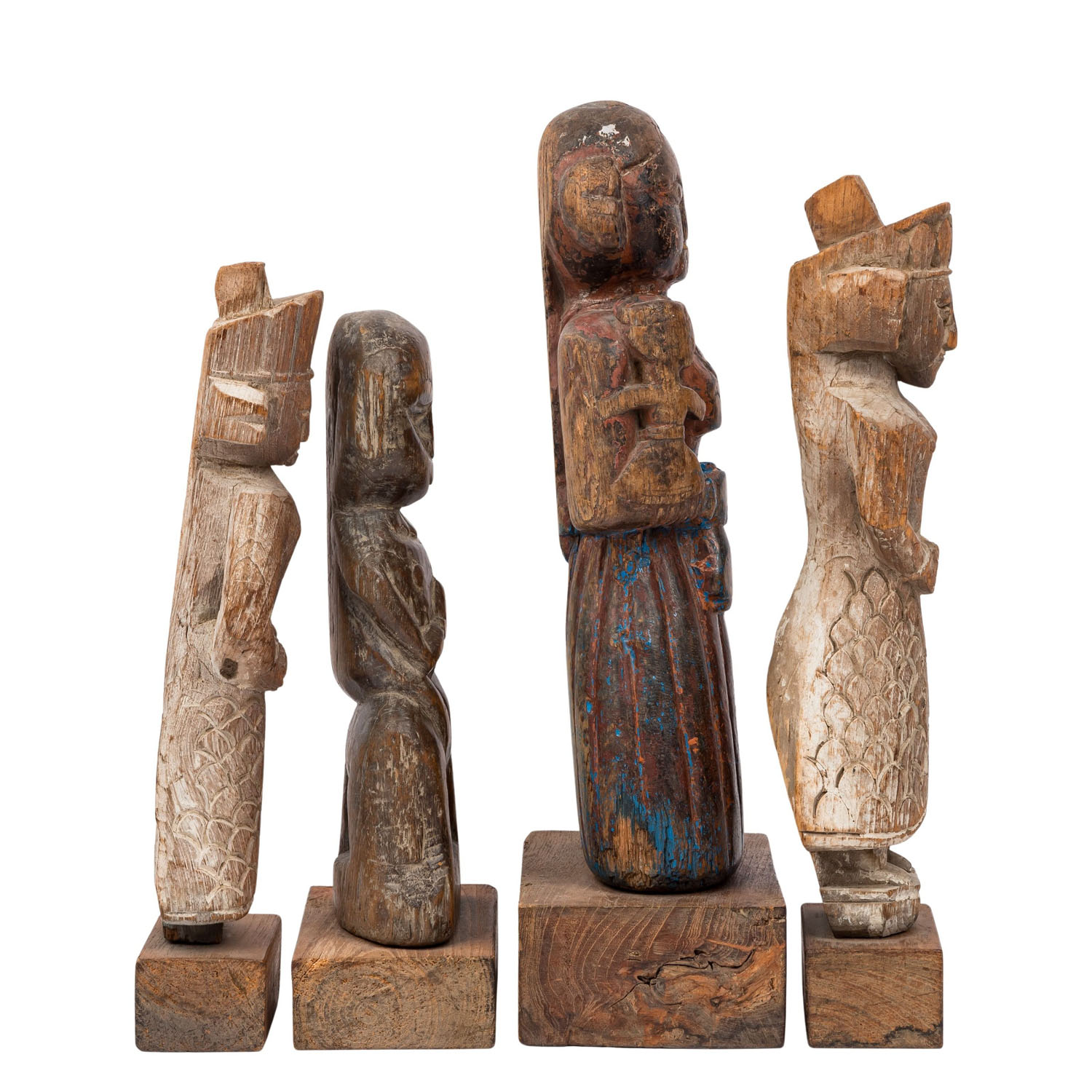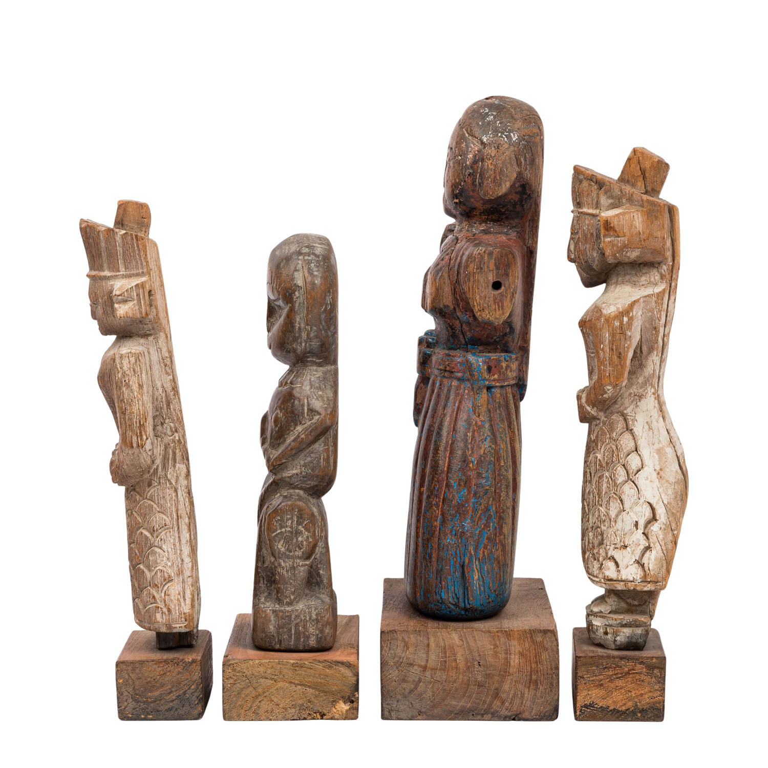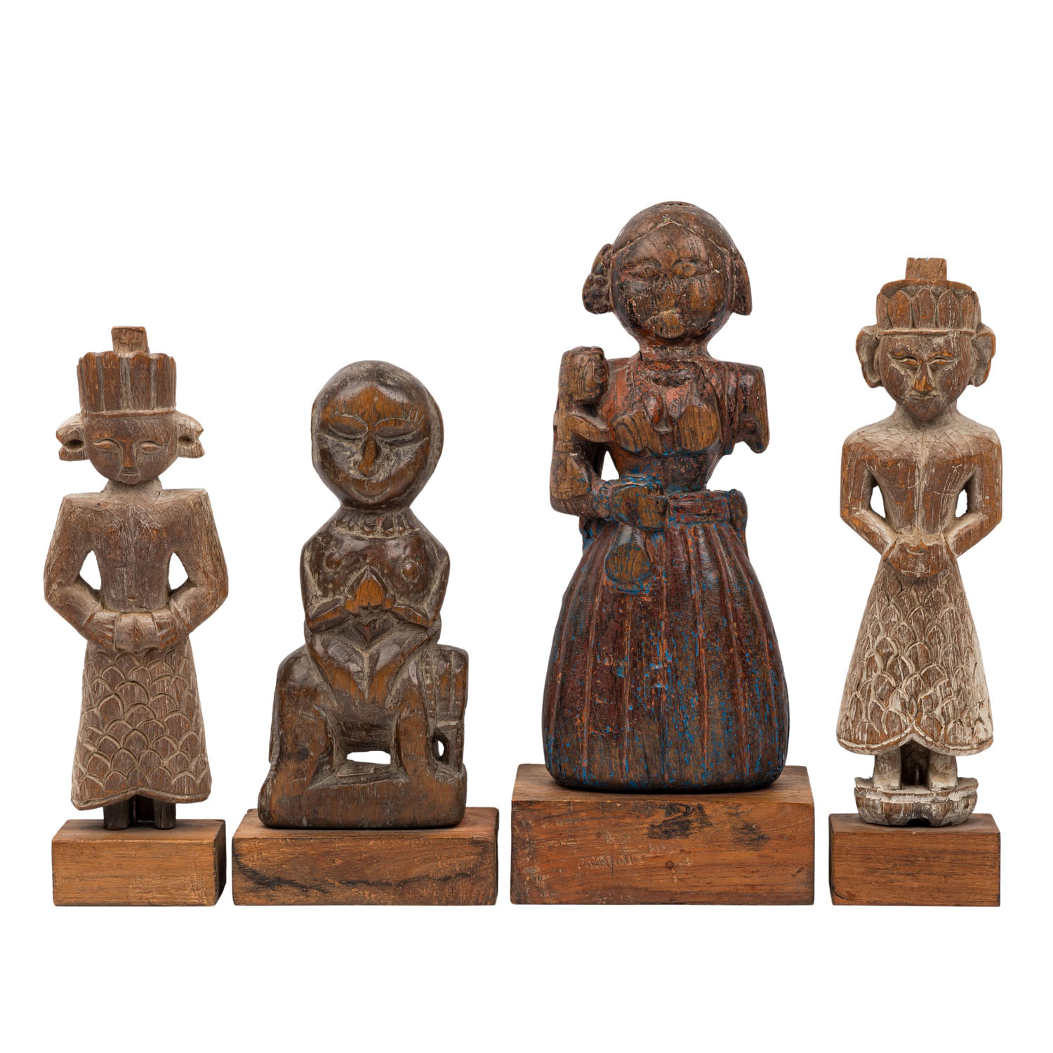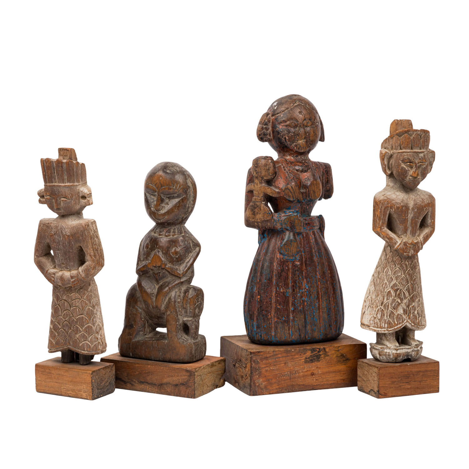 4 wooden statuettes. NORTH INDIA, circa 1800: 1.) Figure sitting sideways on the back of an elephant, H: 24 cm (27 cm with rectangular wooden base).