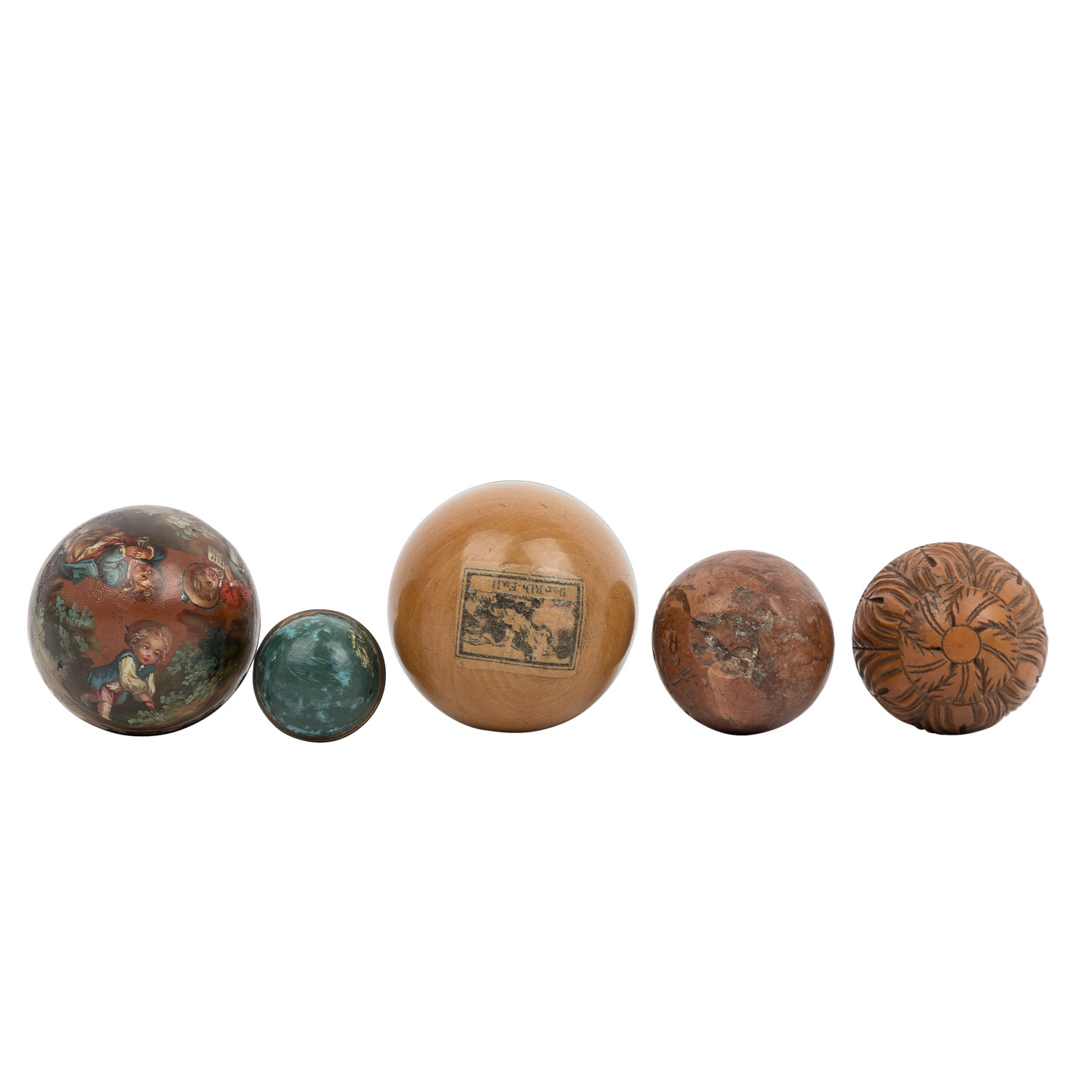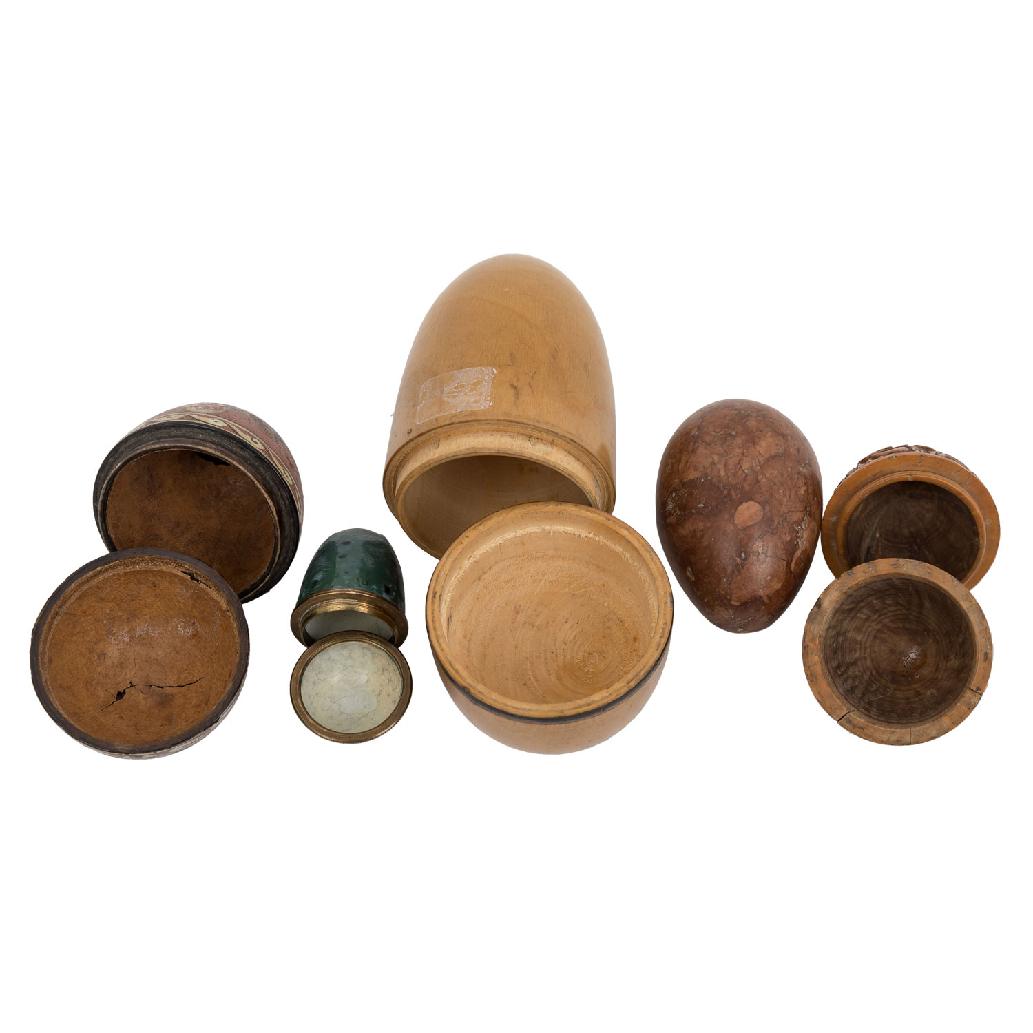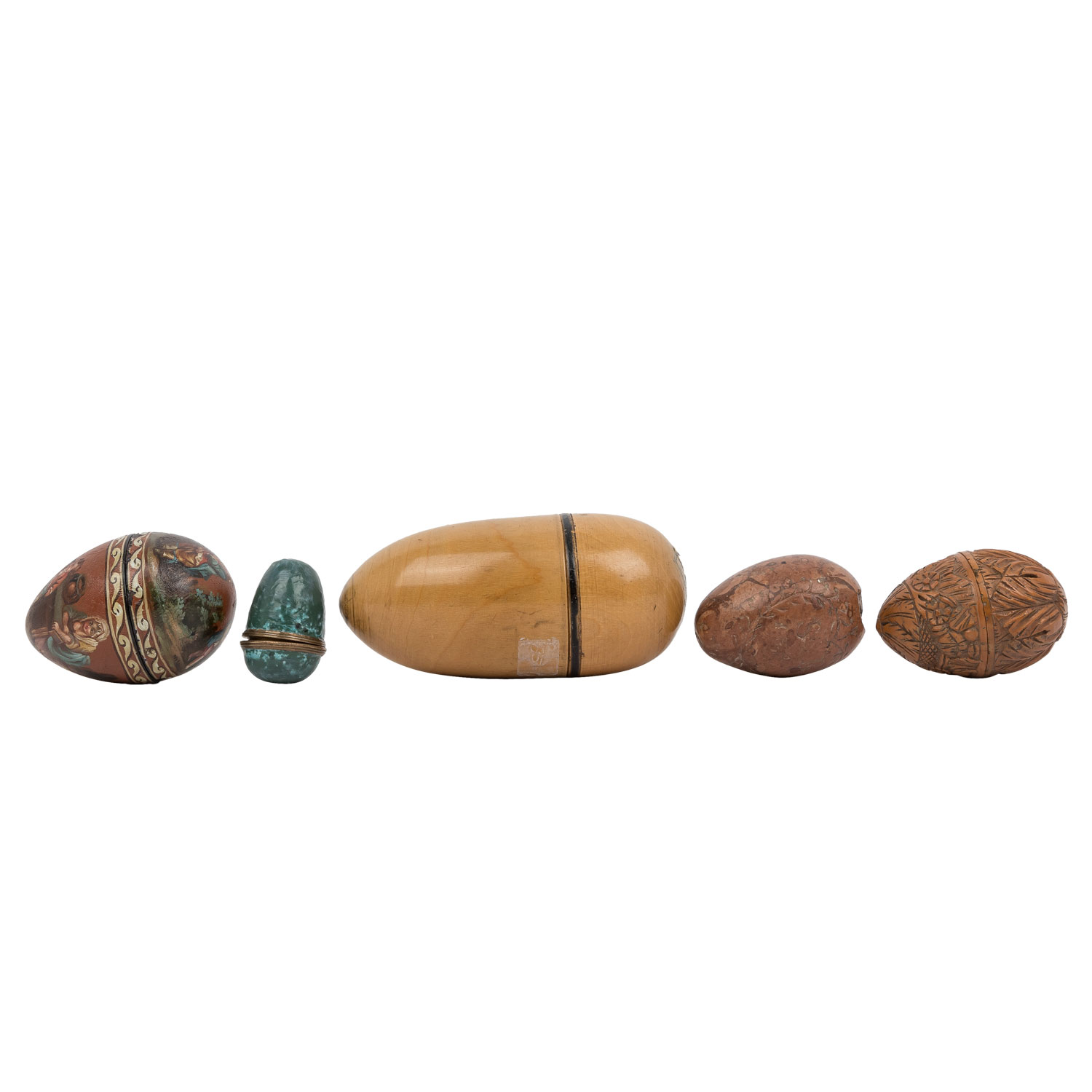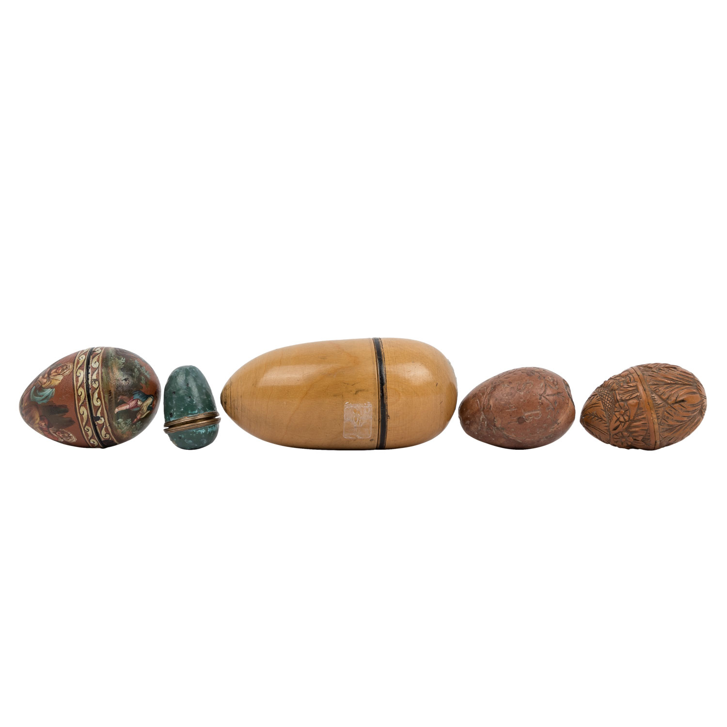 5-piece bundle of egg-shaped lidded boxes and ornamental eggs made of different materials, 19th century, consisting of a lidded box made of wood, finely painted all around with a figurative scene and relief decoration 'running dog', partly damaged (edges and tip), lined with leather on the inside, (brittle, missing parts.), H 6.5 cm; Boxwood egg box, H 6 cm; Beech egg box with two stickers of Czech sights ('Peterbaude' and 'Elb-Fall'), H 11 cm;