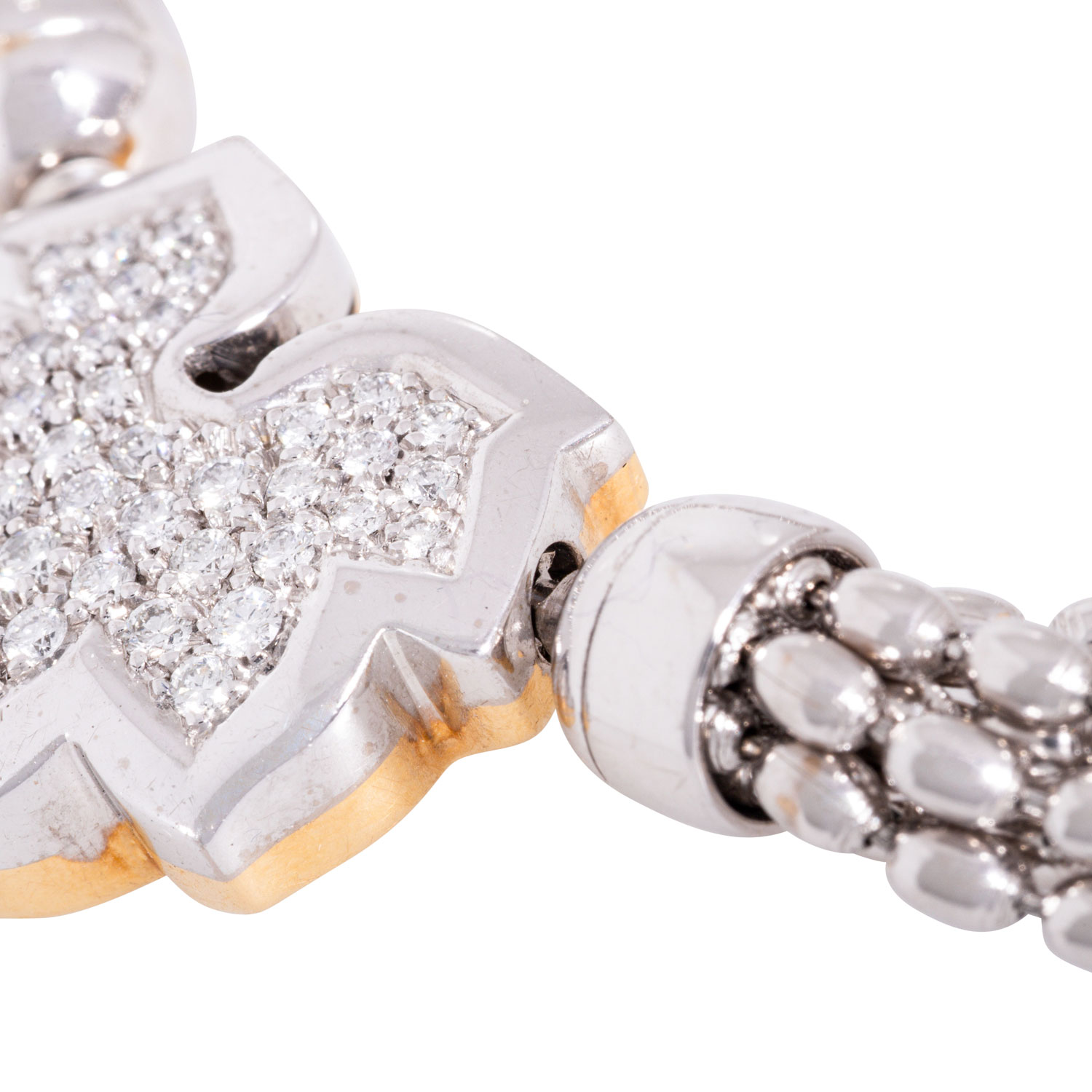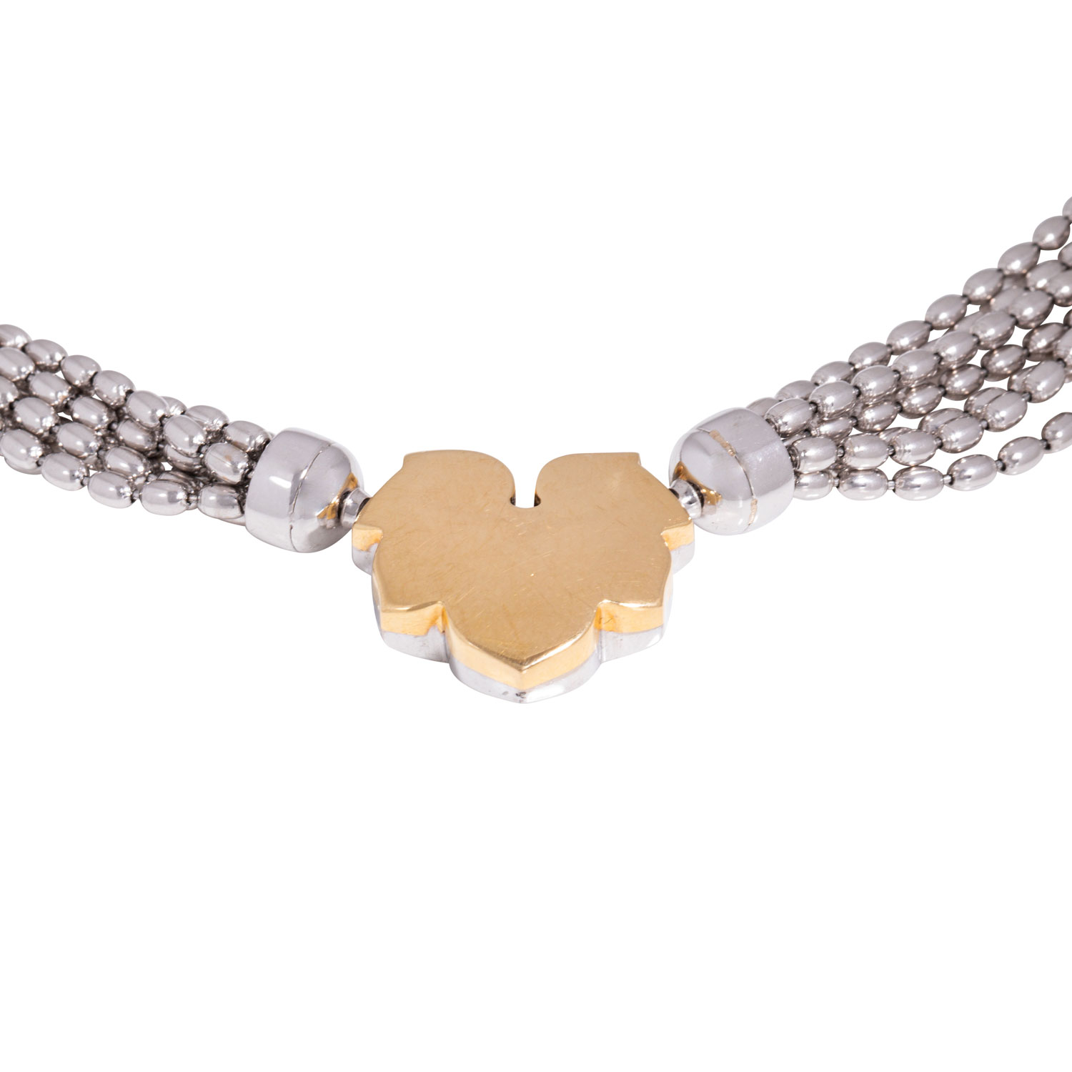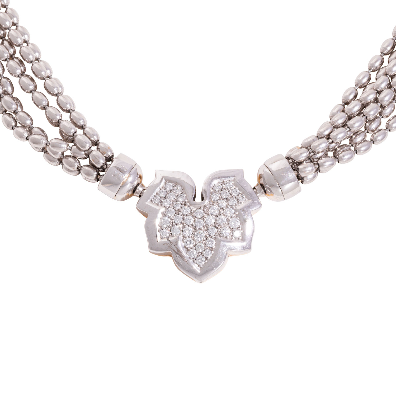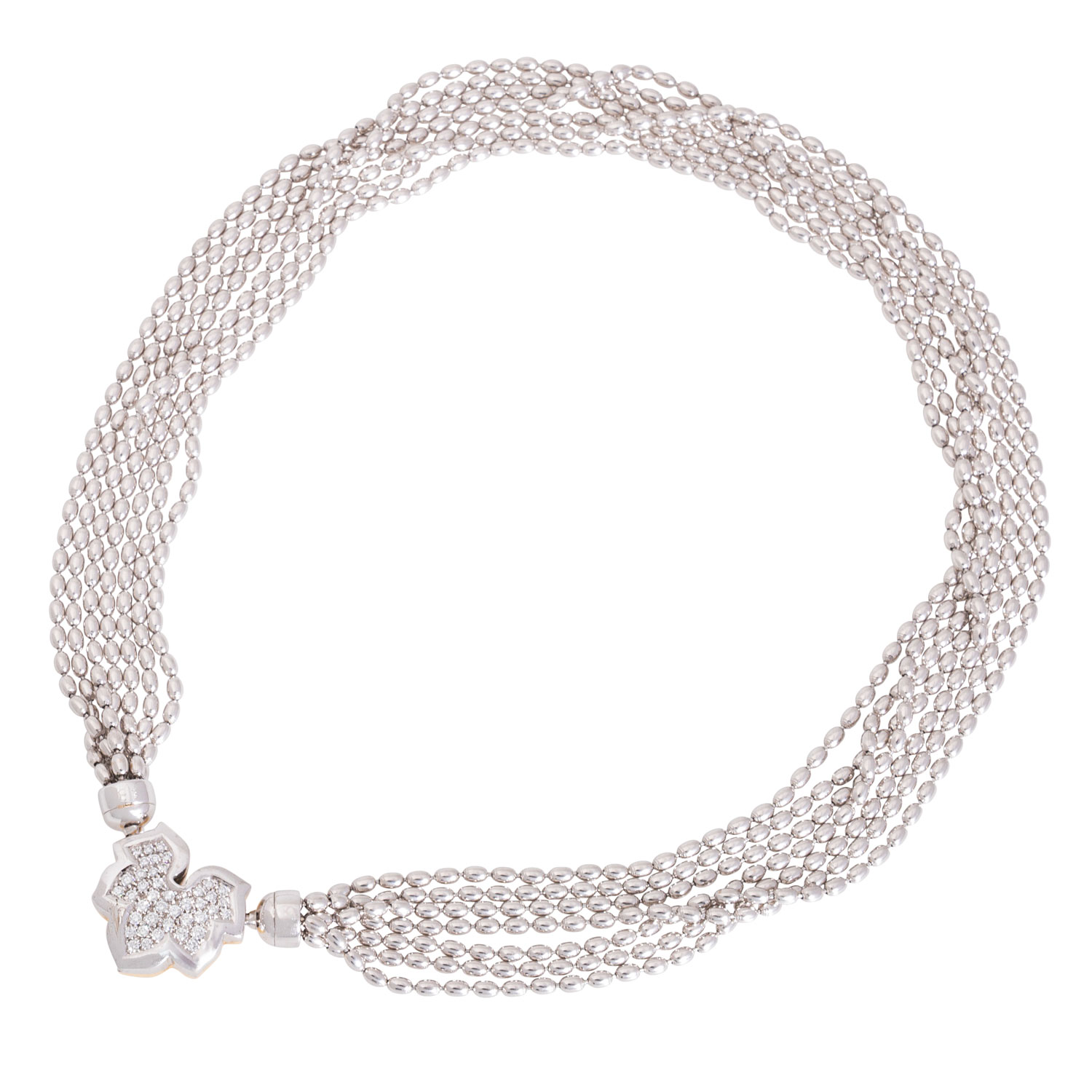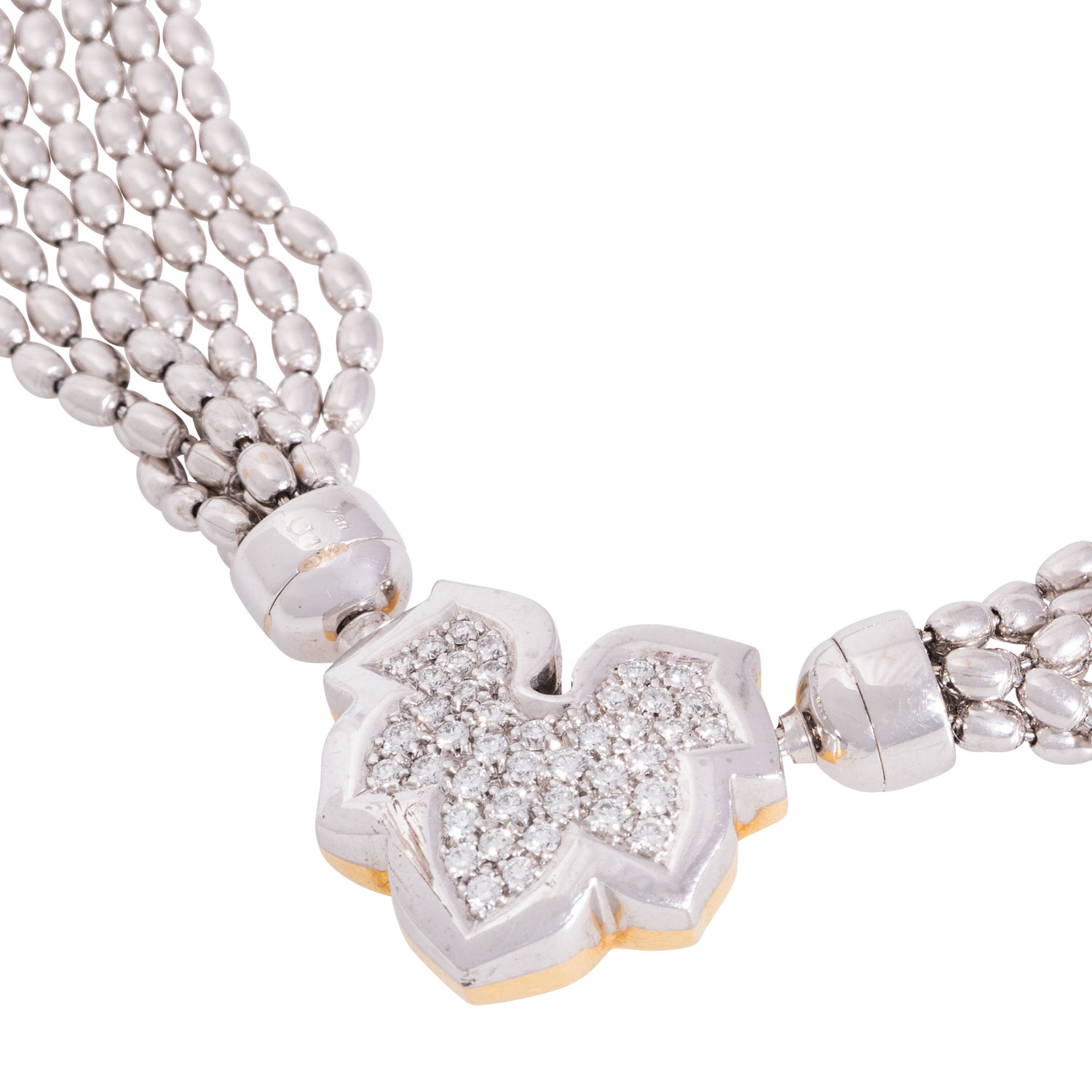 Necklace, 7 rows with interchangeable clasp 'maple leaf', brilliant-cut diamonds totalling ca. 0.6 ct, RW (G)/VVS, 18K white and yellow gold, L. ca. 42 cm, 20th/21st century, minor signs of wear, hallmarked in mechanical connection.