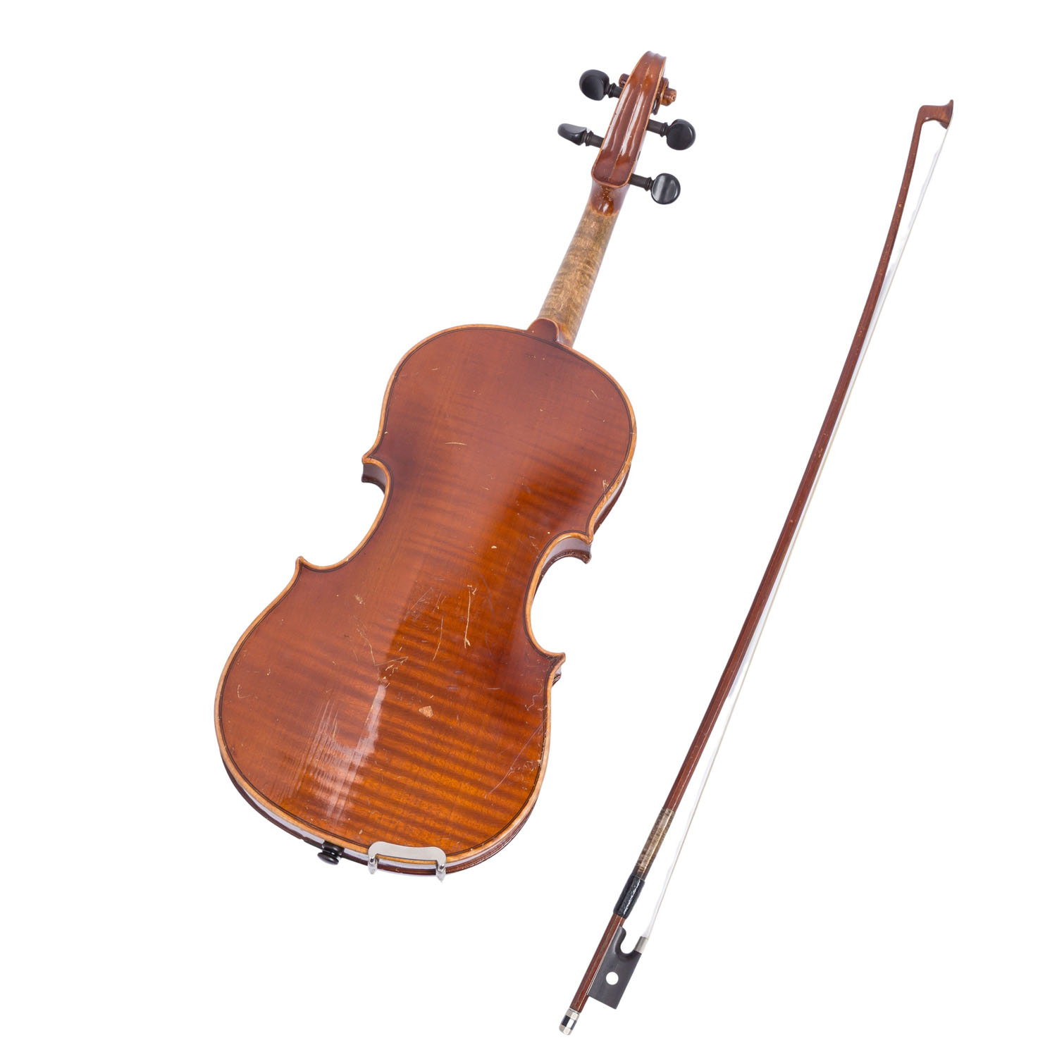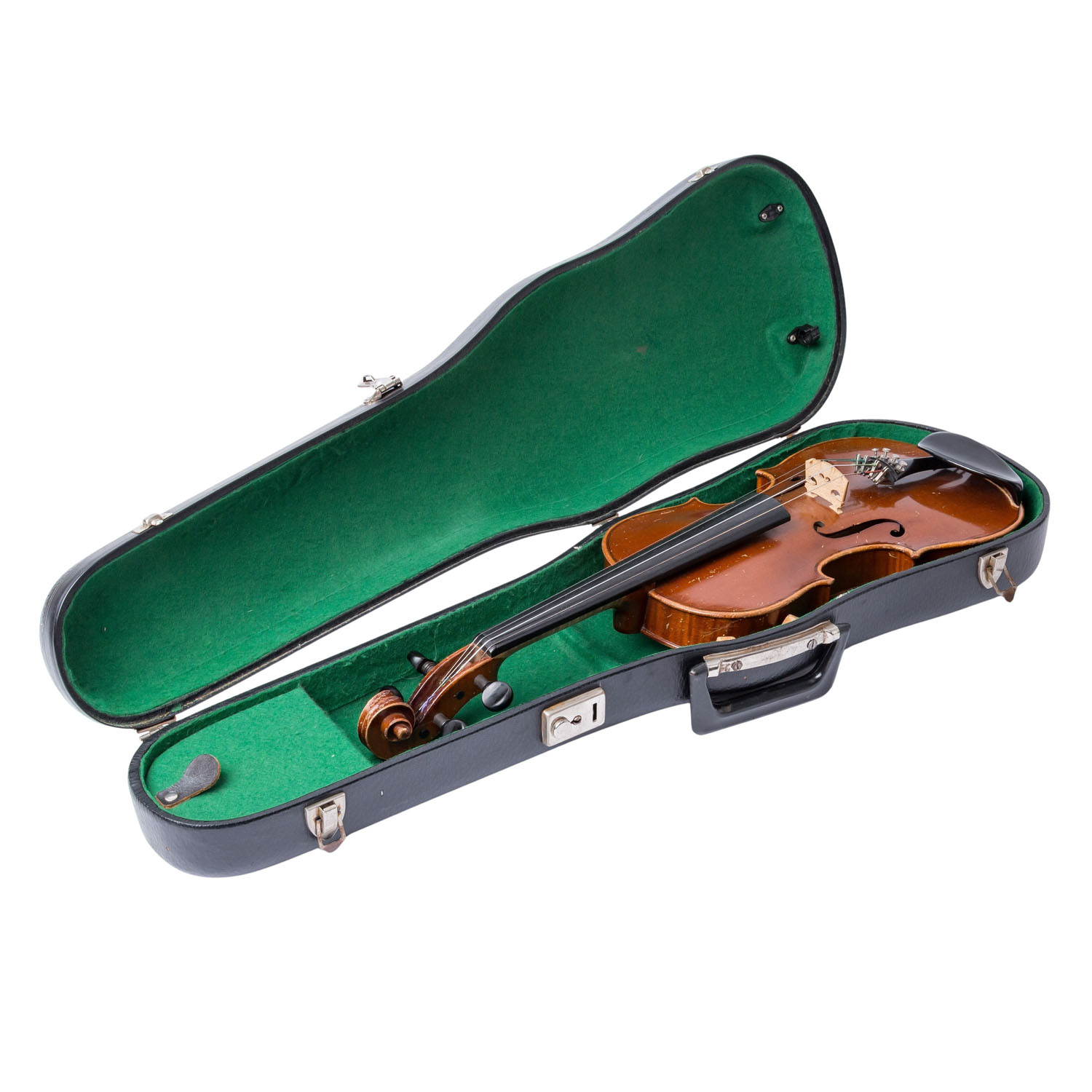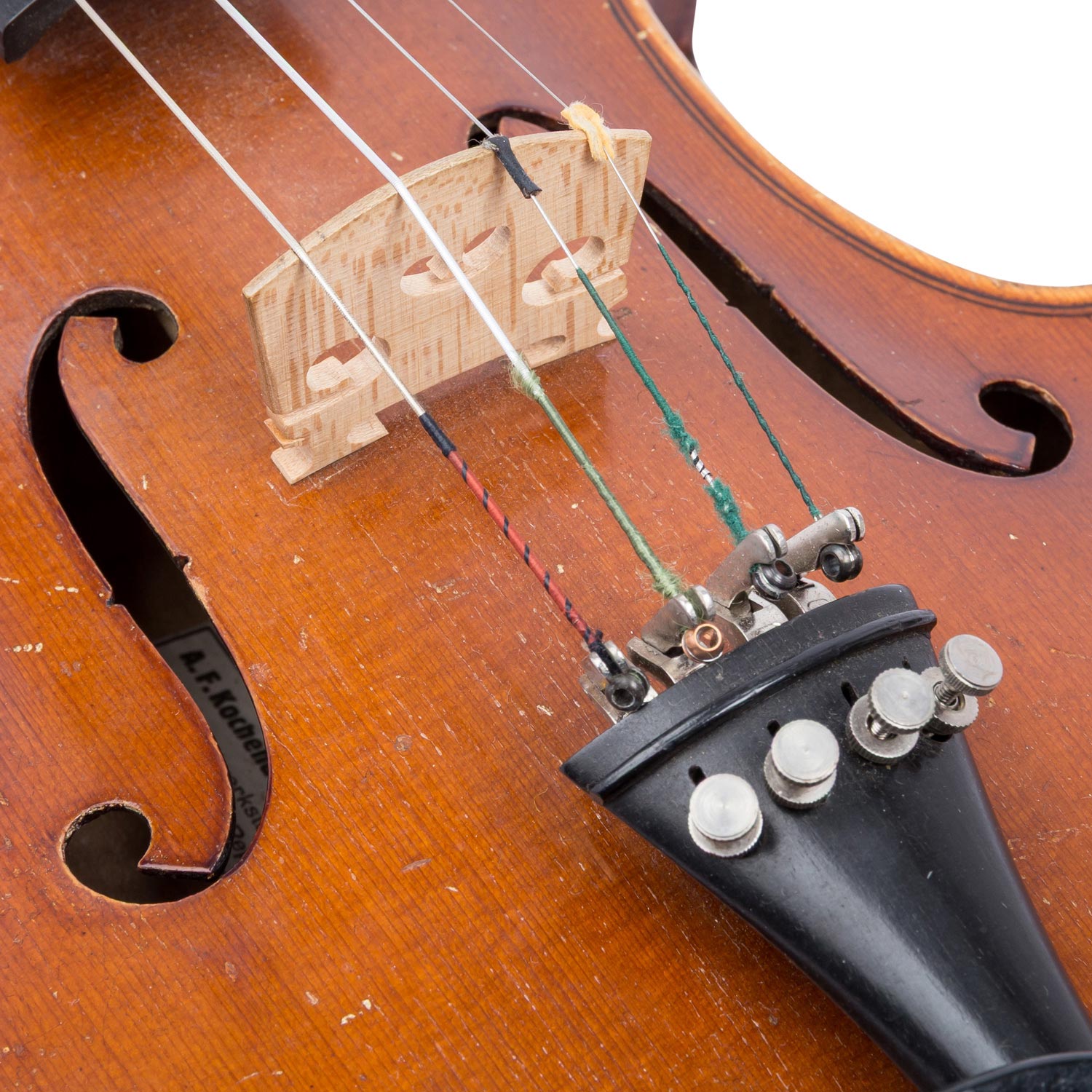 A. F. KOCHENDÖRFER, STUTTGART, 3/4 violin with bow in case, 20th century, the violin with maker's label inside, l: ca. 56.5 cm; the bow l: ca. 67 cm. Signs of age and use and scratches, the violin: bridge replaced, the bow: the strings incomplete.