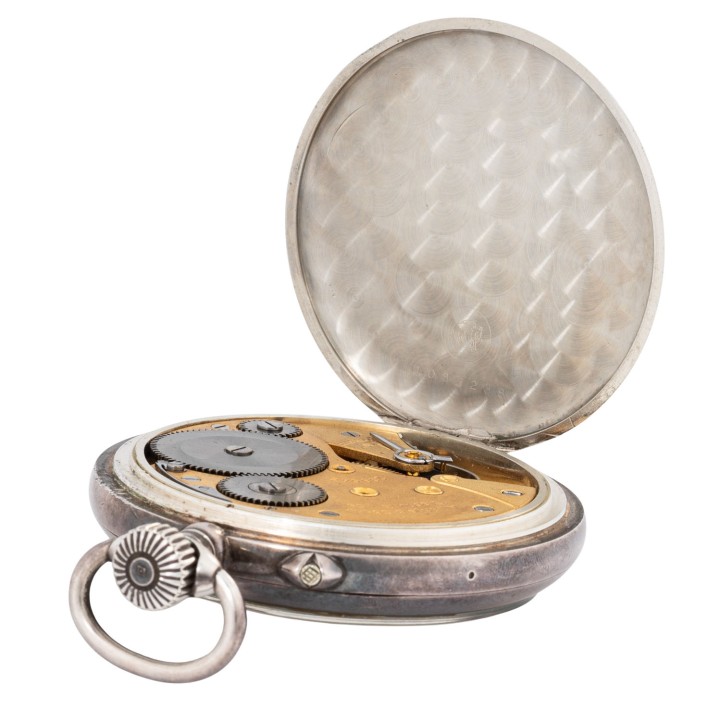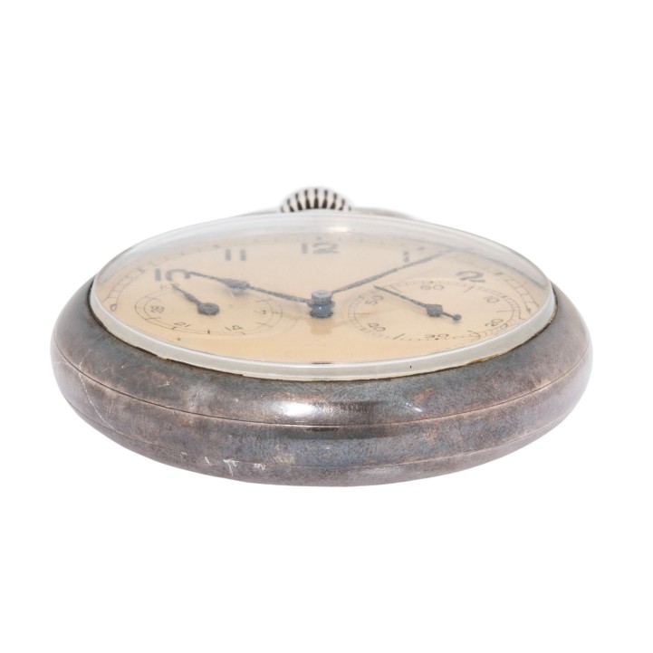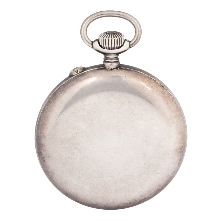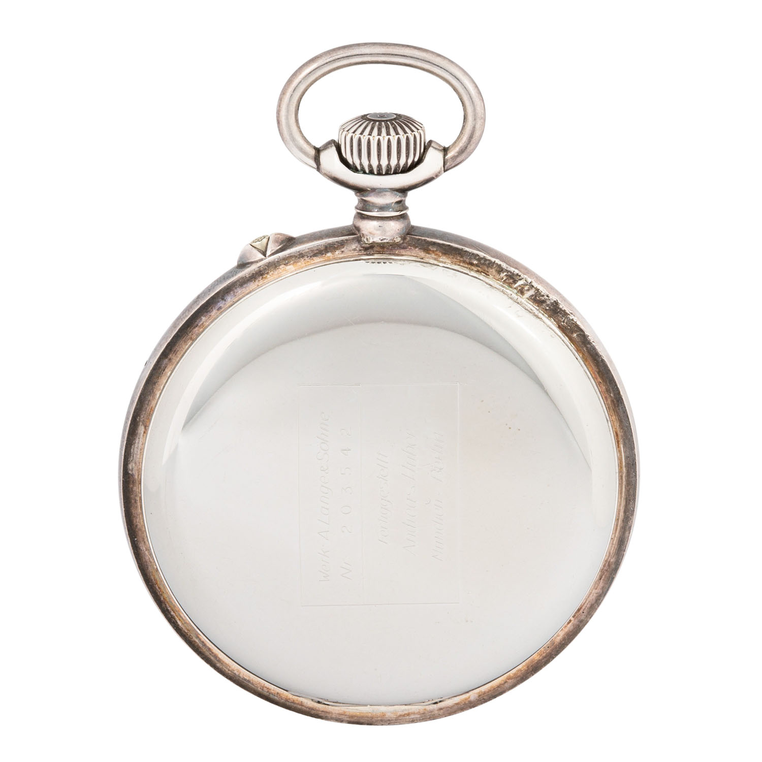 A. LANGE & SÖHNE / ANDREAS HUBER German Navy observation watch with power reserve indication , approx. 1940s. Silver-plated copper-nickel case. A. Lange & Söhne movement with bimetallic compensation balance, Breguet spring, fine adjustment, and 2/3 plate, power reserve up to 35 hours. Movement number 203542. Good working order (+4 s/d, 268° amplitude). Case signed A. Lange & Söhne, completed by Andreas Huber, Munich - Berlin. Case number on inner dust cover: 1085288; outer dust cover: 1084948. Ivory-colored dial with Arabic numerals, small seconds at 3 o'clock, power reserve indicator at 9 o'clock, blued Poire hands, and railroad minute track. Used condition with visible signs of wear, scuff marks on the hand mount of the power reserve indicator. Diameter approx. 60 mm measured without crown.