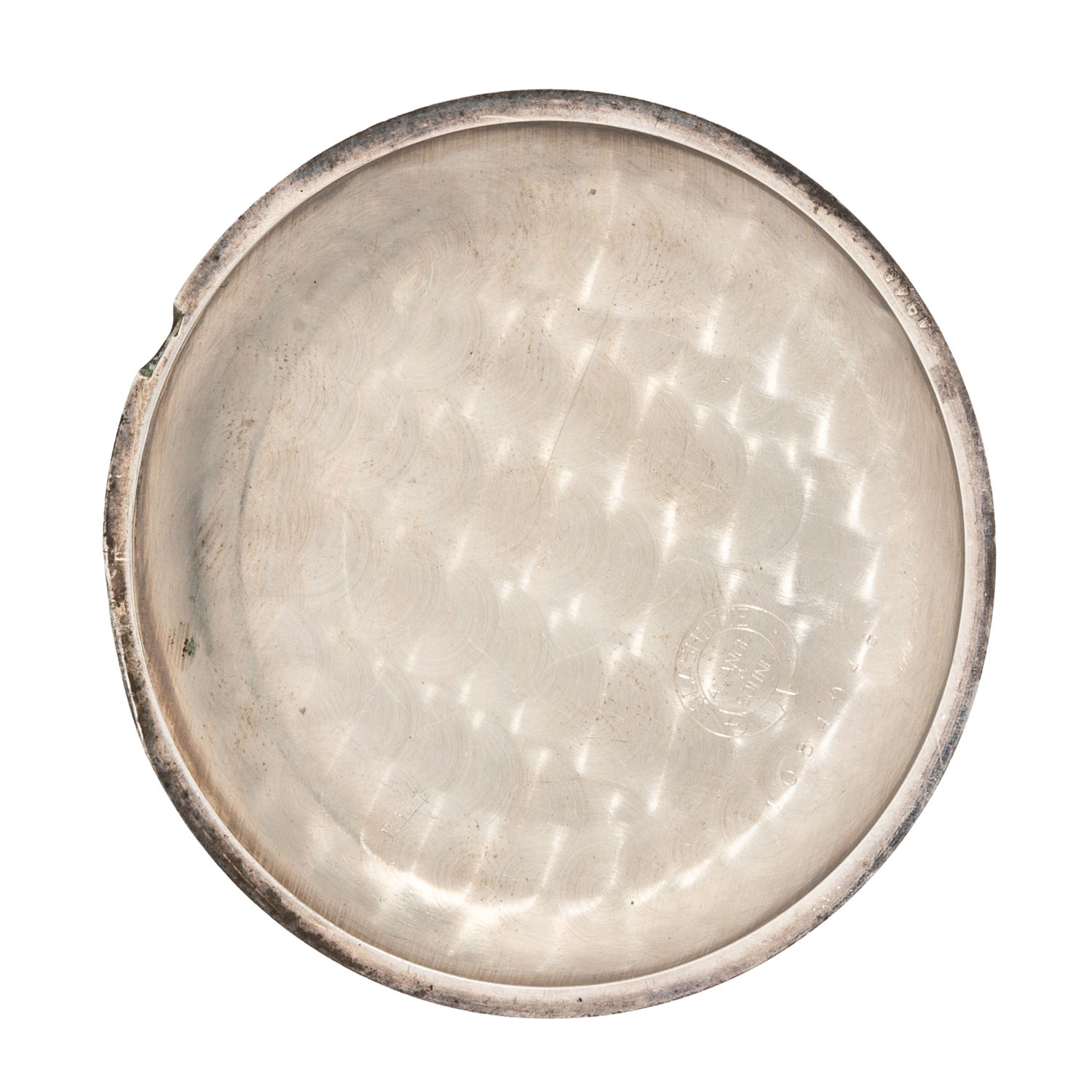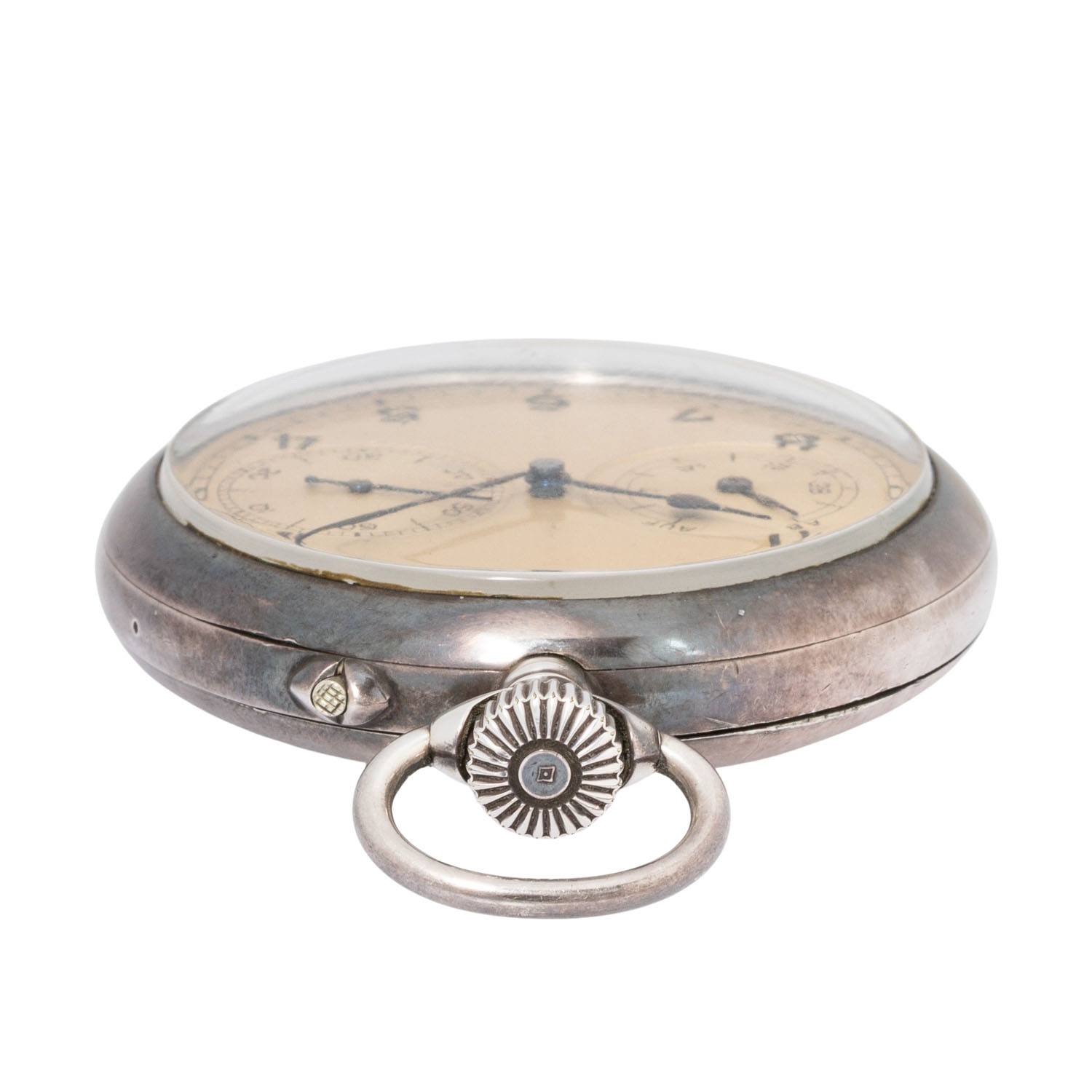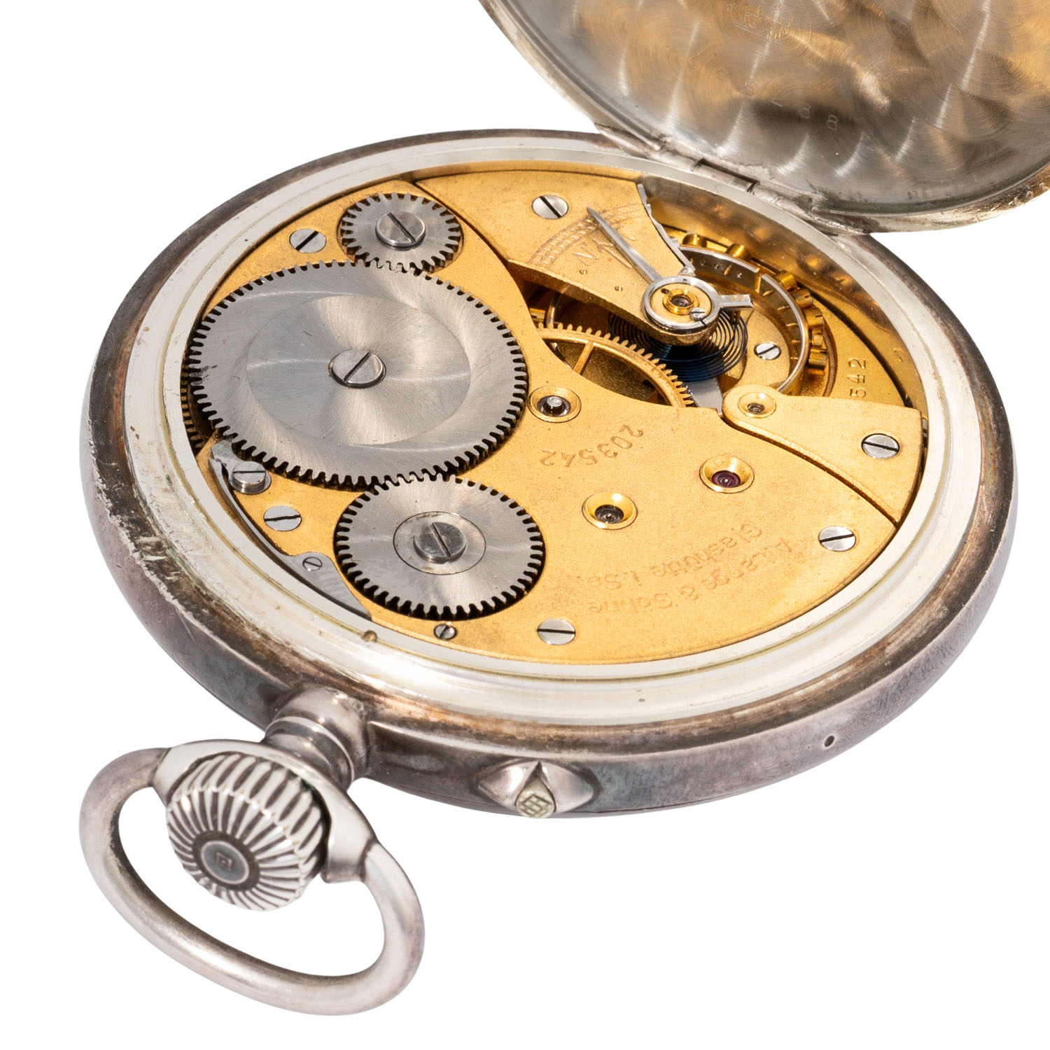 A. LANGE & SÖHNE / ANDREAS HUBER German Navy observation watch with power reserve indication , approx. 1940s. Silver-plated copper-nickel case. A. Lange & Söhne movement with bimetallic compensation balance, Breguet spring, fine adjustment, and 2/3 plate, power reserve up to 35 hours. Movement number 203542. Good working order (+4 s/d, 268° amplitude). Case signed A. Lange & Söhne, completed by Andreas Huber, Munich - Berlin. Case number on inner dust cover: 1085288; outer dust cover: 1084948. Ivory-colored dial with Arabic numerals, small seconds at 3 o'clock, power reserve indicator at 9 o'clock, blued Poire hands, and railroad minute track. Used condition with visible signs of wear, scuff marks on the hand mount of the power reserve indicator. Diameter approx. 60 mm measured without crown.