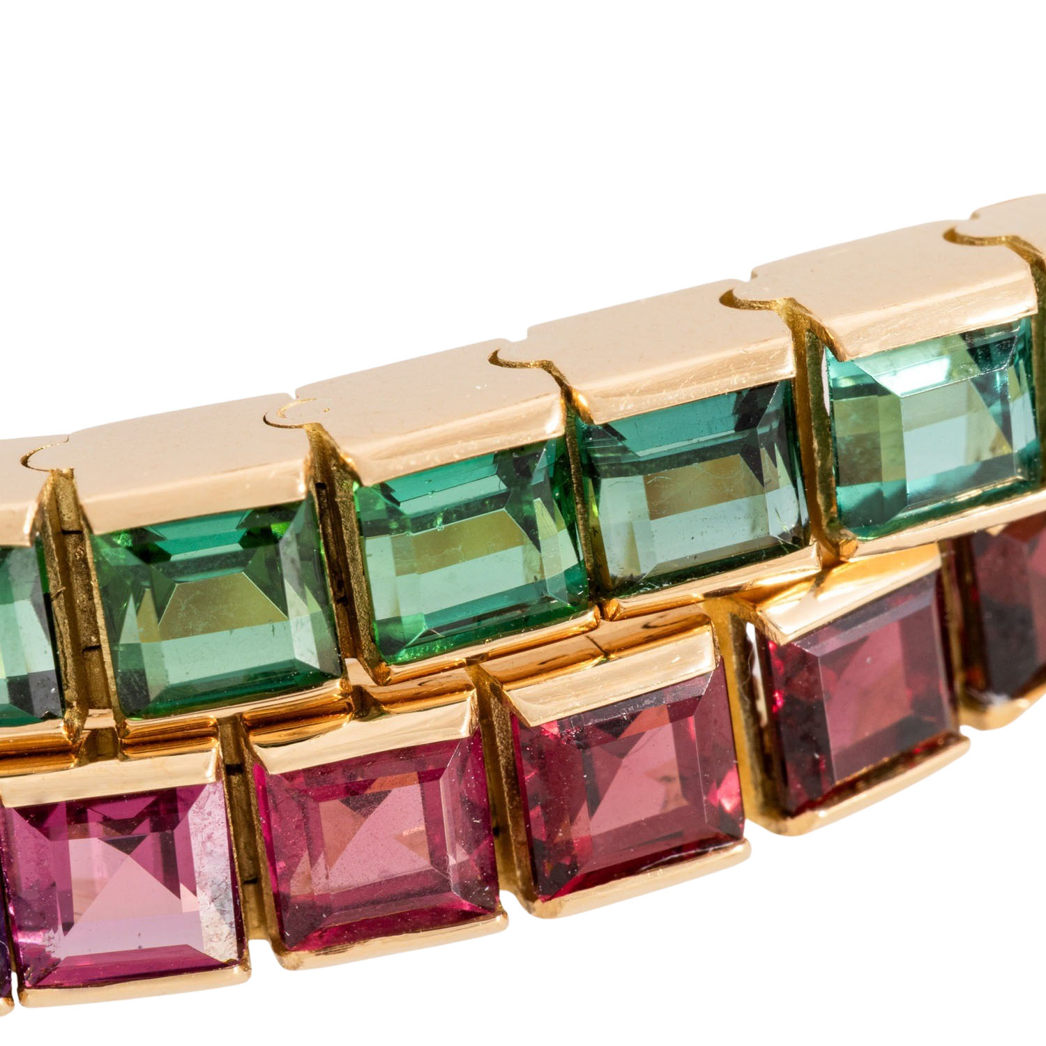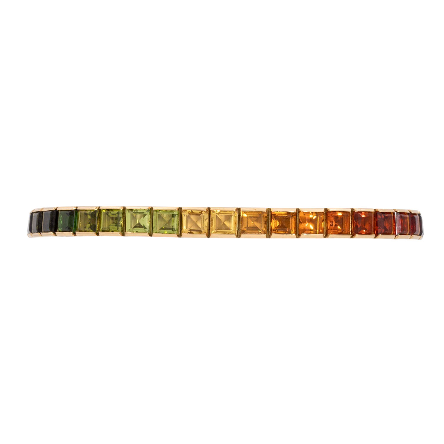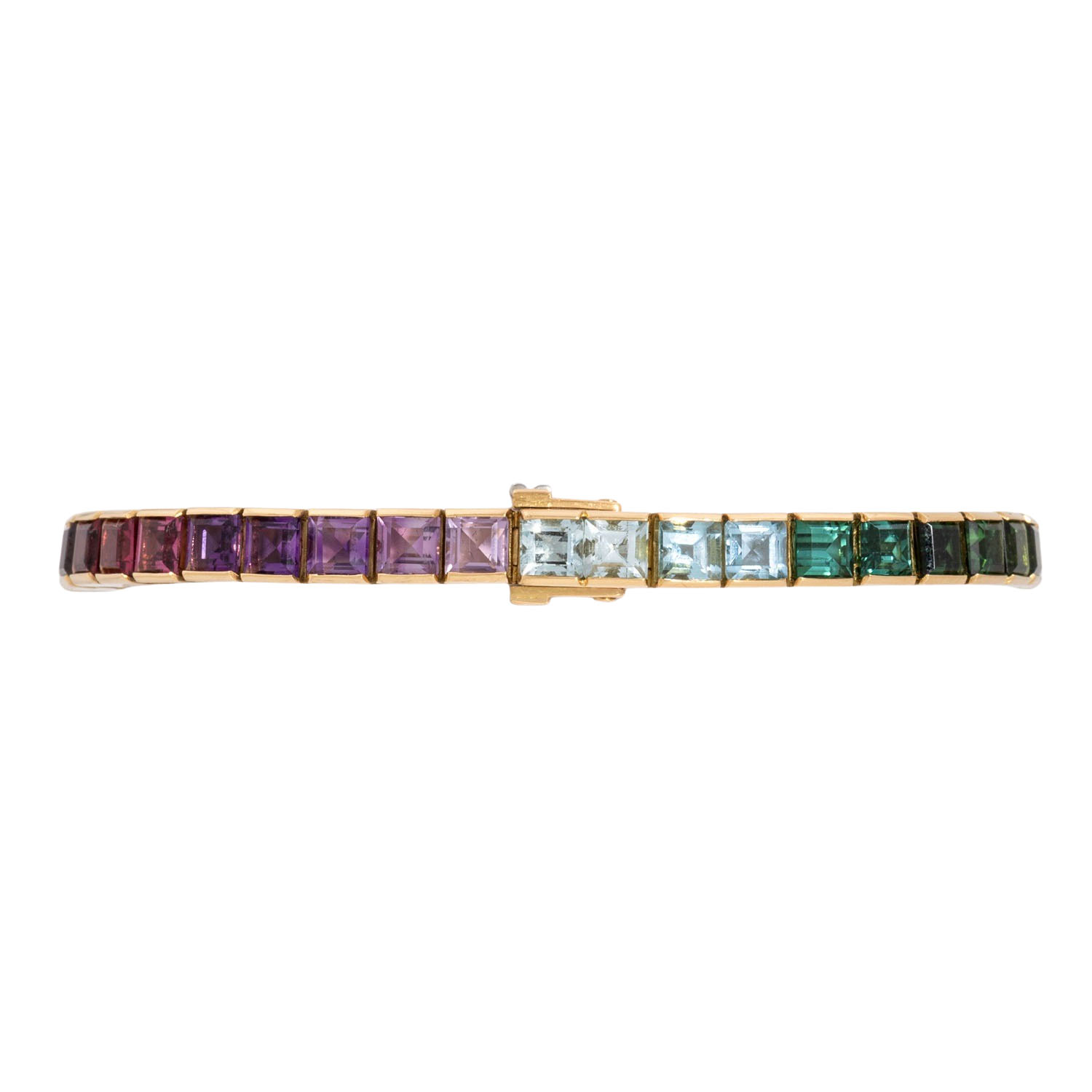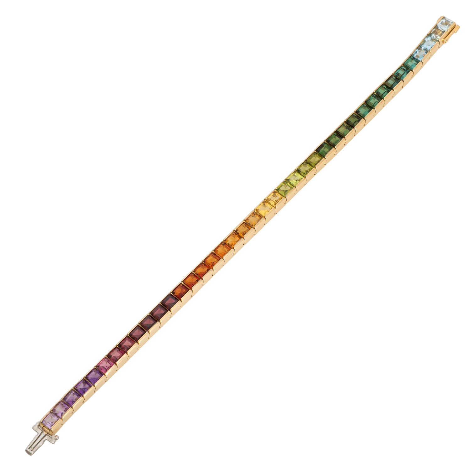 ADOLF MERATH bracelet set with 40 carré-cut gemstones: amthyst, garnet, citrine, peridot, tourmaline, topaz, each approx. 4.5 x 4.5 mm, 18K YG, 35.2 g, lenght: approx. 19 cm, 20th/21st century, single gemstones minimally abraded, maker's mark.