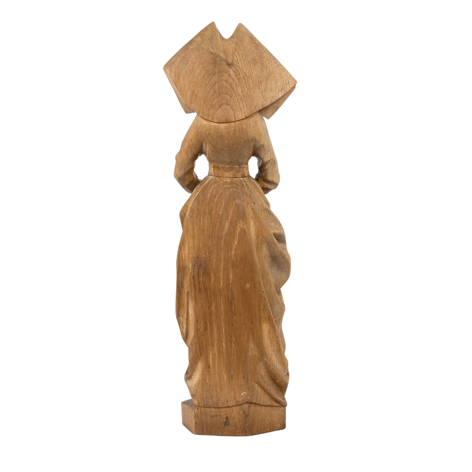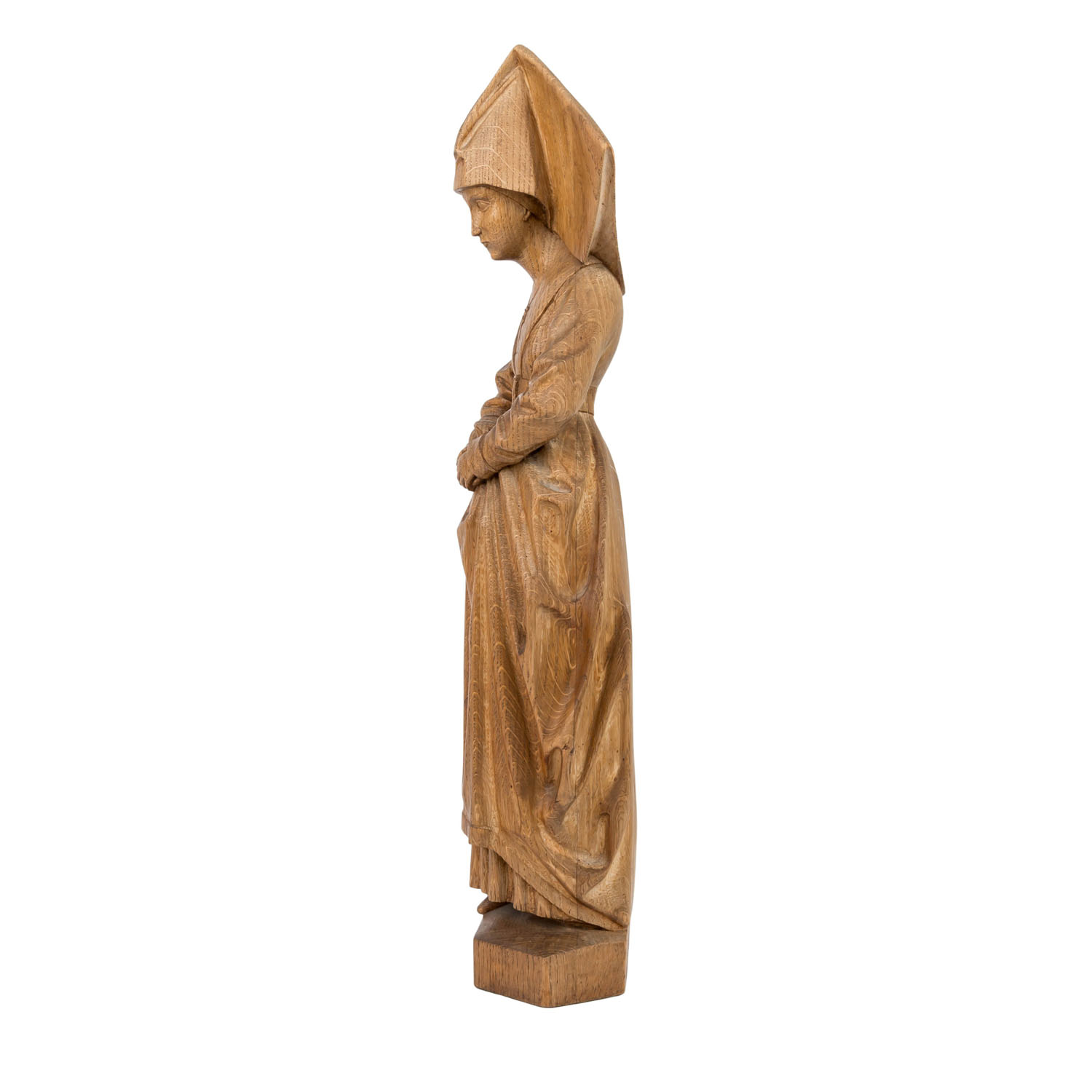Early 20th century, oak wood, carved depiction of the Burgundian princess in a long dress and hood, hands crossed in front of her stomach, on an irregular, hexagonal faceted plinth, h: 61 cm. Mostly in fine condition with part. Some wear.