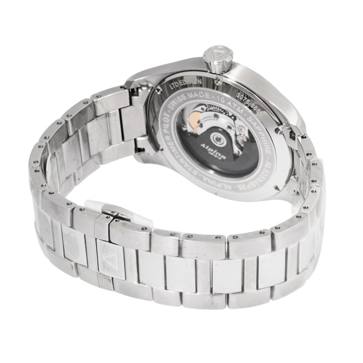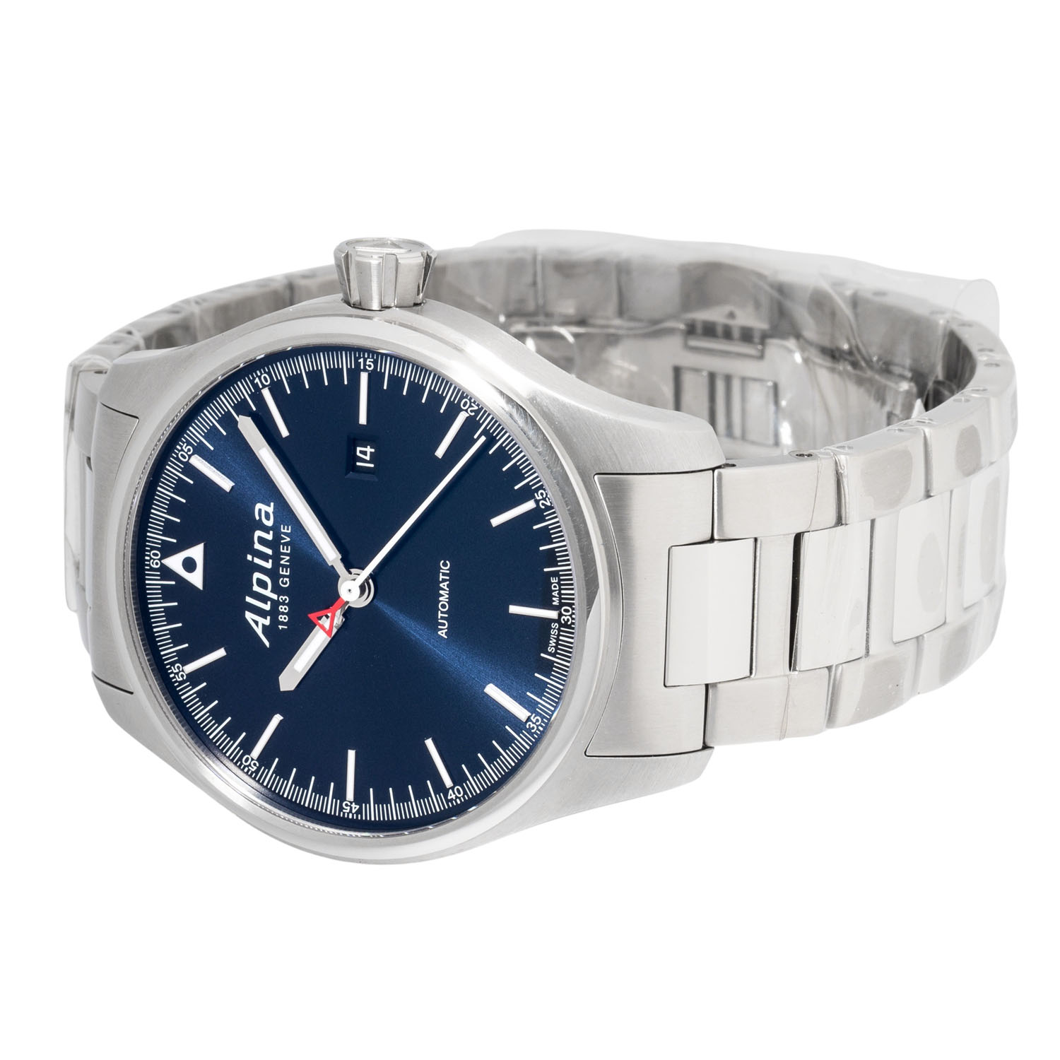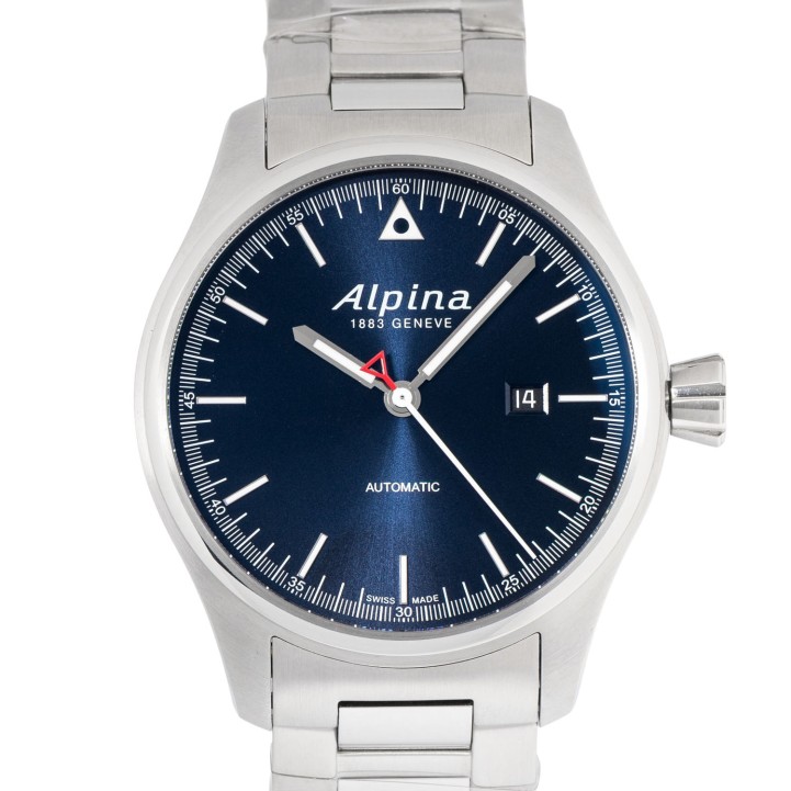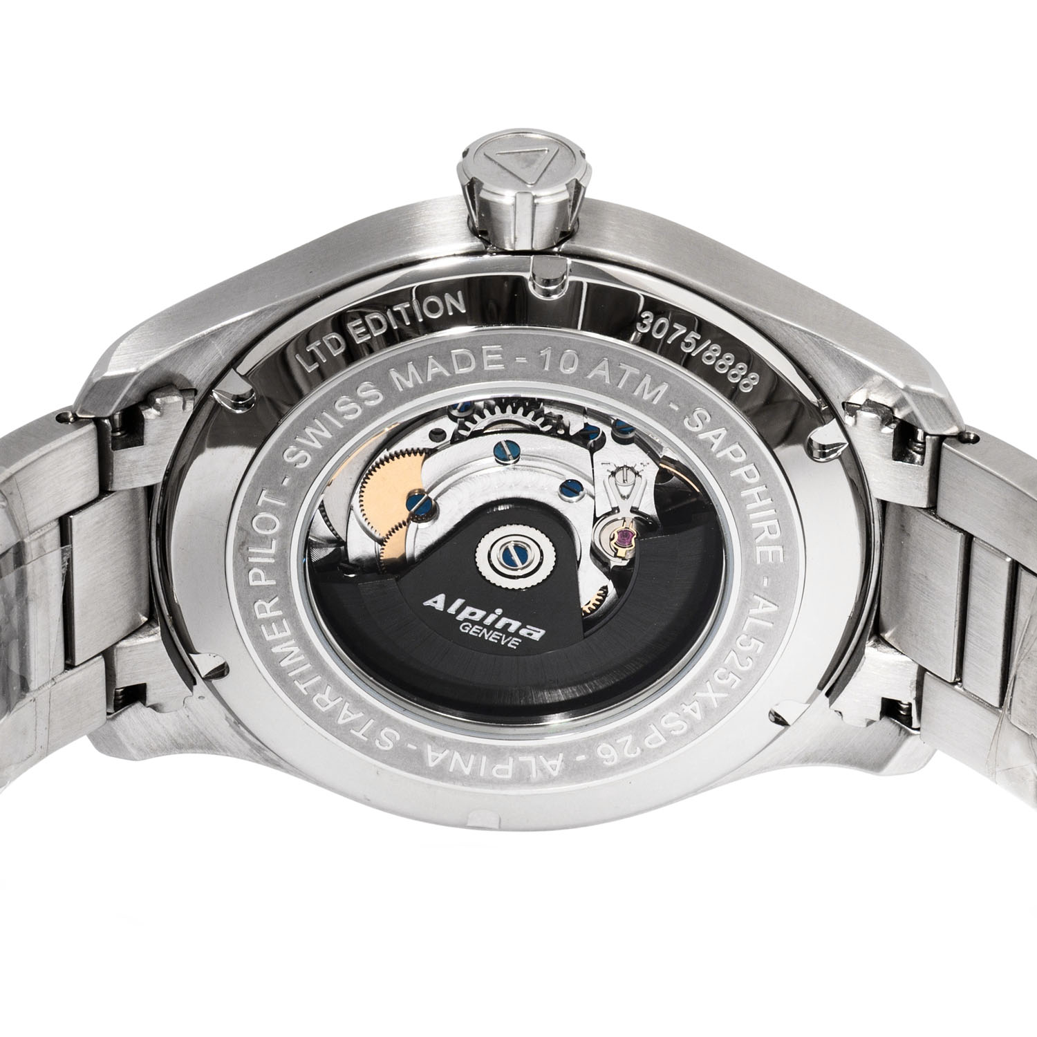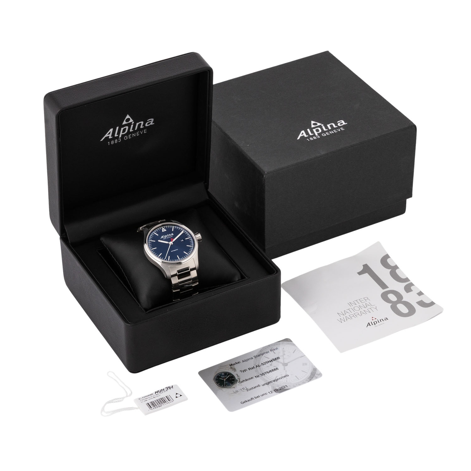 ALPINA Startimer Pilot Ref. AL-525N4S6B 'Limited Edition' men's watch from 2021. NEW & UNWORN. Box and papers. Stainless steel. Glass back. Limited edition No. 3075 of 8888 pieces. Automatic movement Cal. AL-525 with very good performance (+1 s/d. 285° amplitude). Blue dial with applied indices and date display. Alpina stainless steel bracelet (still taped) with folding clasp. New and unworn with minimal storage marks. Original box, hang tag, warranty booklet with certificate of authenticity and warranty card from purchase in October 2021 at jeweler Miquel in Teuschnitz. Diameter approx. 44 mm (measured without crown). Fits wrist sizes up to approx. 20.5 cm.