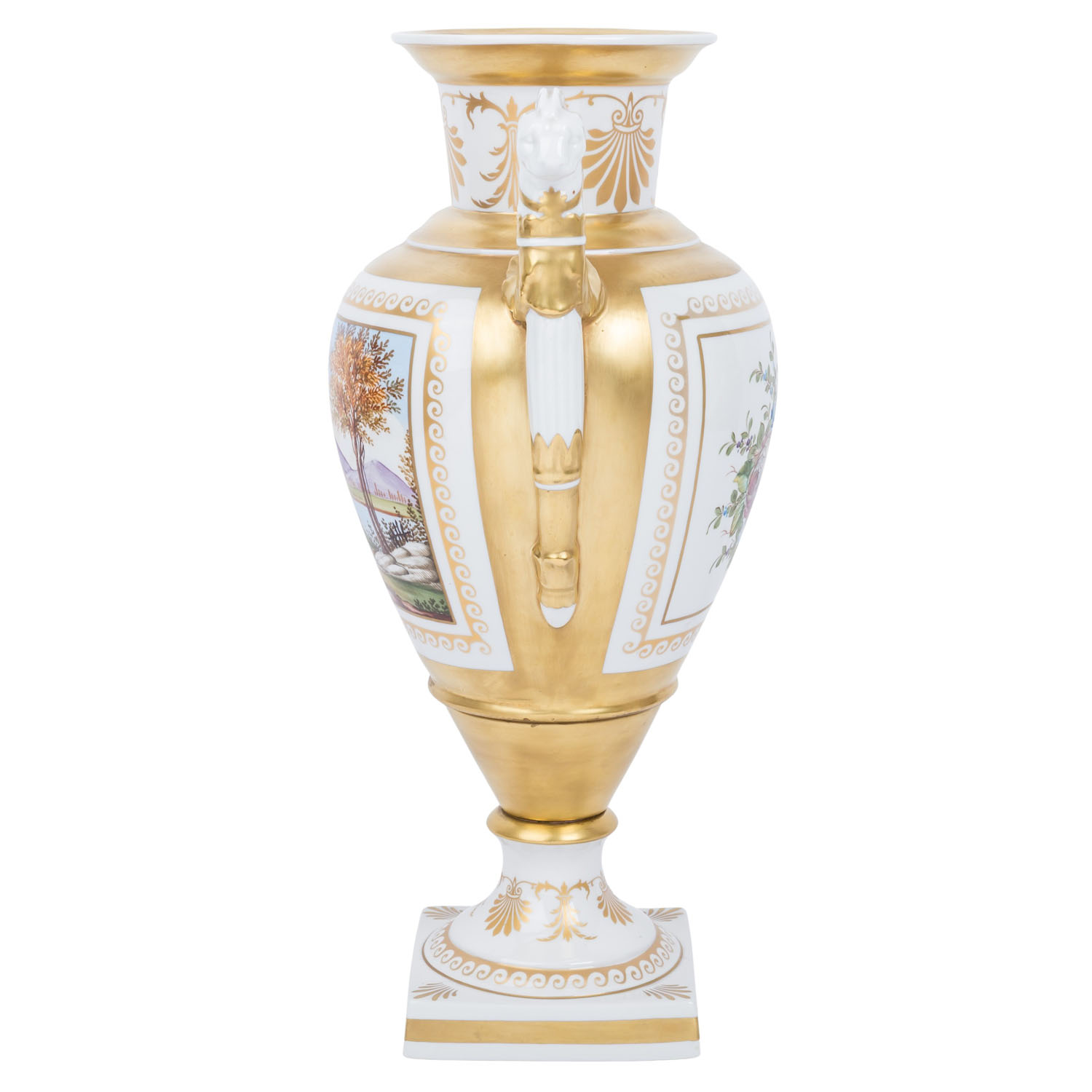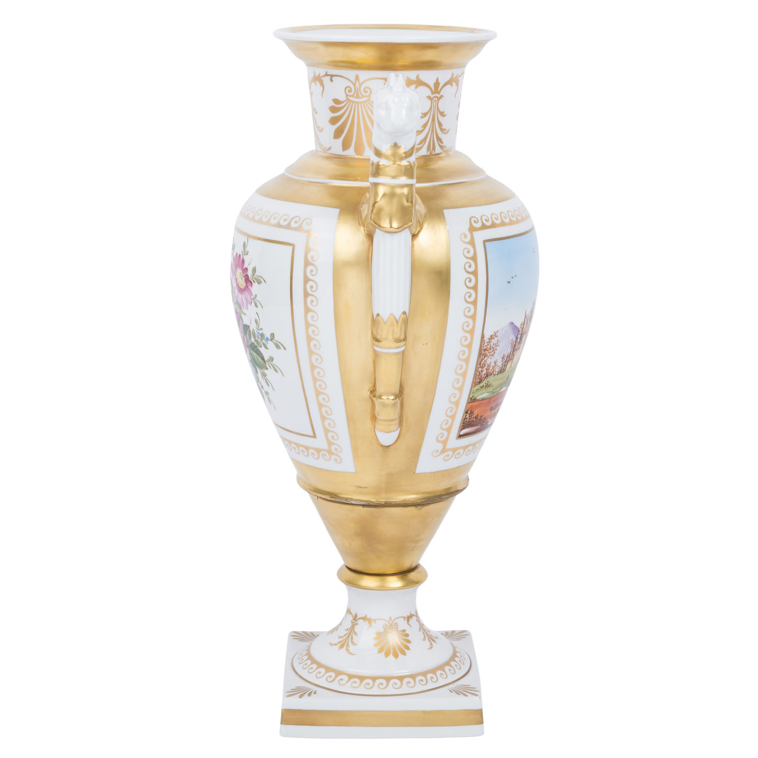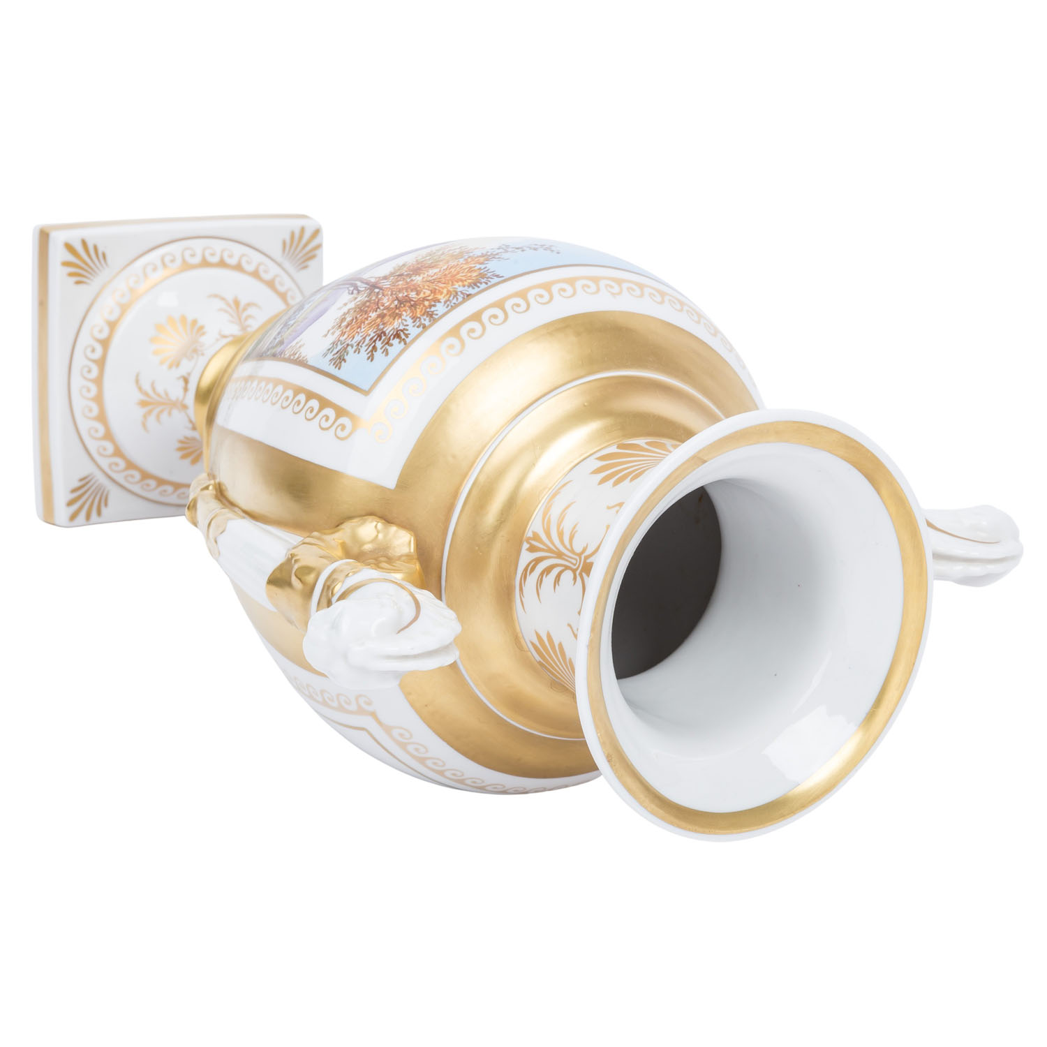 Sèvres style amphora vase, 20th century, baluster-shaped vase with a round base mounted on a square plinth, the front decorated with a landscape and floral bouquet, the side handles in the shape of lion heads, richly gilded (partially rubbed). The cap/screw is missing, creating a hole in the base. The blue mark bears the addition 'Model and decoration exclusive to the main' in red lettering. H 39.5 cm. Signs of age.